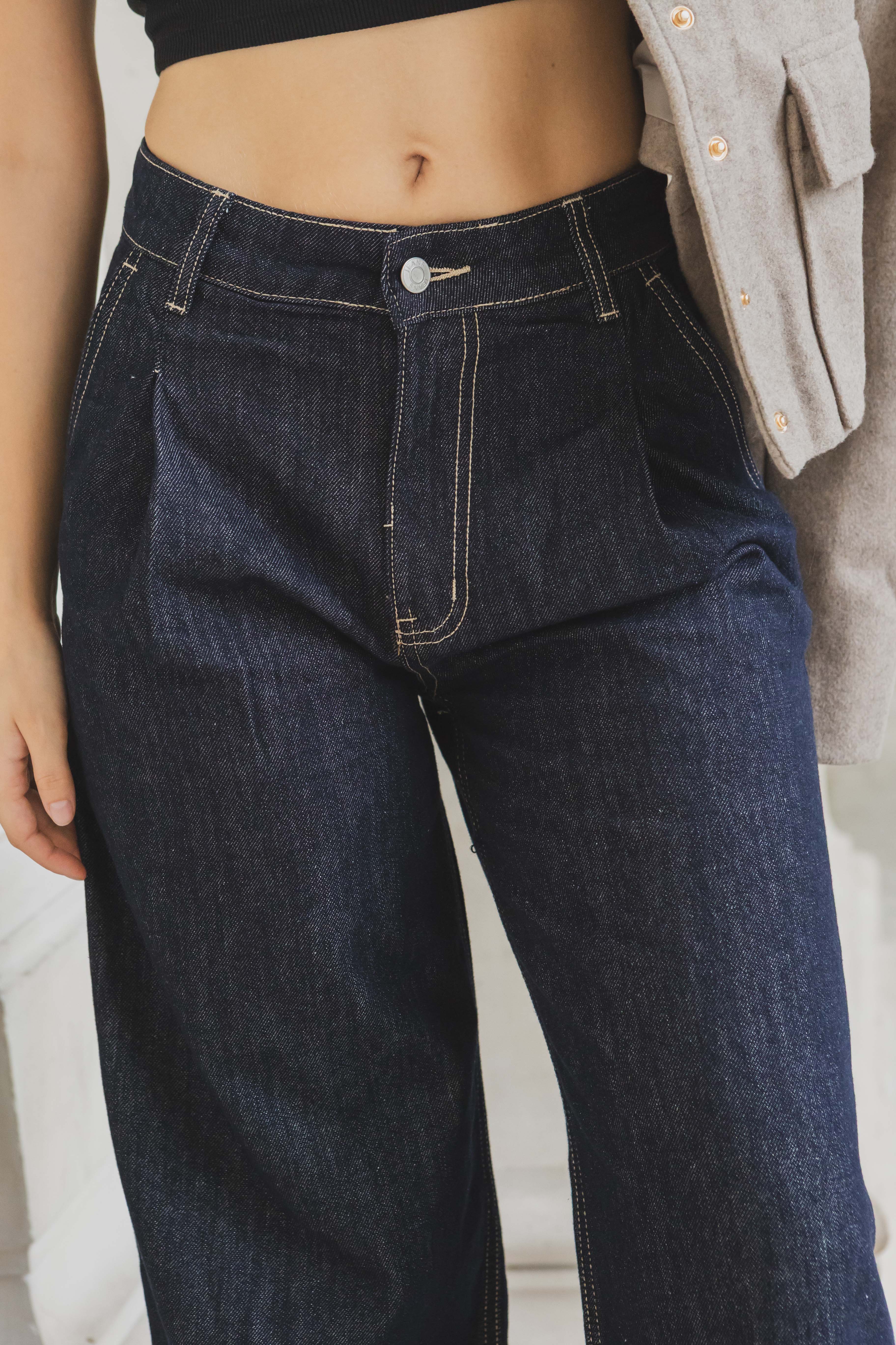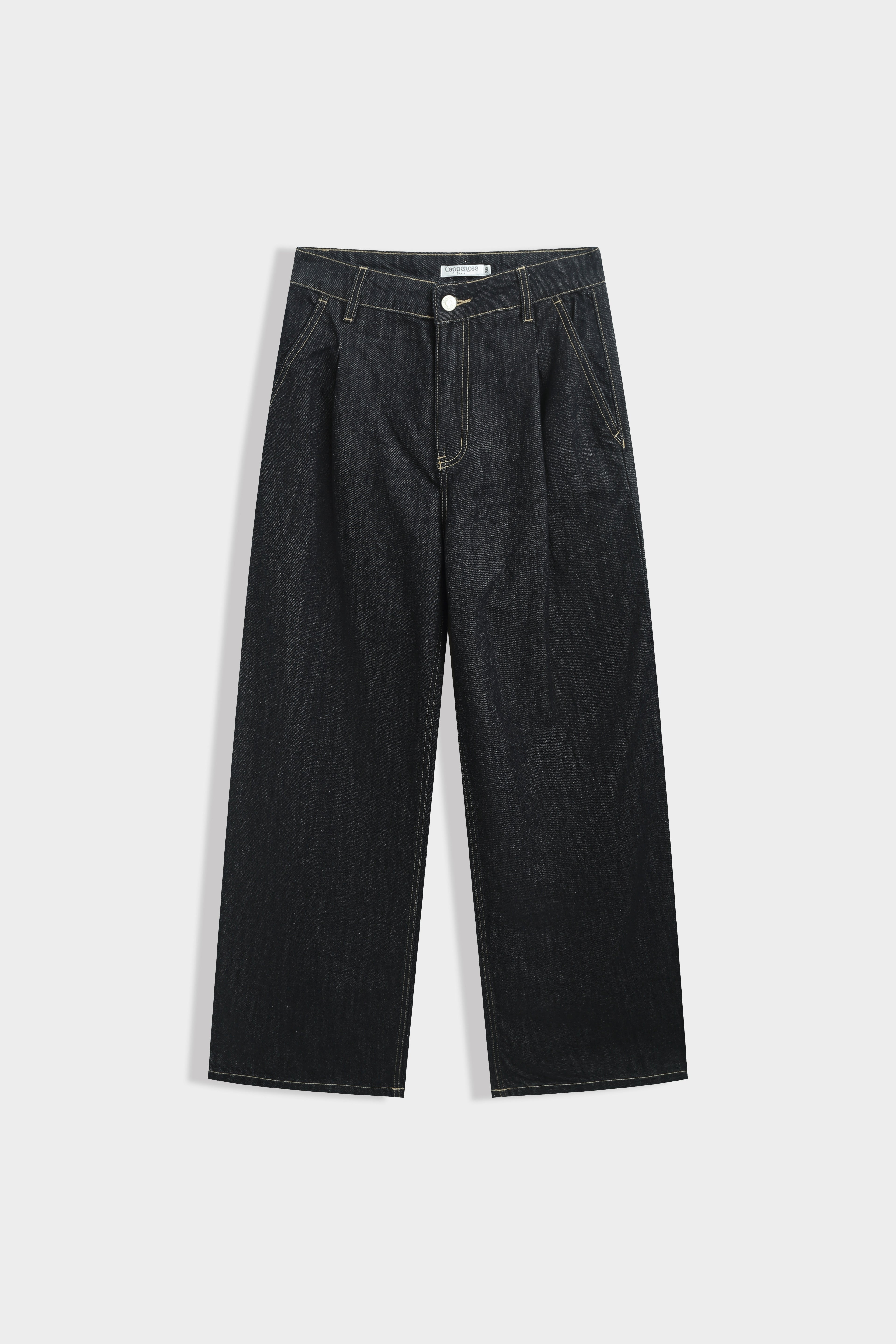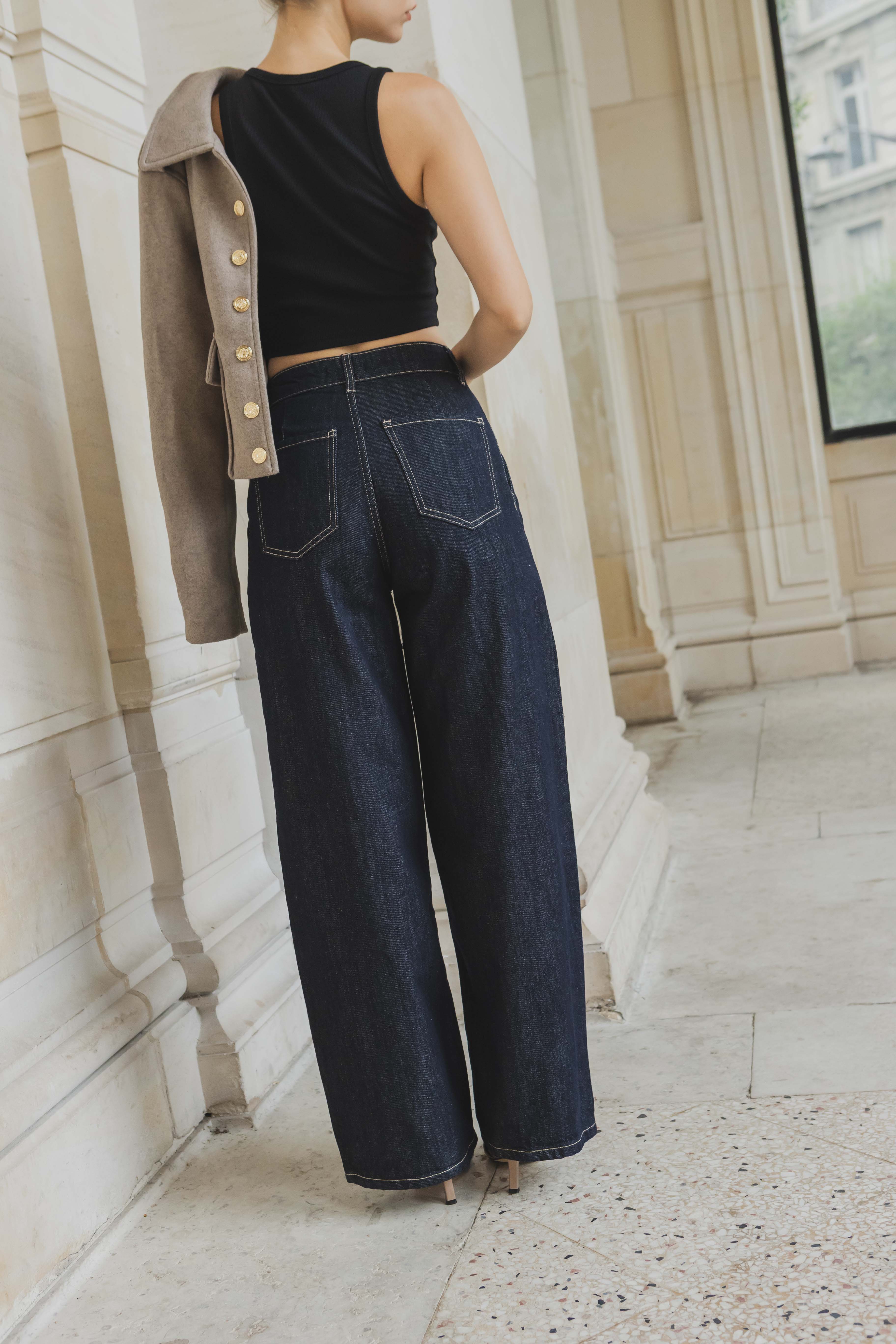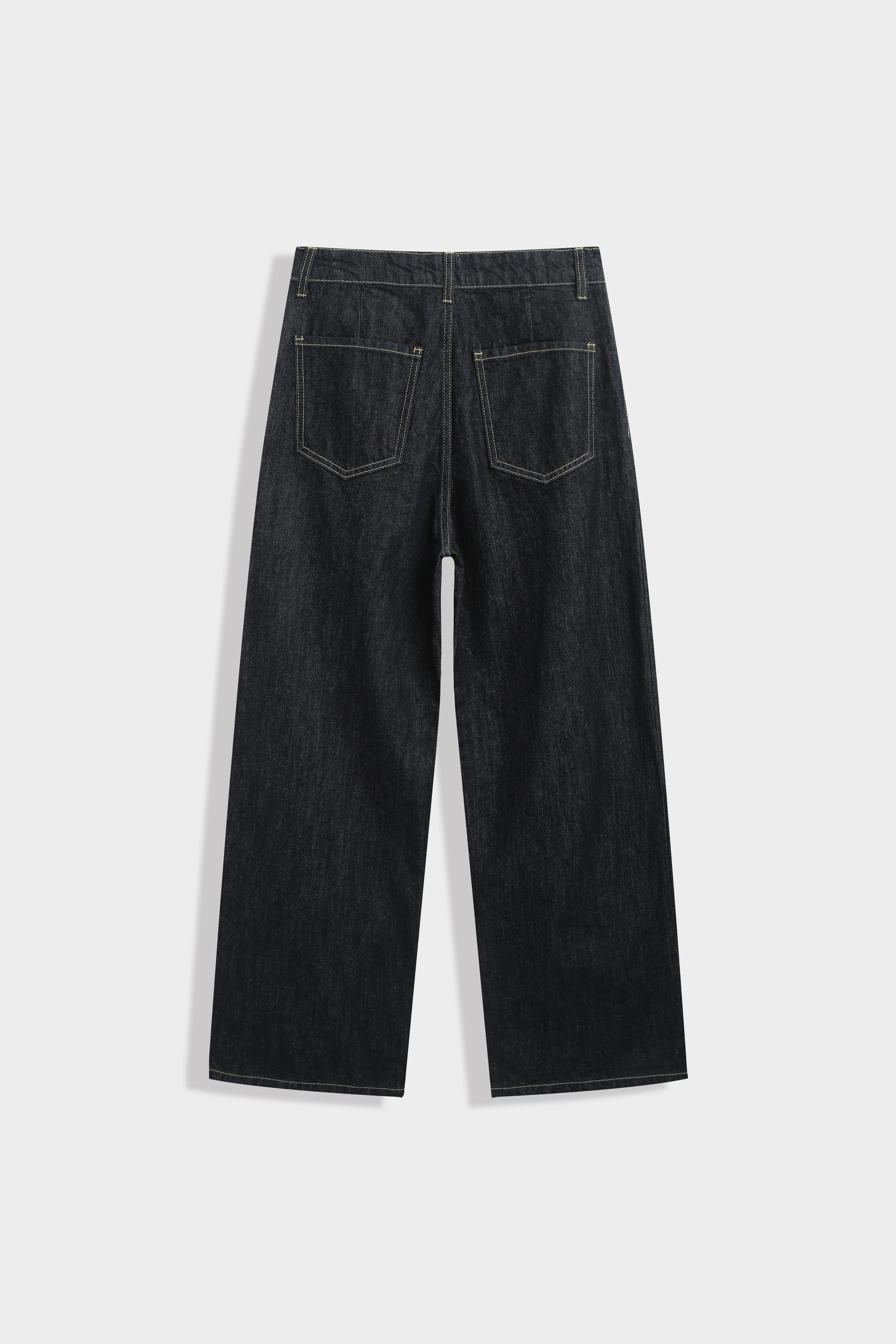 Pantalon en denim brut taille haute, coupe droite et jambes larges. Plis sur le devant, braguette zippée avec bouton métallique. Poches latérales à l'avant et poches plaquées à l'arrière. Surpiqûres contrastantes.