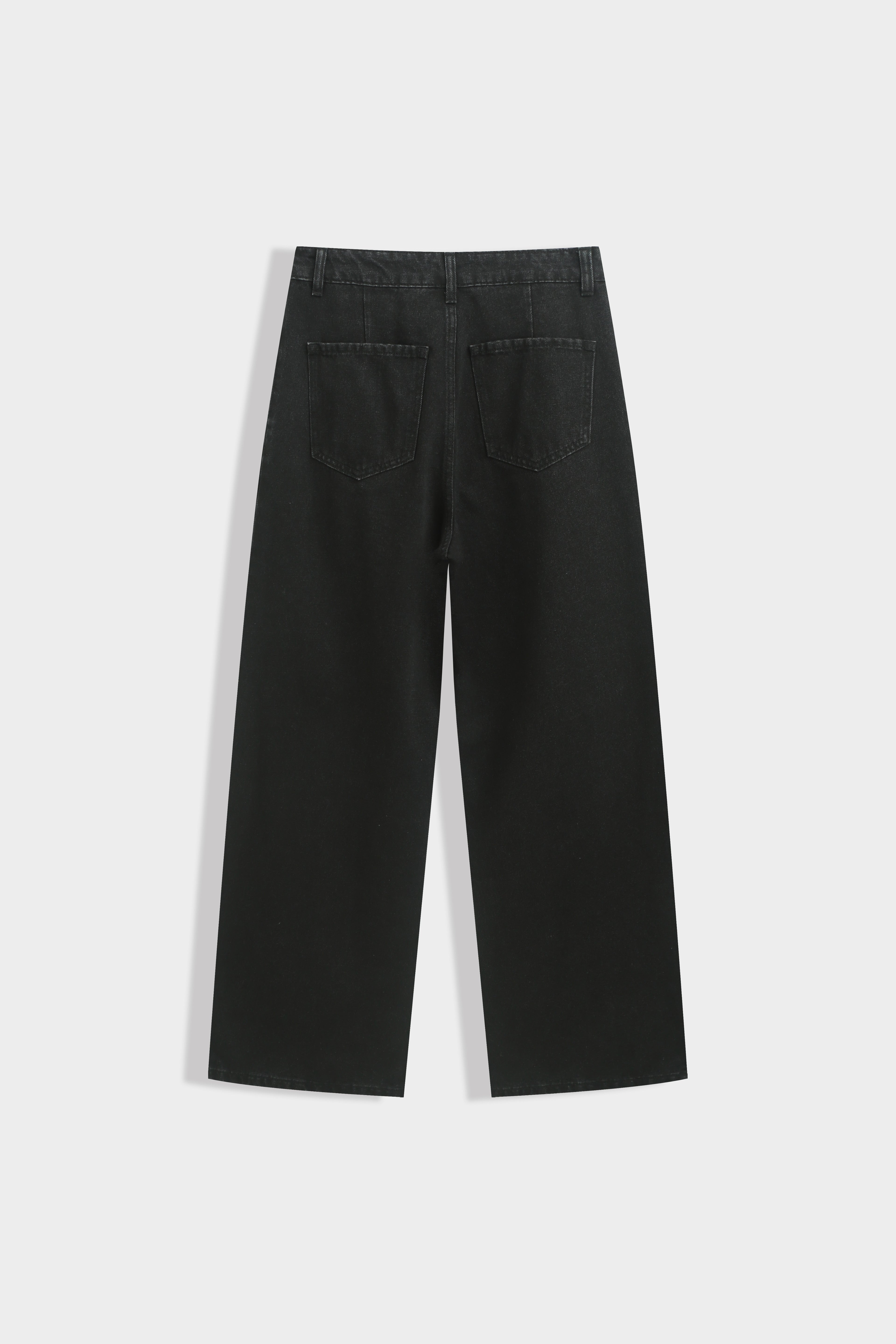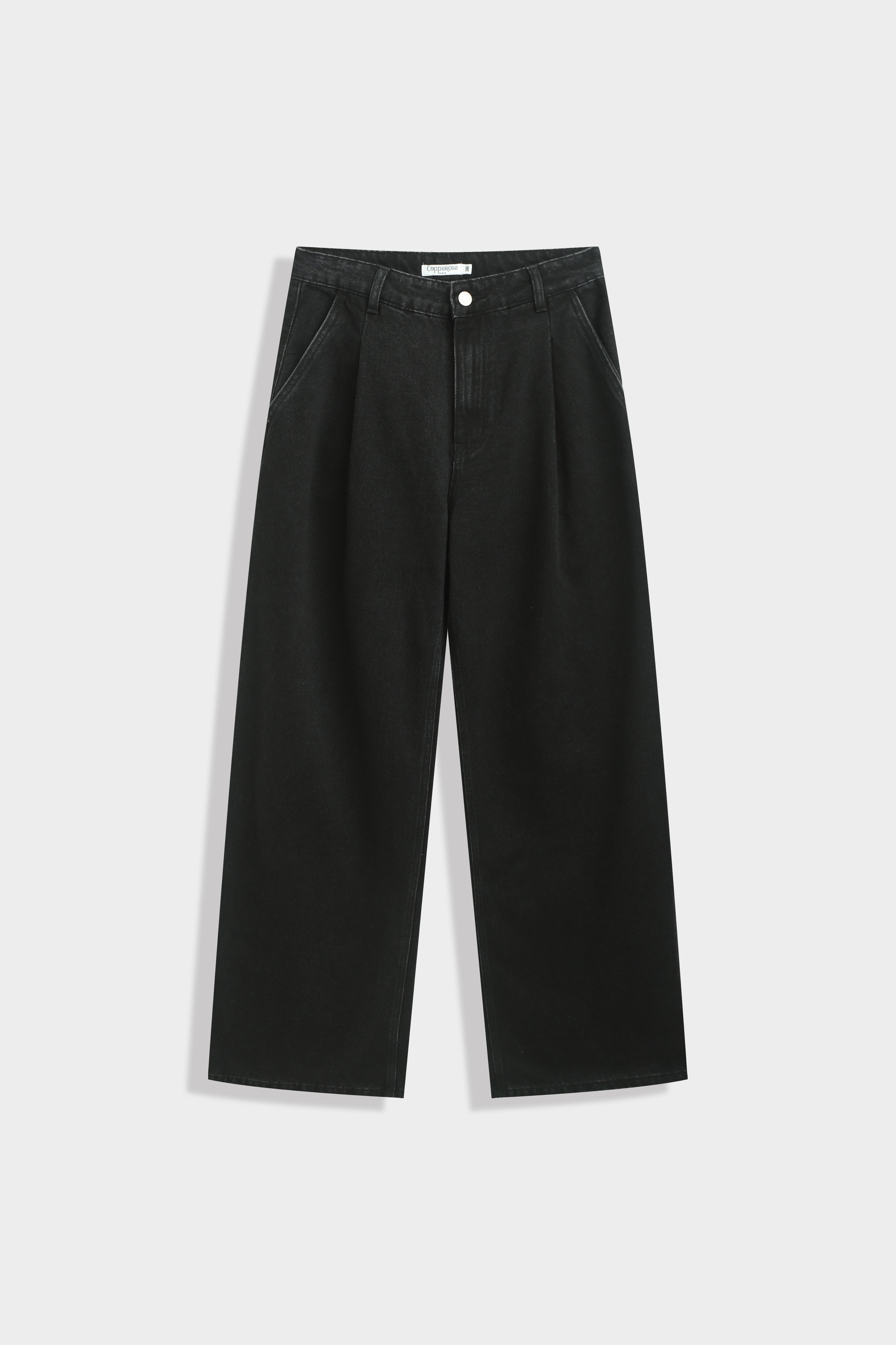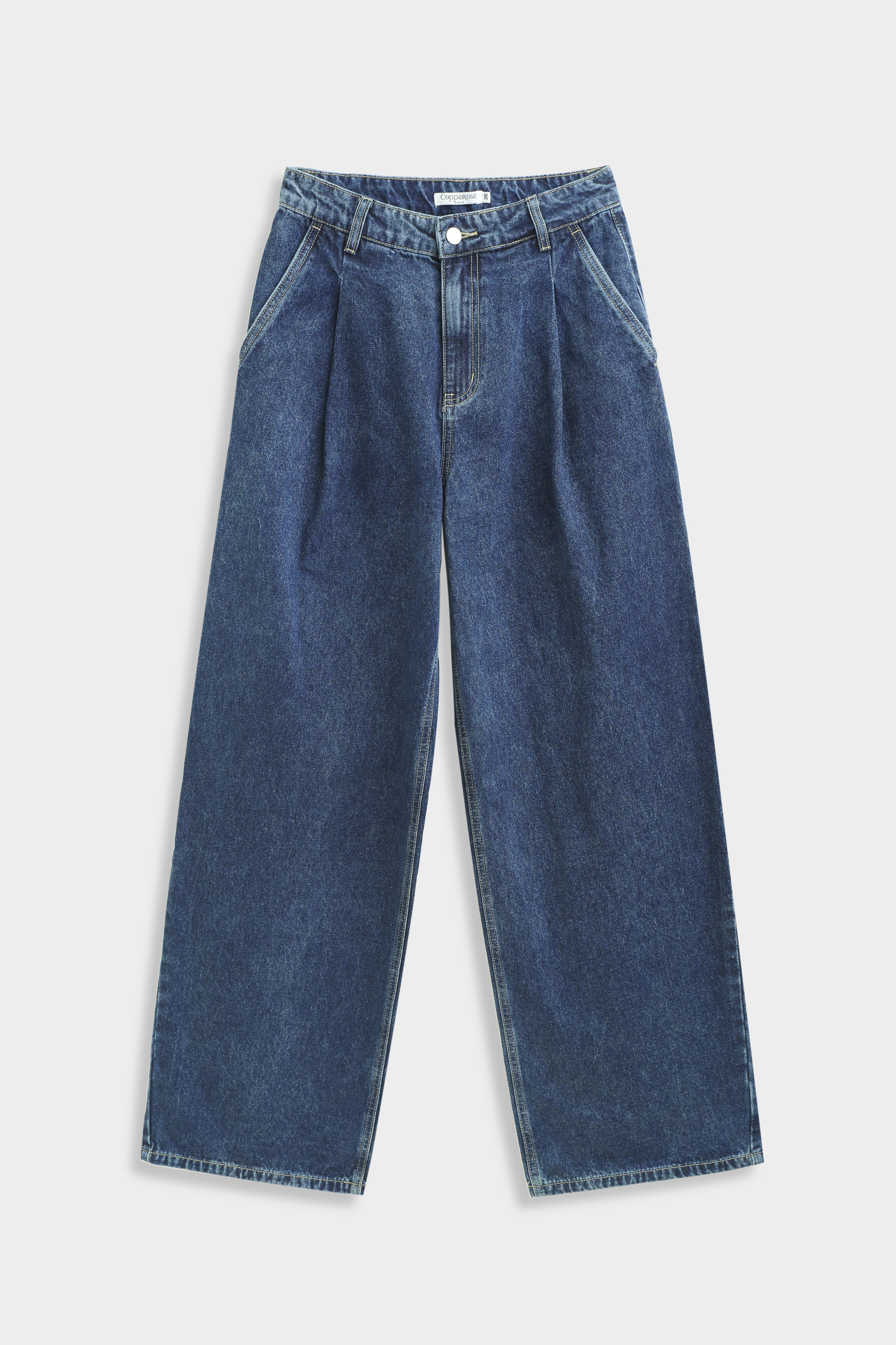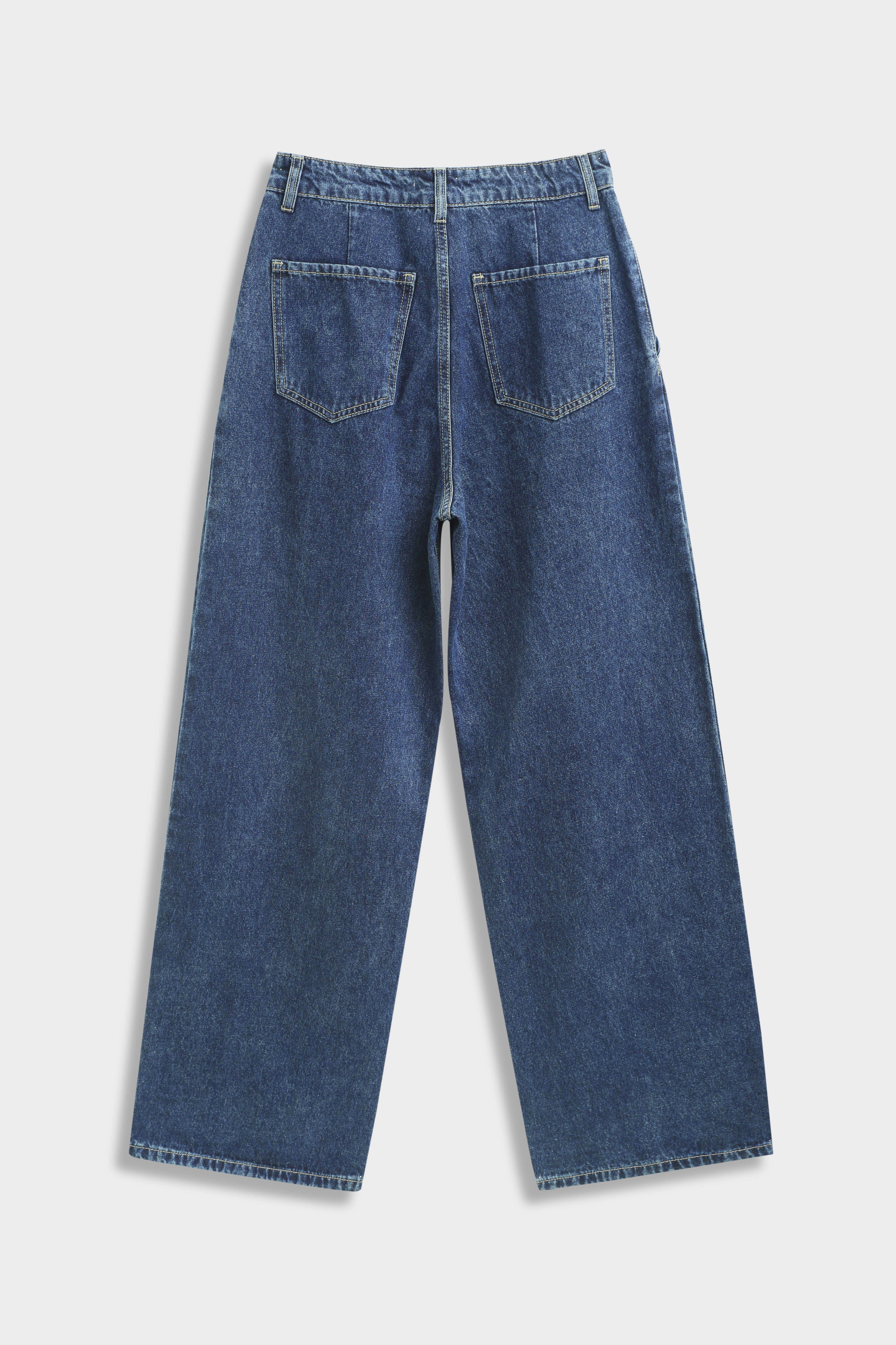 Pantalon en denim brut taille haute, coupe droite et jambes larges. Plis sur le devant, braguette zippée avec bouton métallique. Poches latérales à l'avant et poches plaquées à l'arrière. Surpiqûres contrastantes.