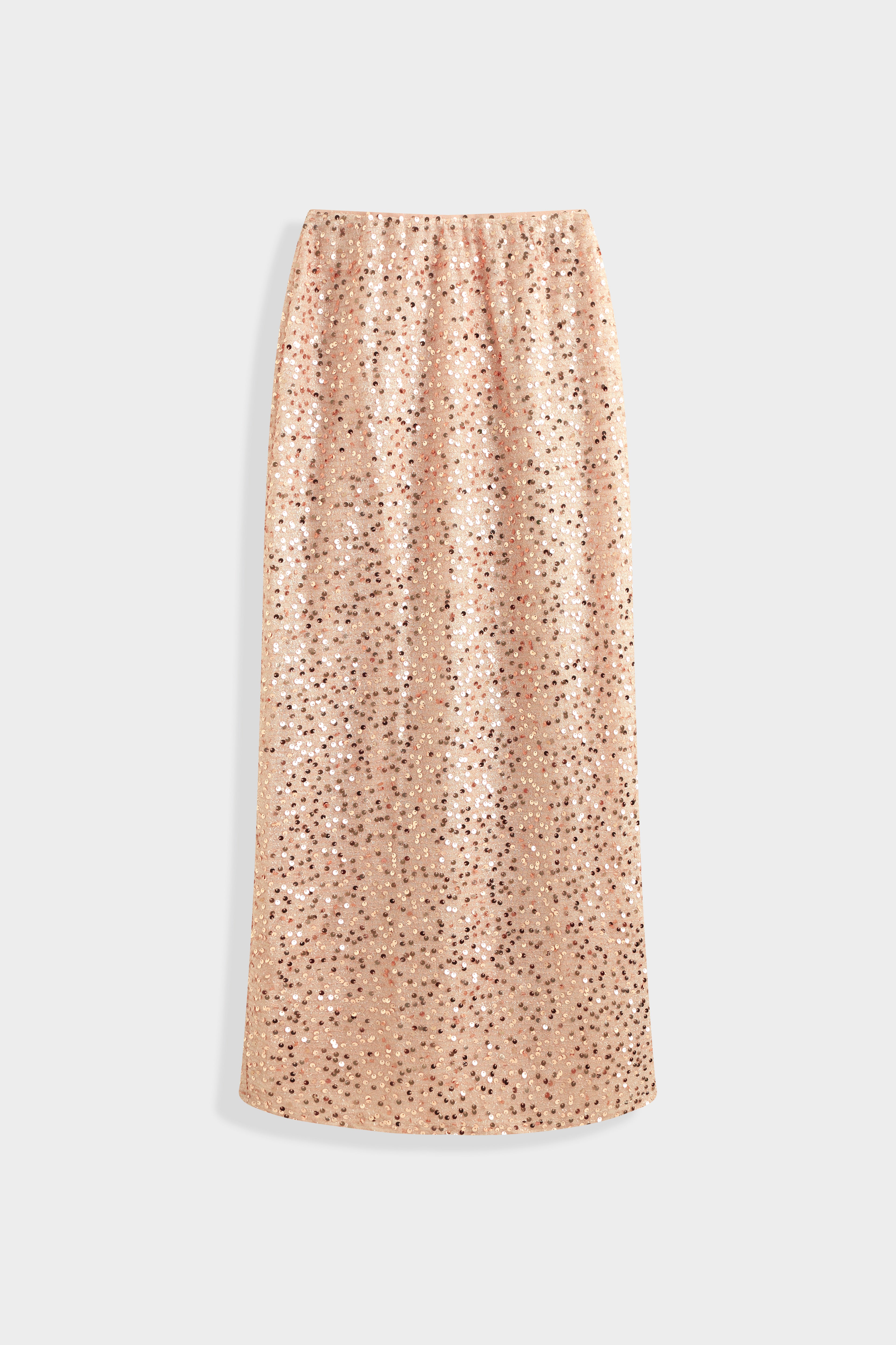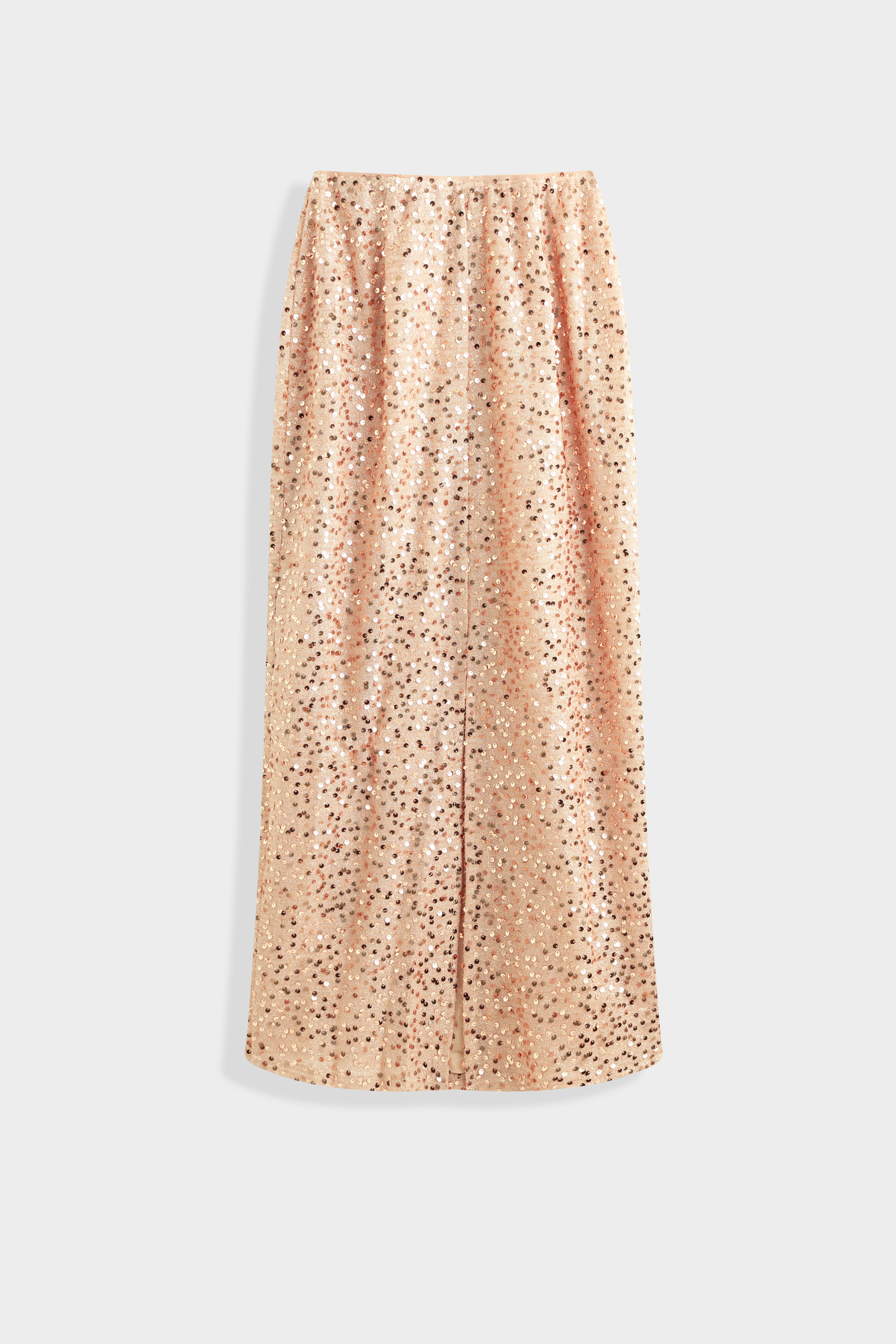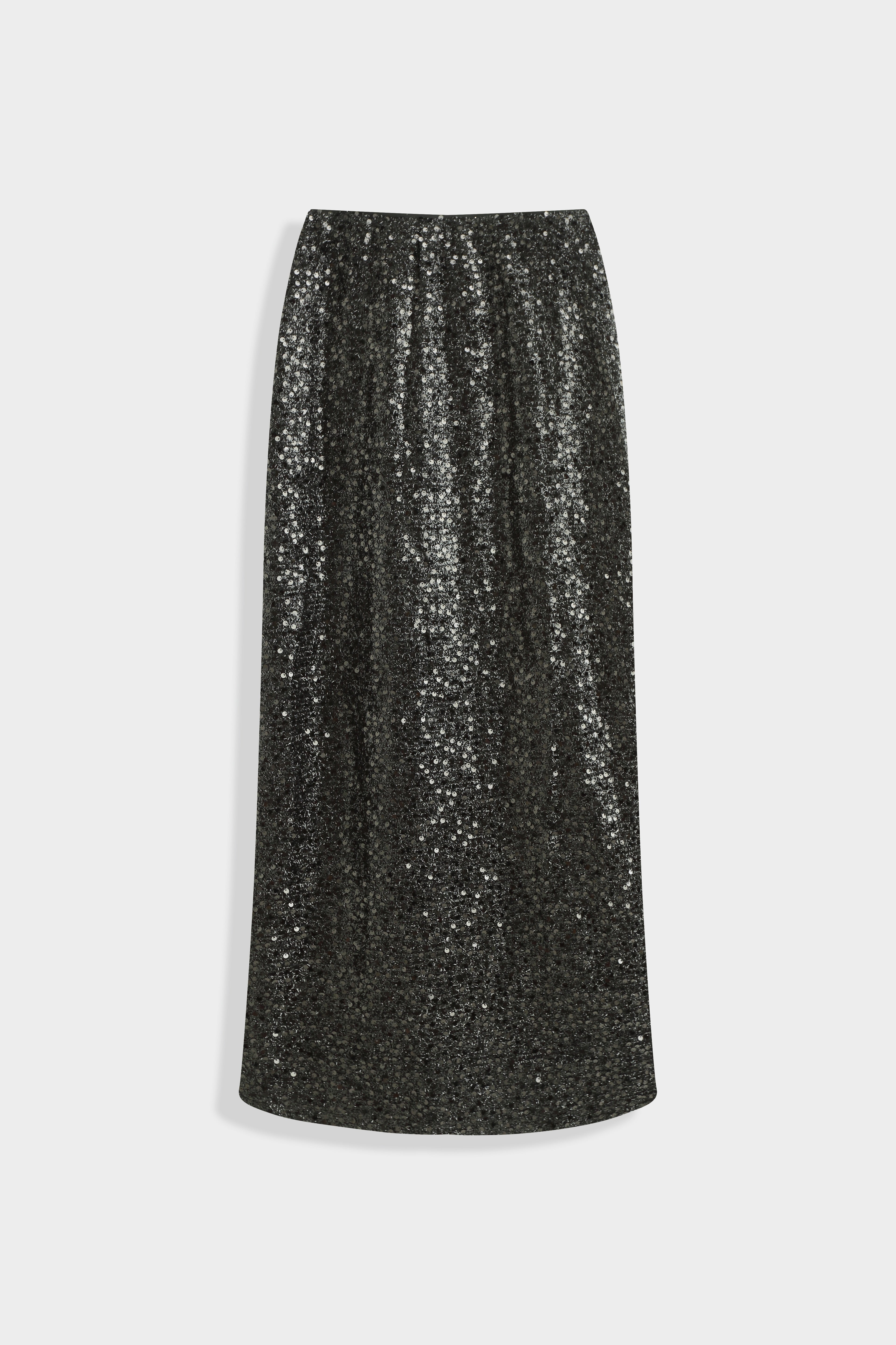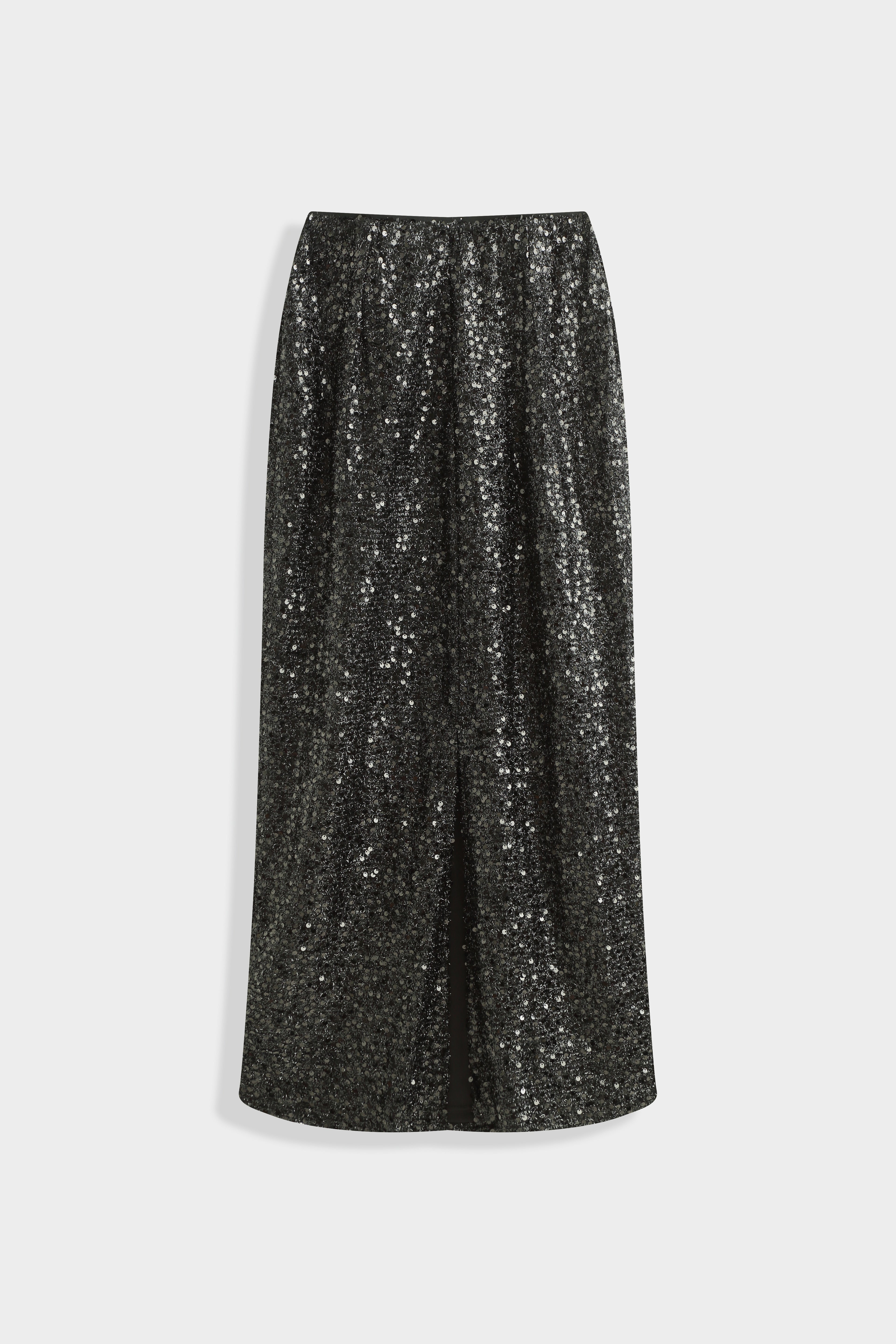 Jupe droite longueur 95 cm en tissu sequins. Taille élastiquée. Fente arrière. Doublure intérieure.