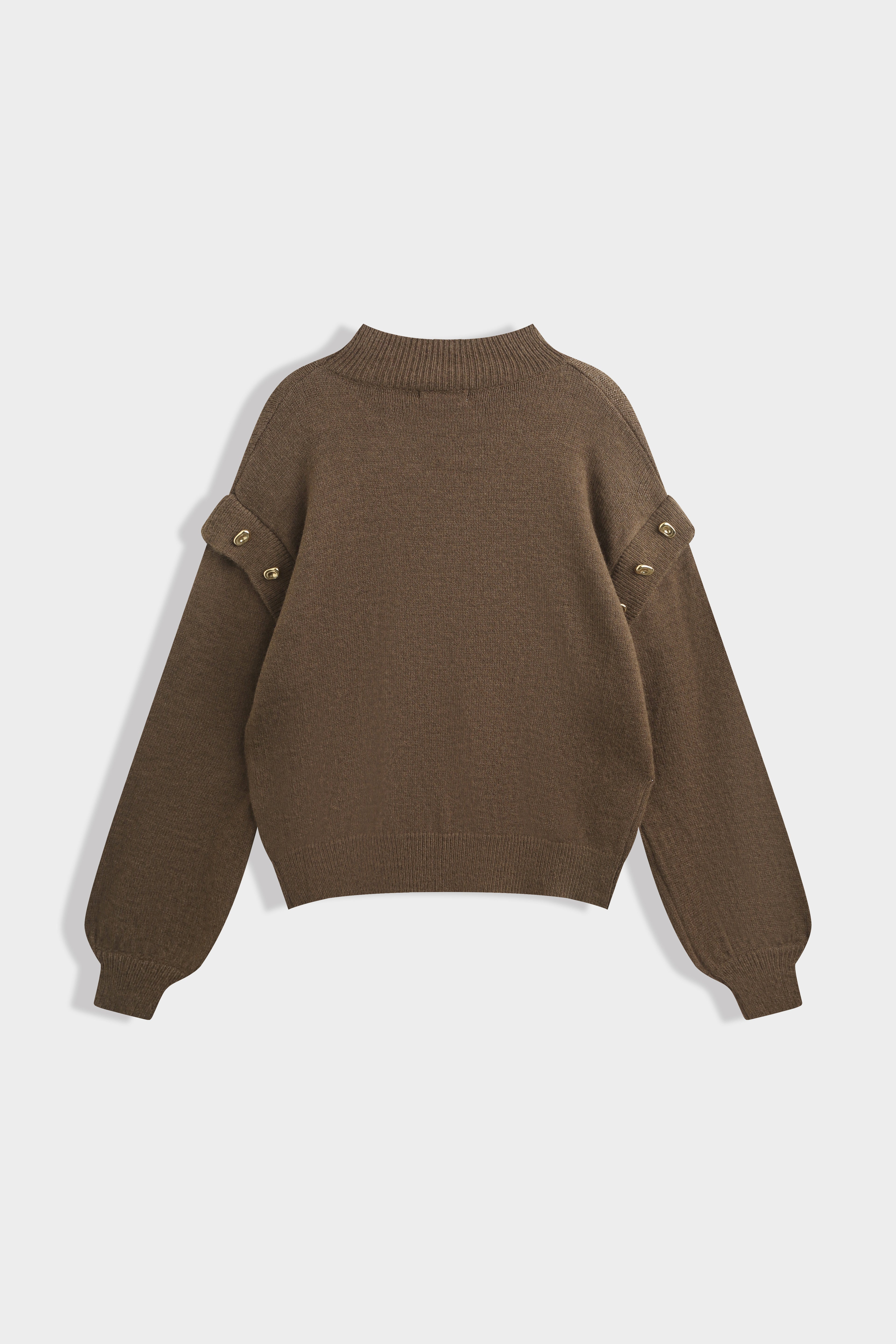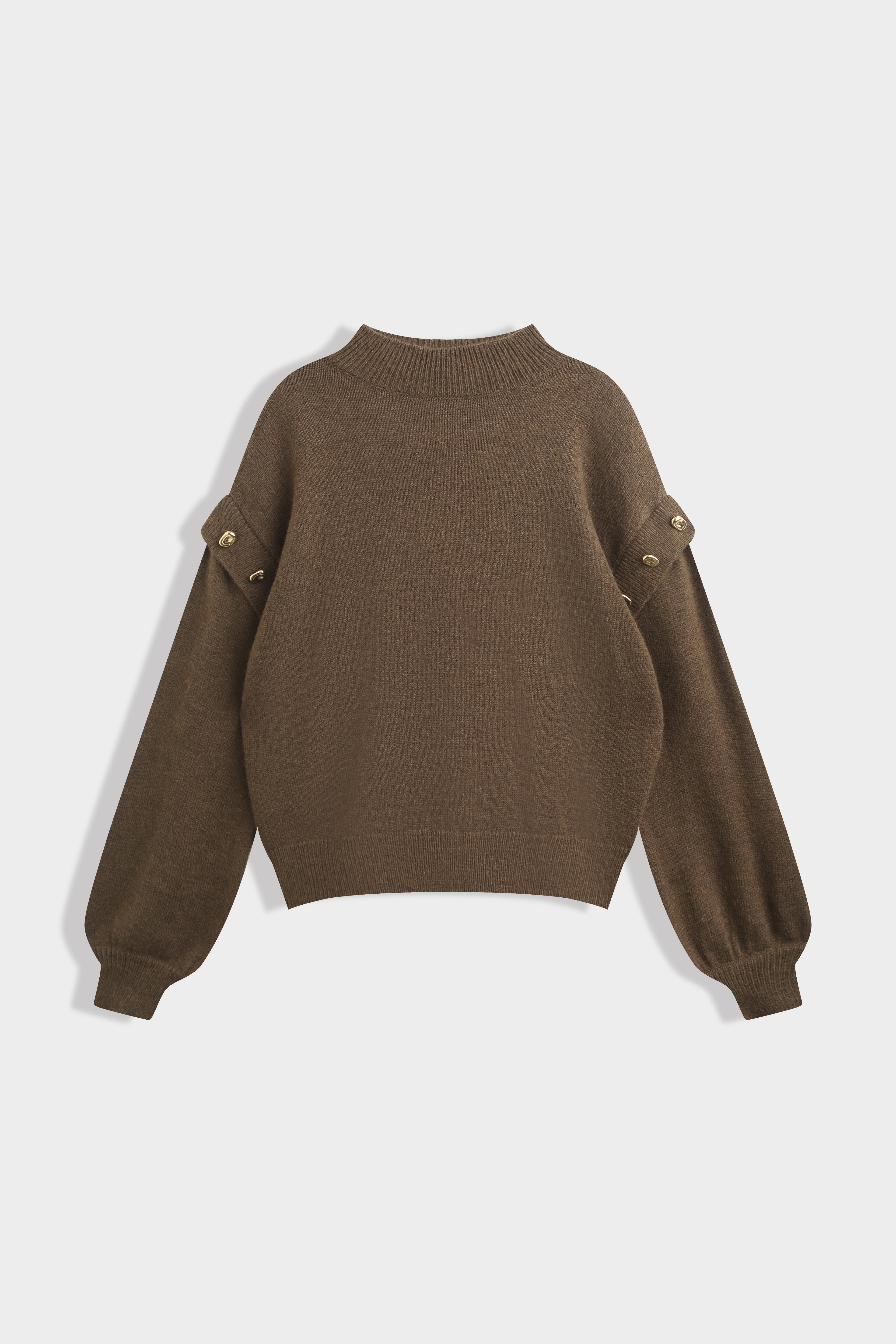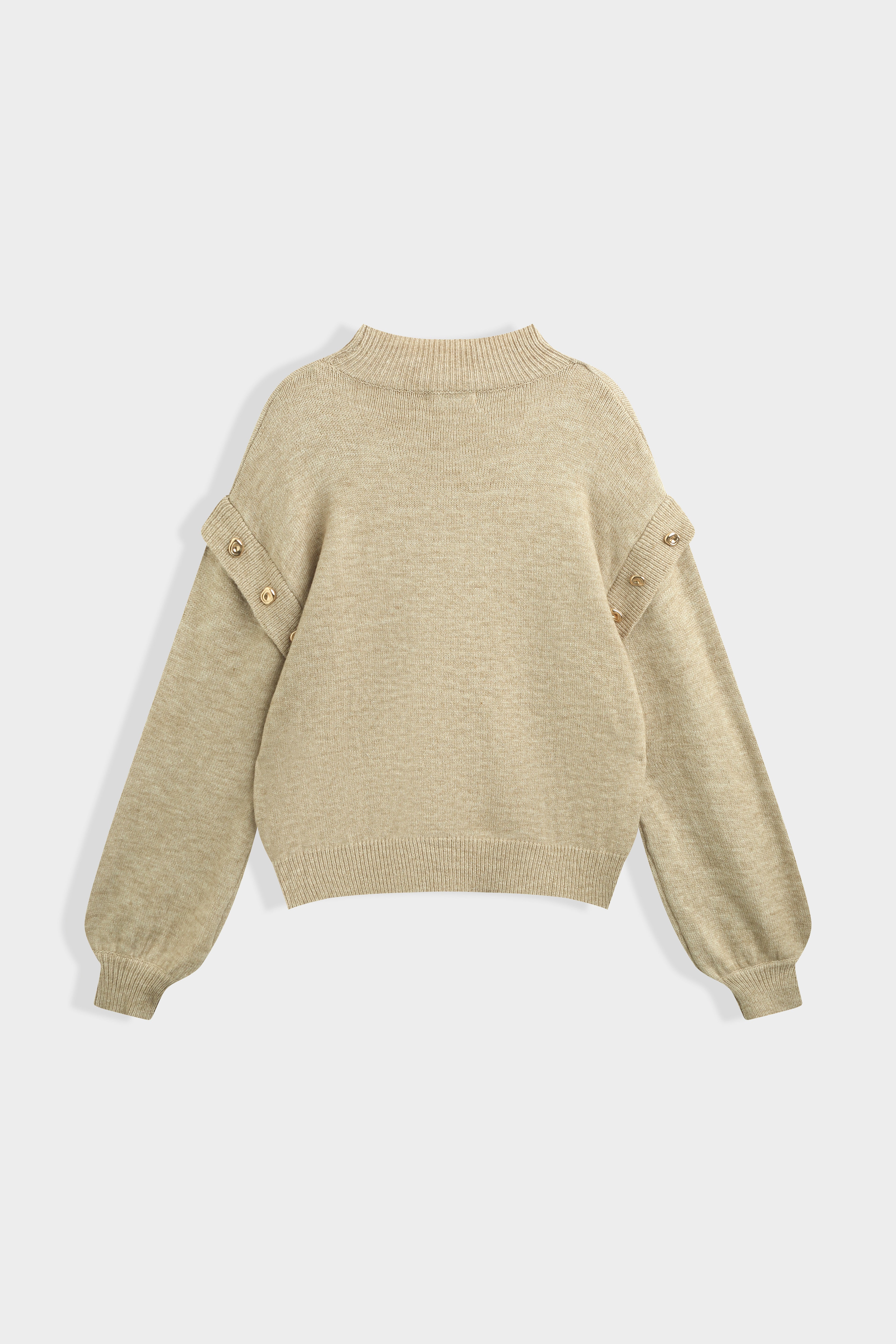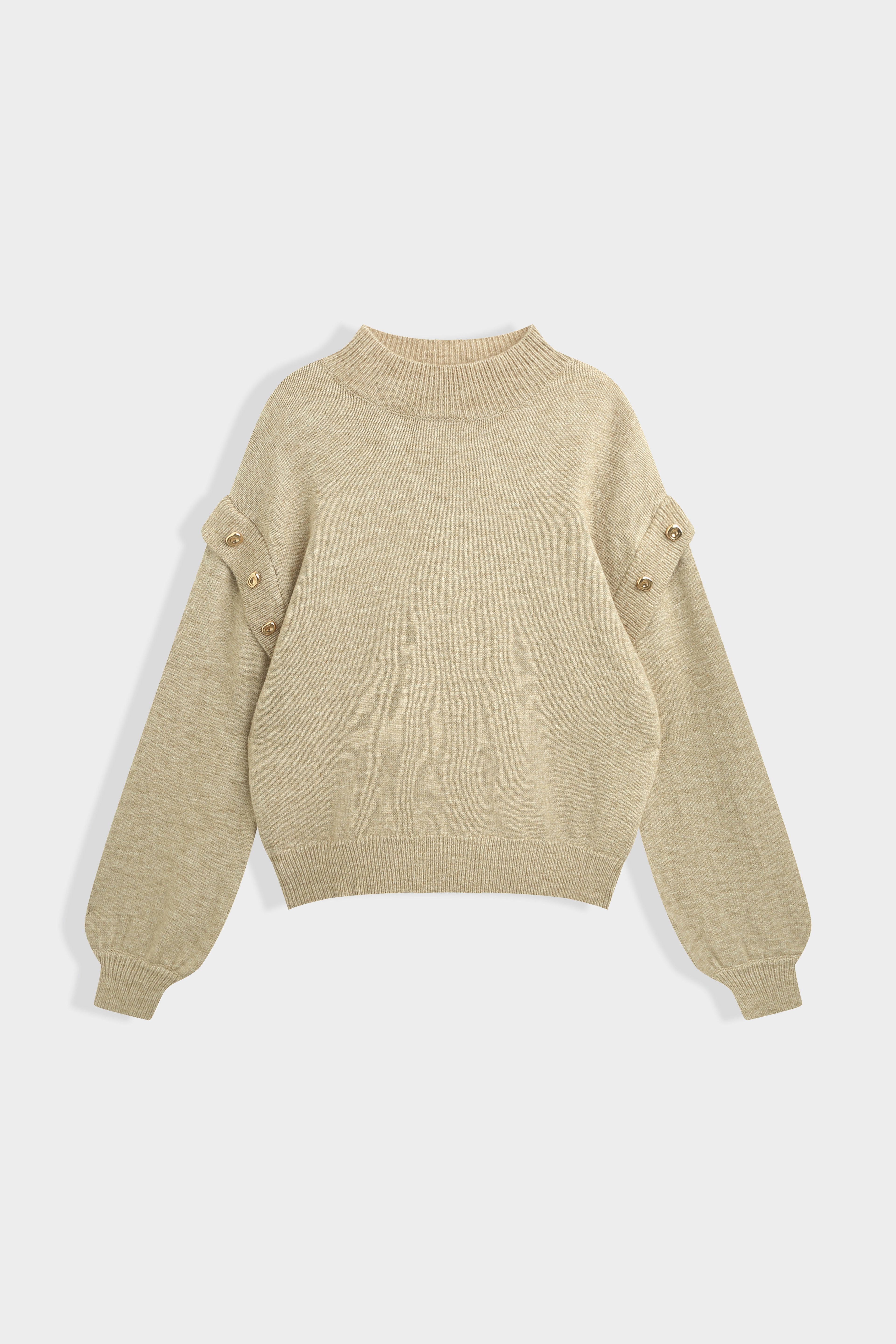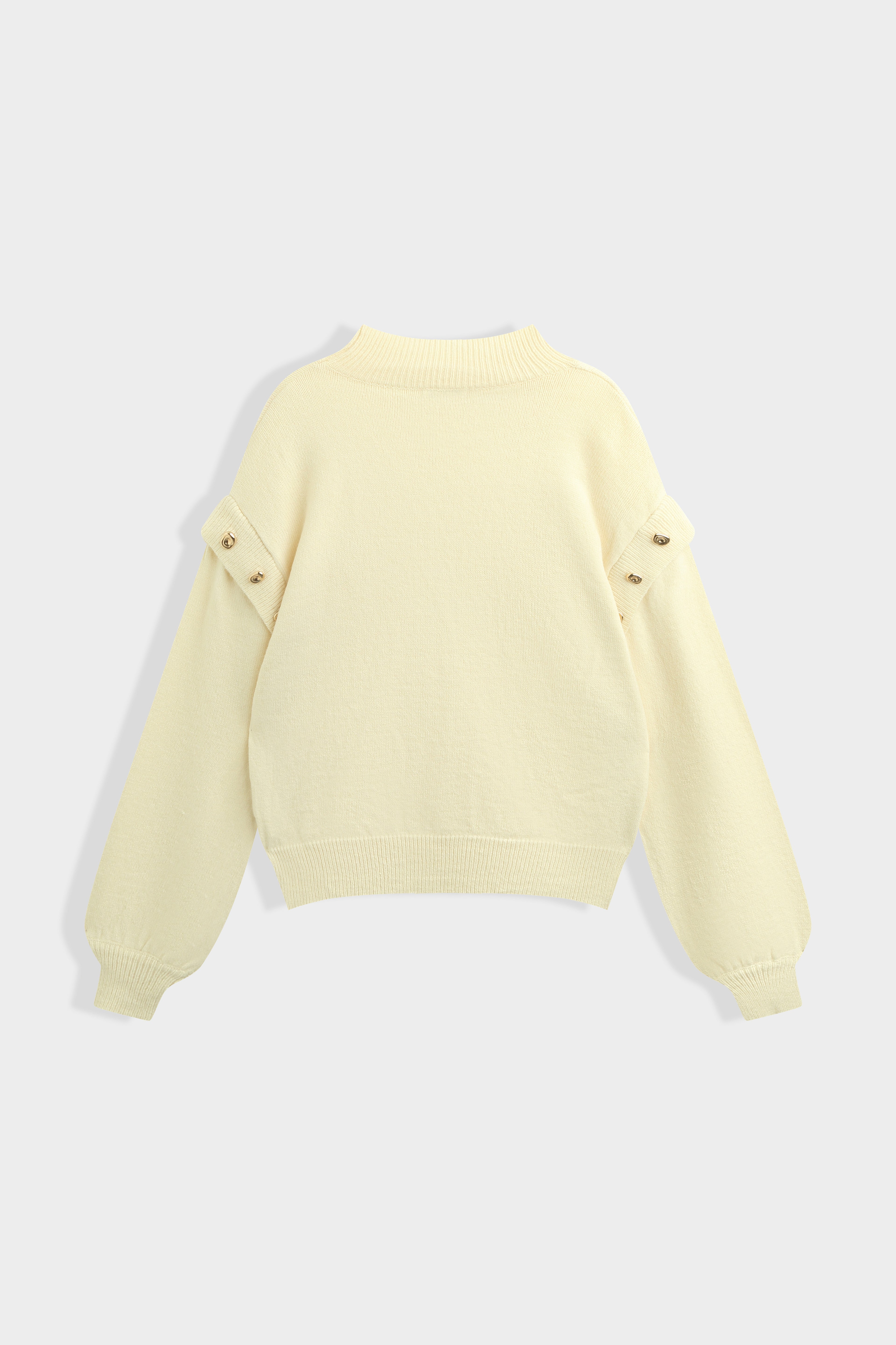 Pull manches longues, épaules tombantes, col cheminé avec détail boutons aux épaules. Détail bordcôte au col, bas de manches et bas de pull