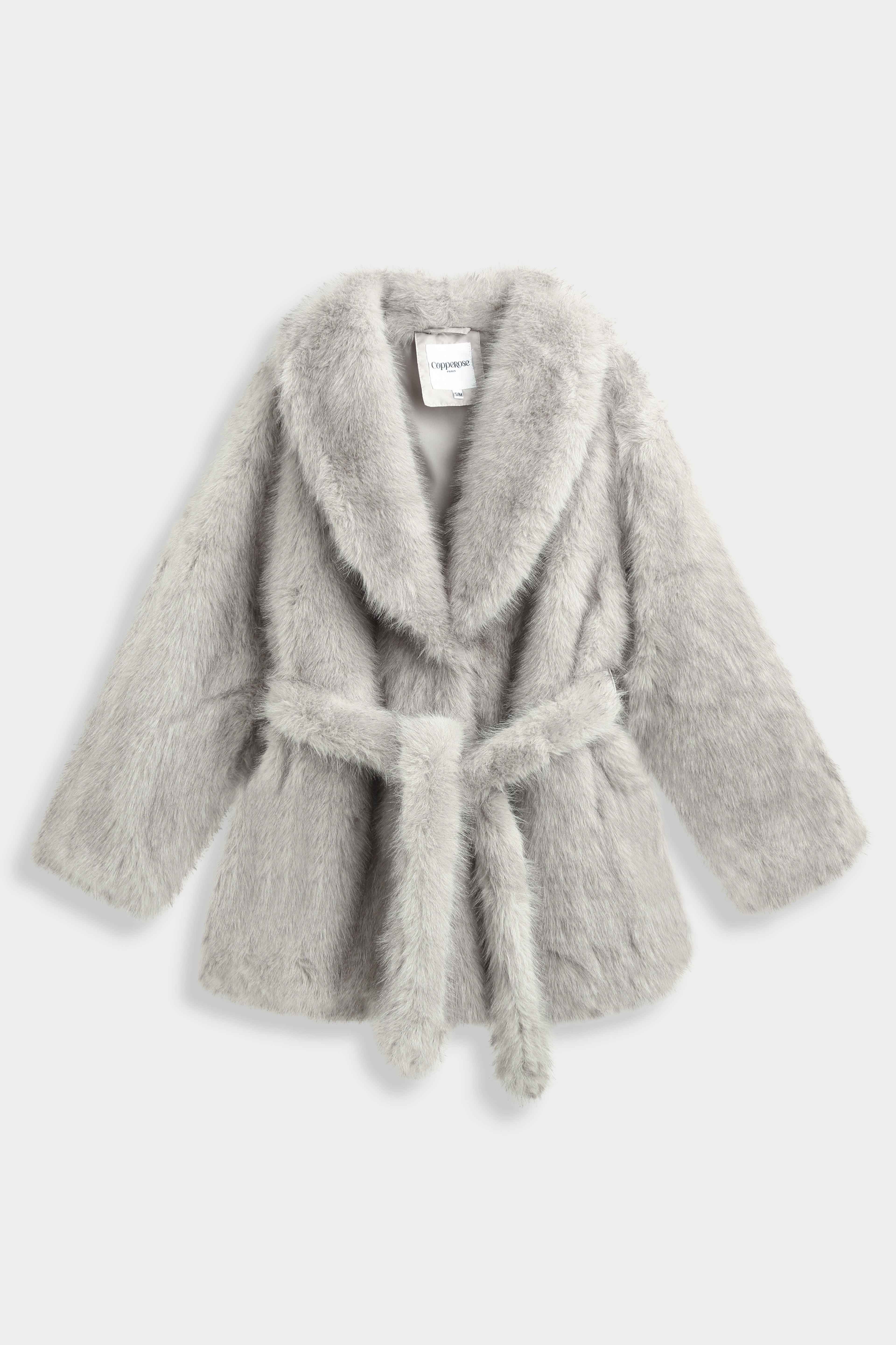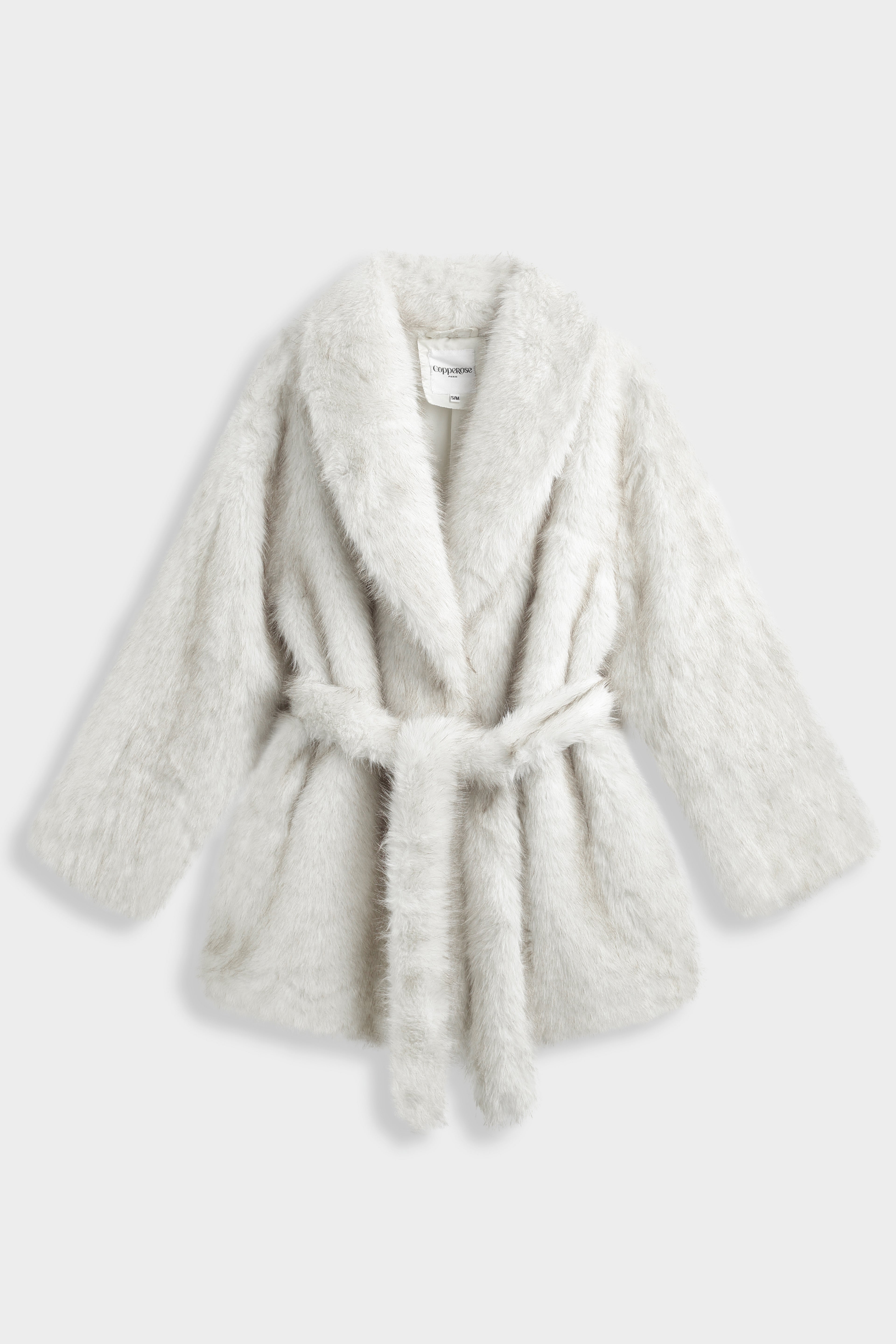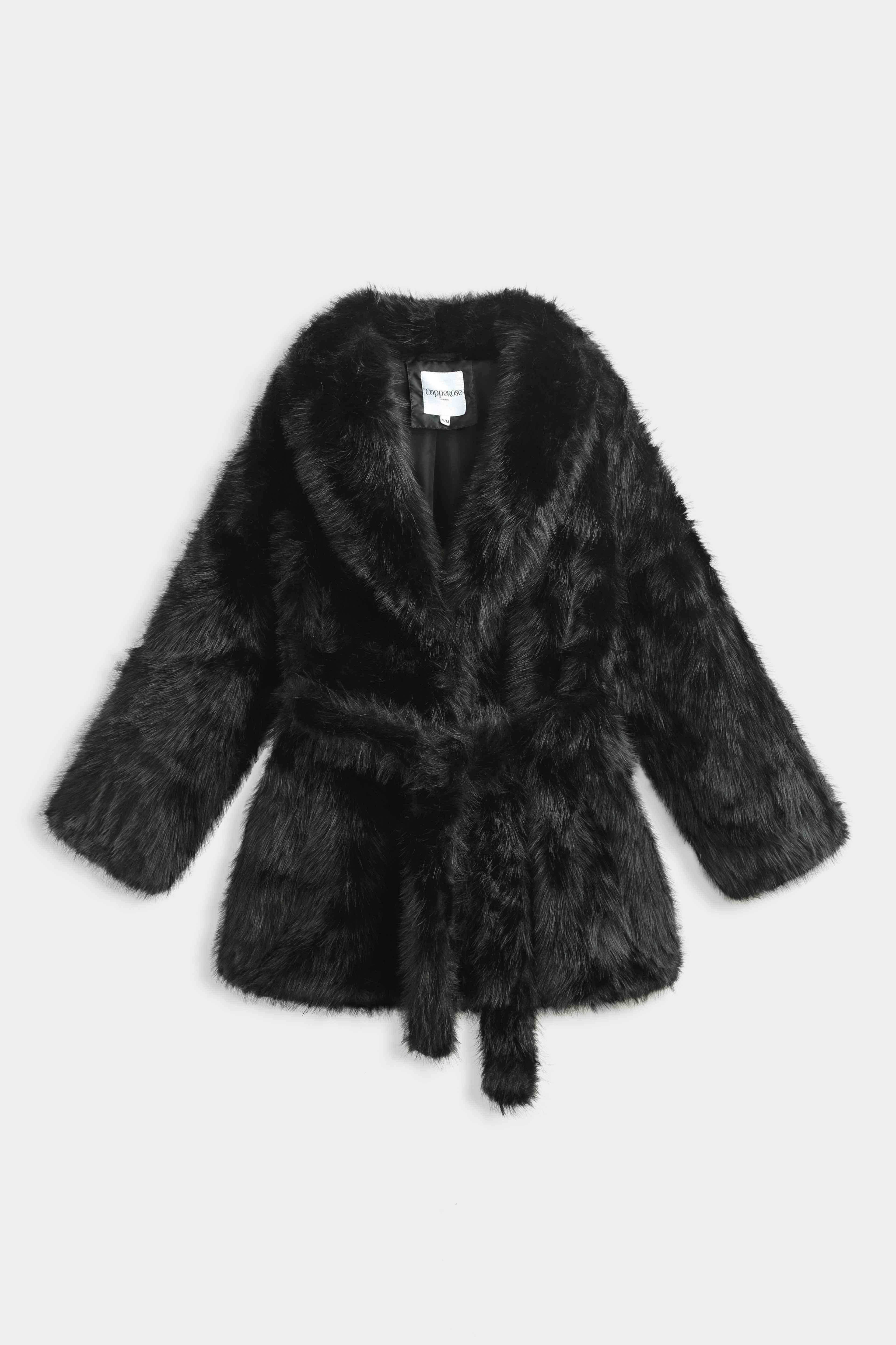 Manteau en fausse fourrure à col châle large. Manches longues droites. Ceinture assortie à nouer à la taille. Poches latérales insérées dans la couture. Doublure intérieure ton sur ton. Longueur mi-cuisse.