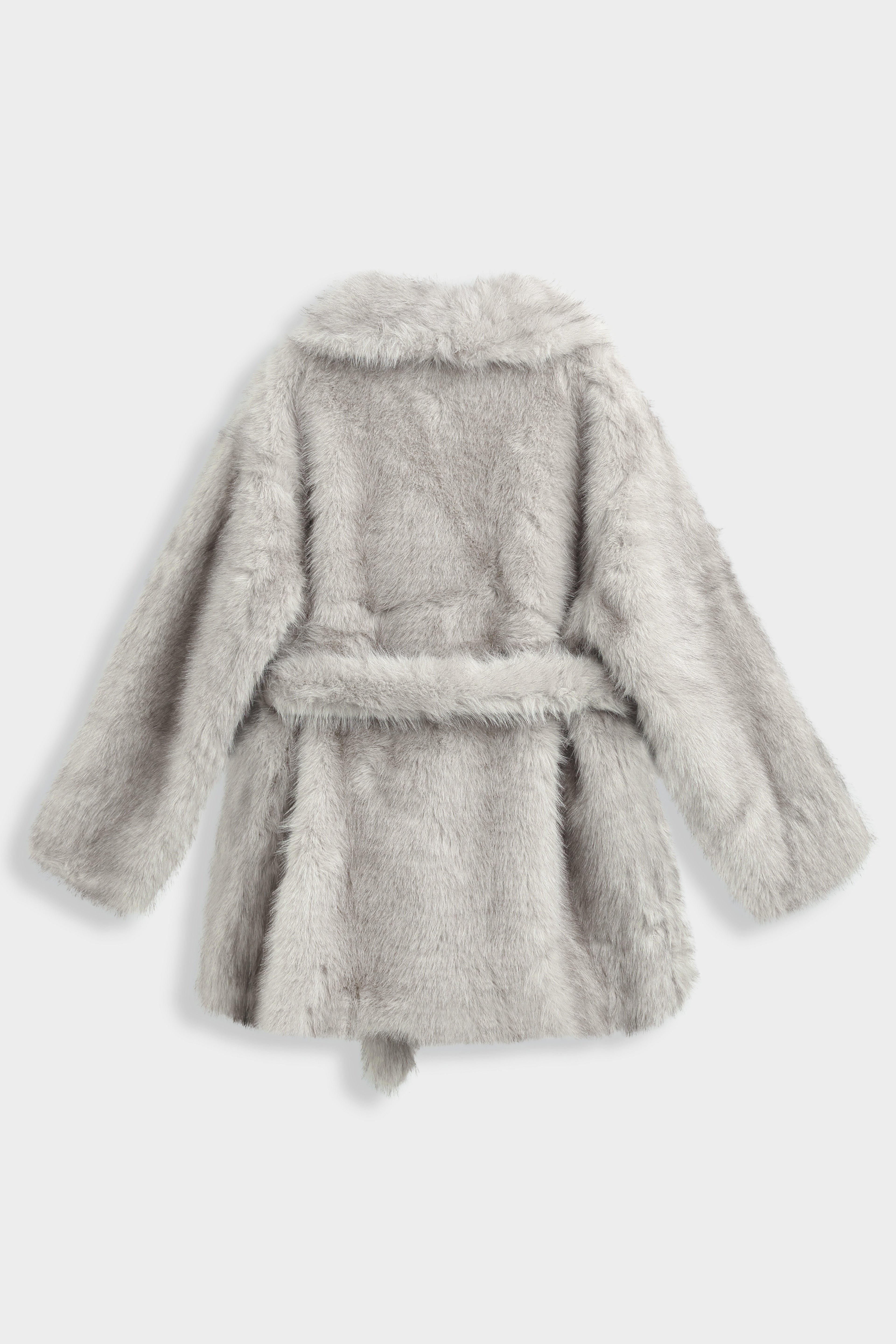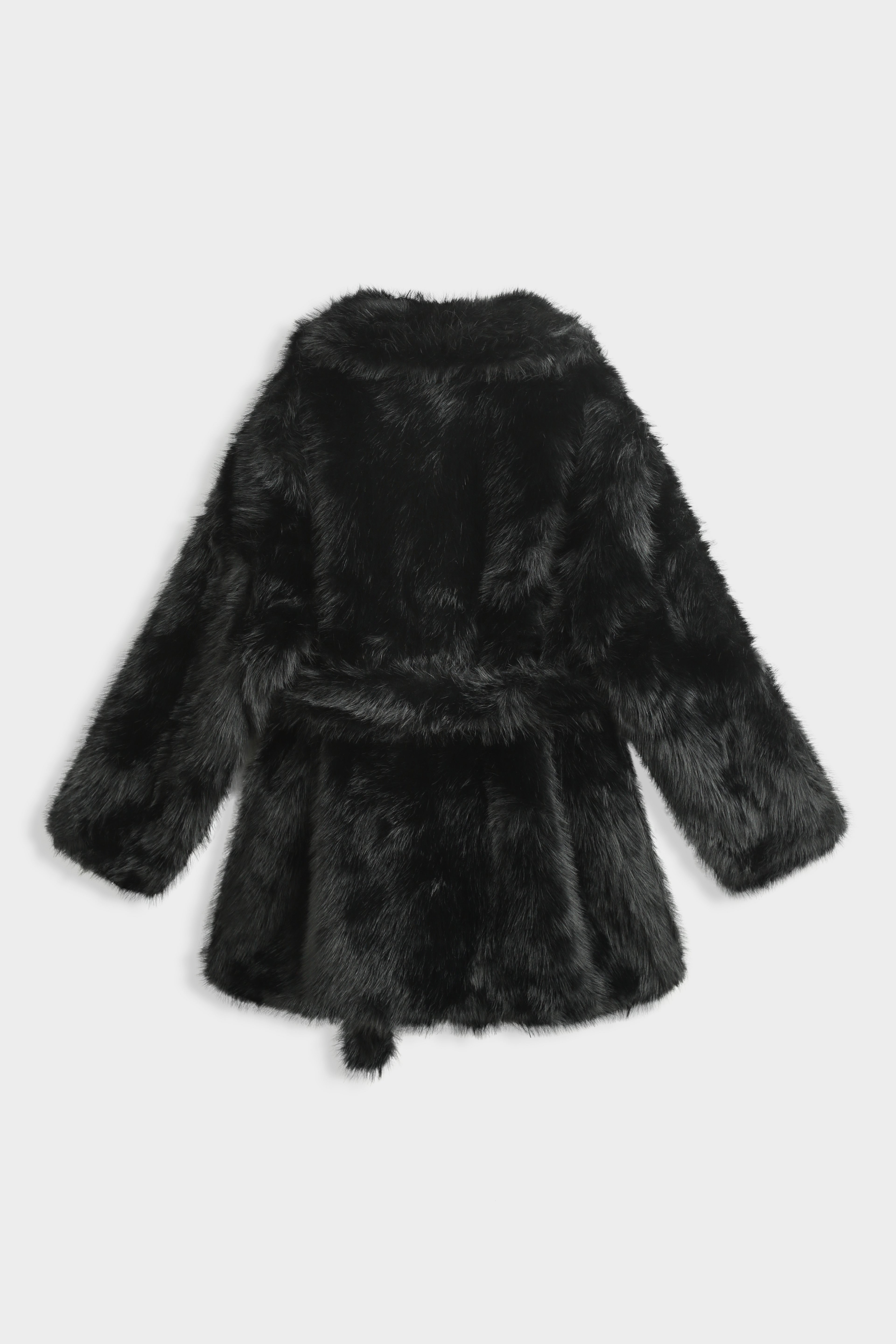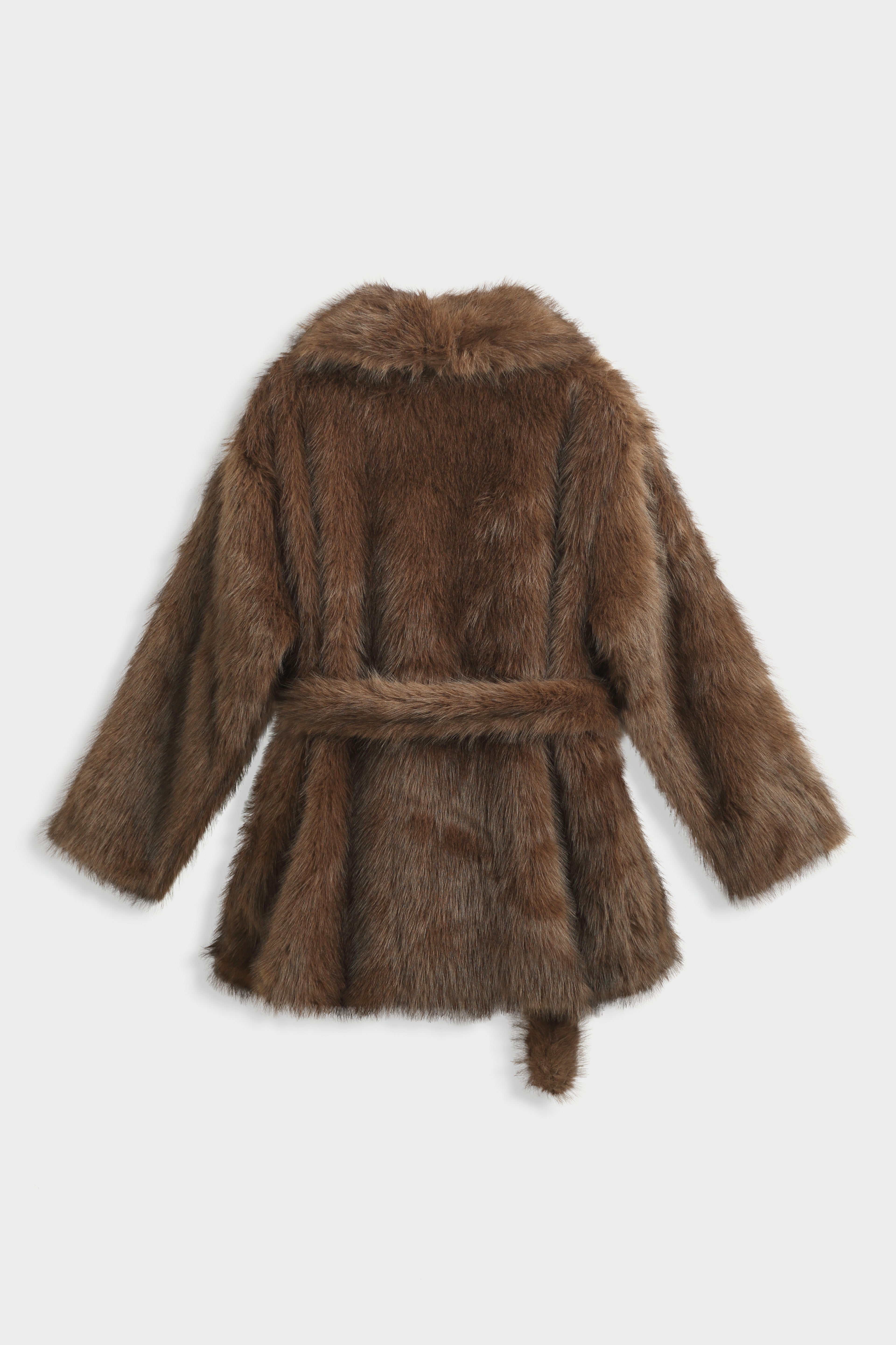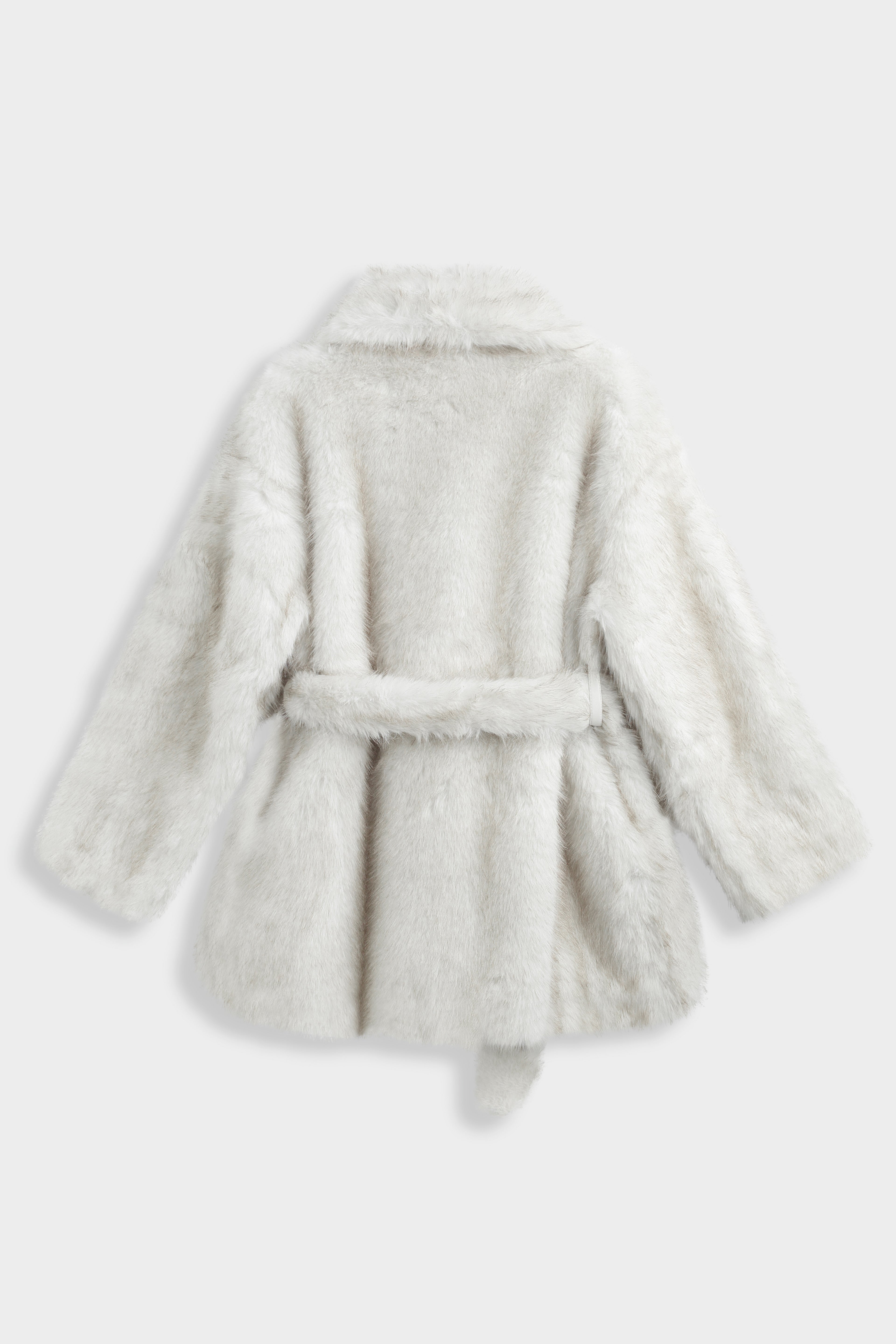 Manteau en fausse fourrure à col châle large. Manches longues droites. Ceinture assortie à nouer à la taille. Poches latérales insérées dans la couture. Doublure intérieure ton sur ton. Longueur mi-cuisse.