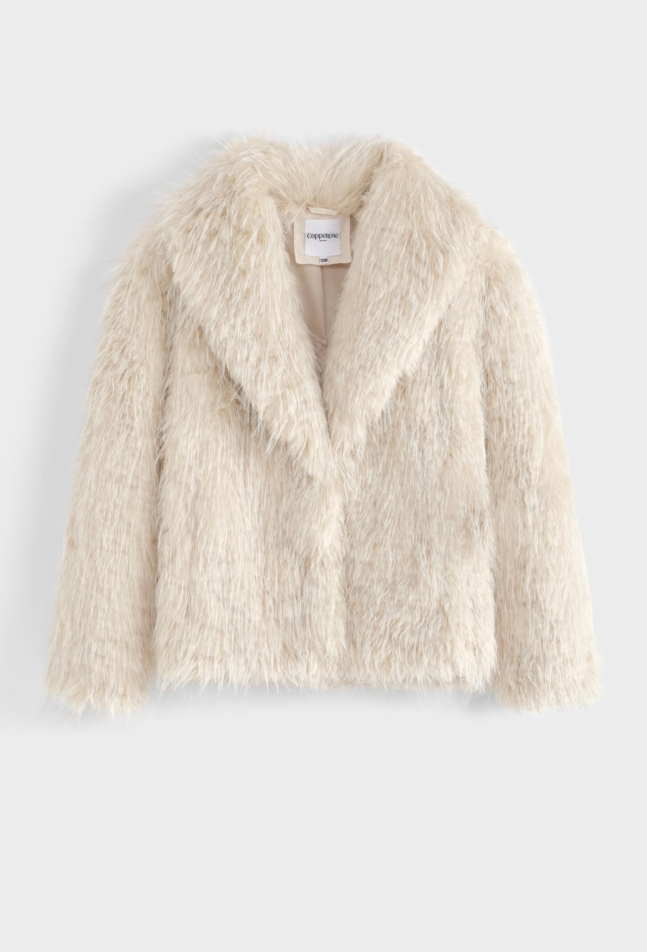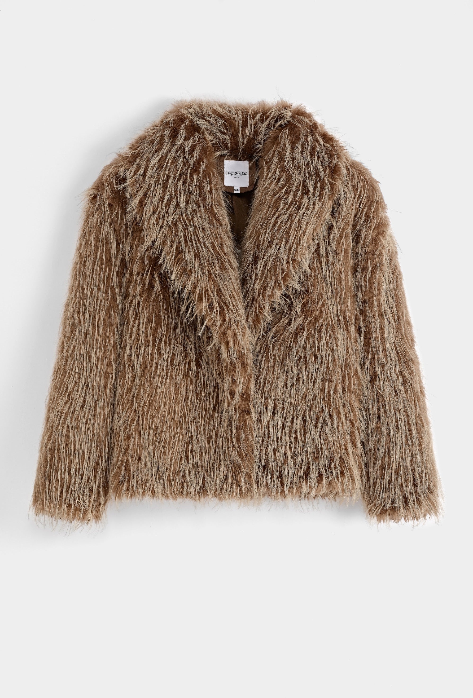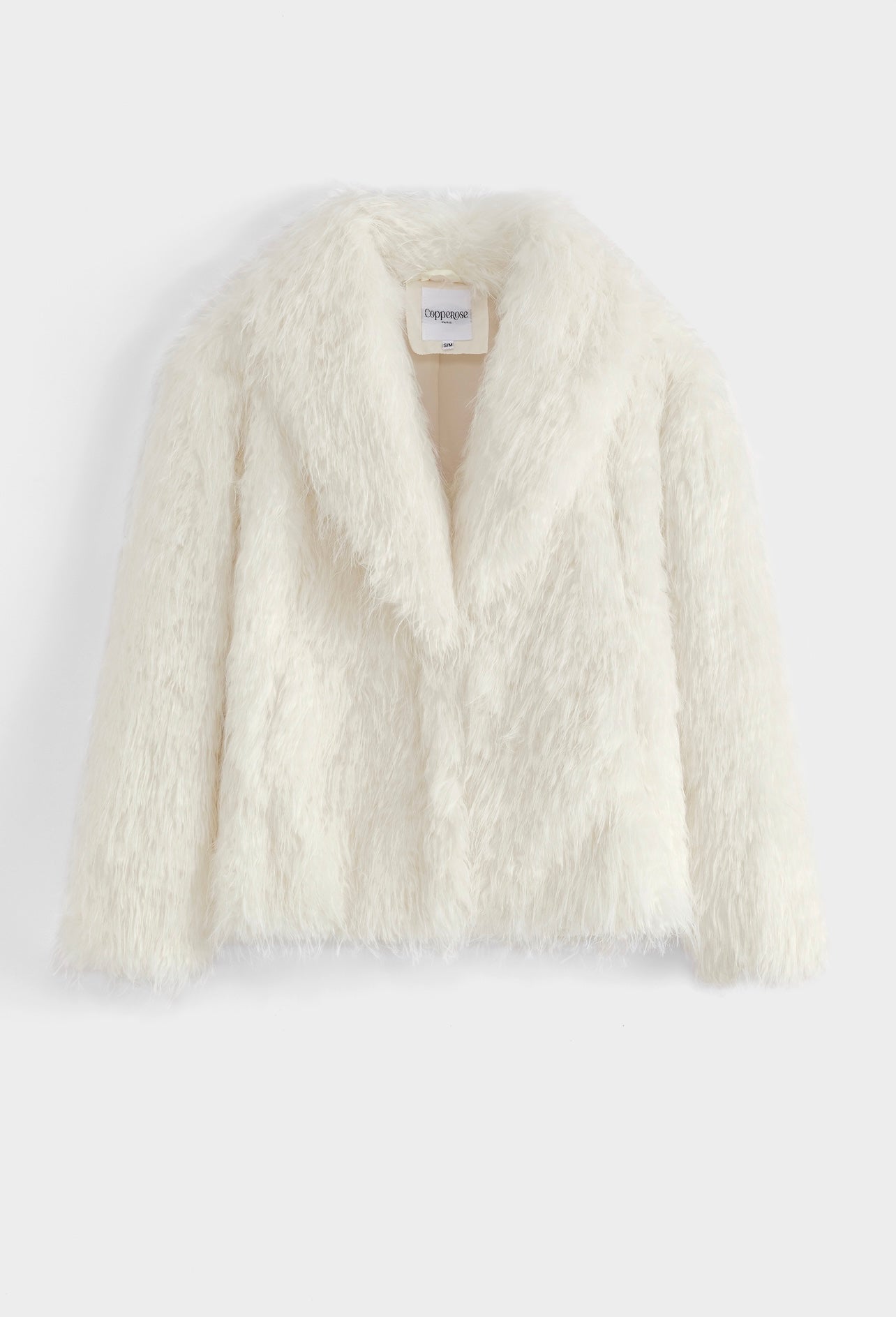 Veste en fourrure shaggy synthétique. Col à revers large structuré. Manches longues droites. Fermeture frontale par bouton-pression invisibles.
