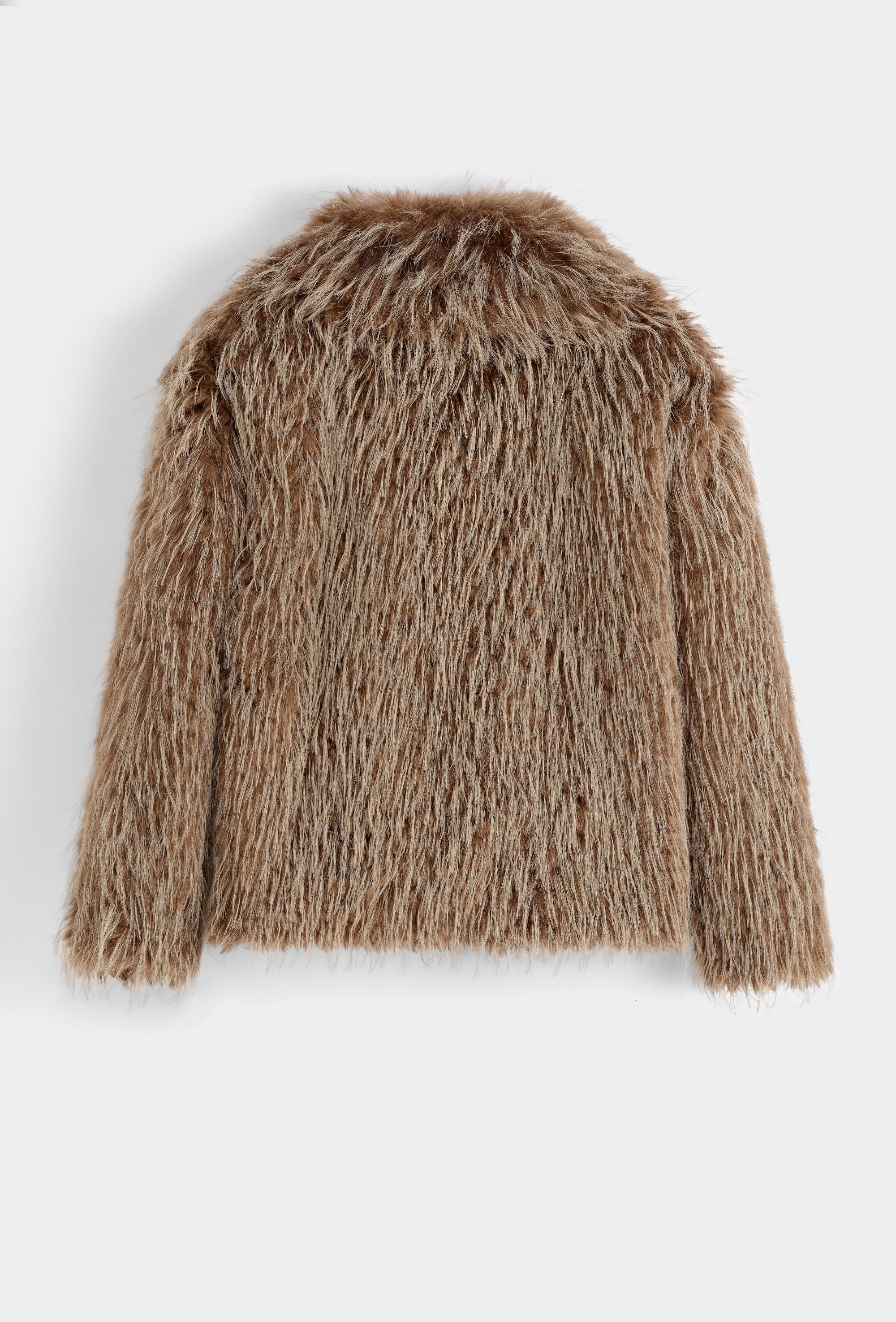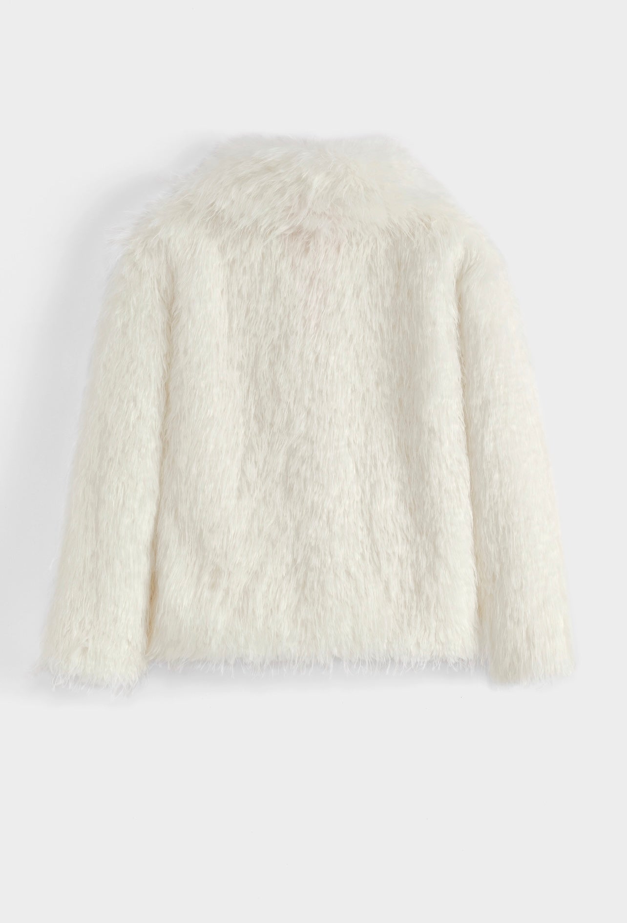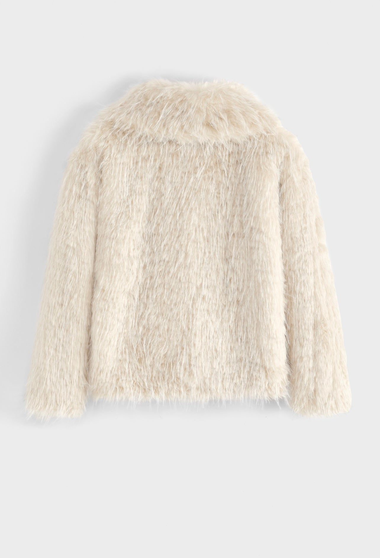 Veste en fourrure shaggy synthétique. Col à revers large structuré. Manches longues droites. Fermeture frontale par bouton-pression invisibles.