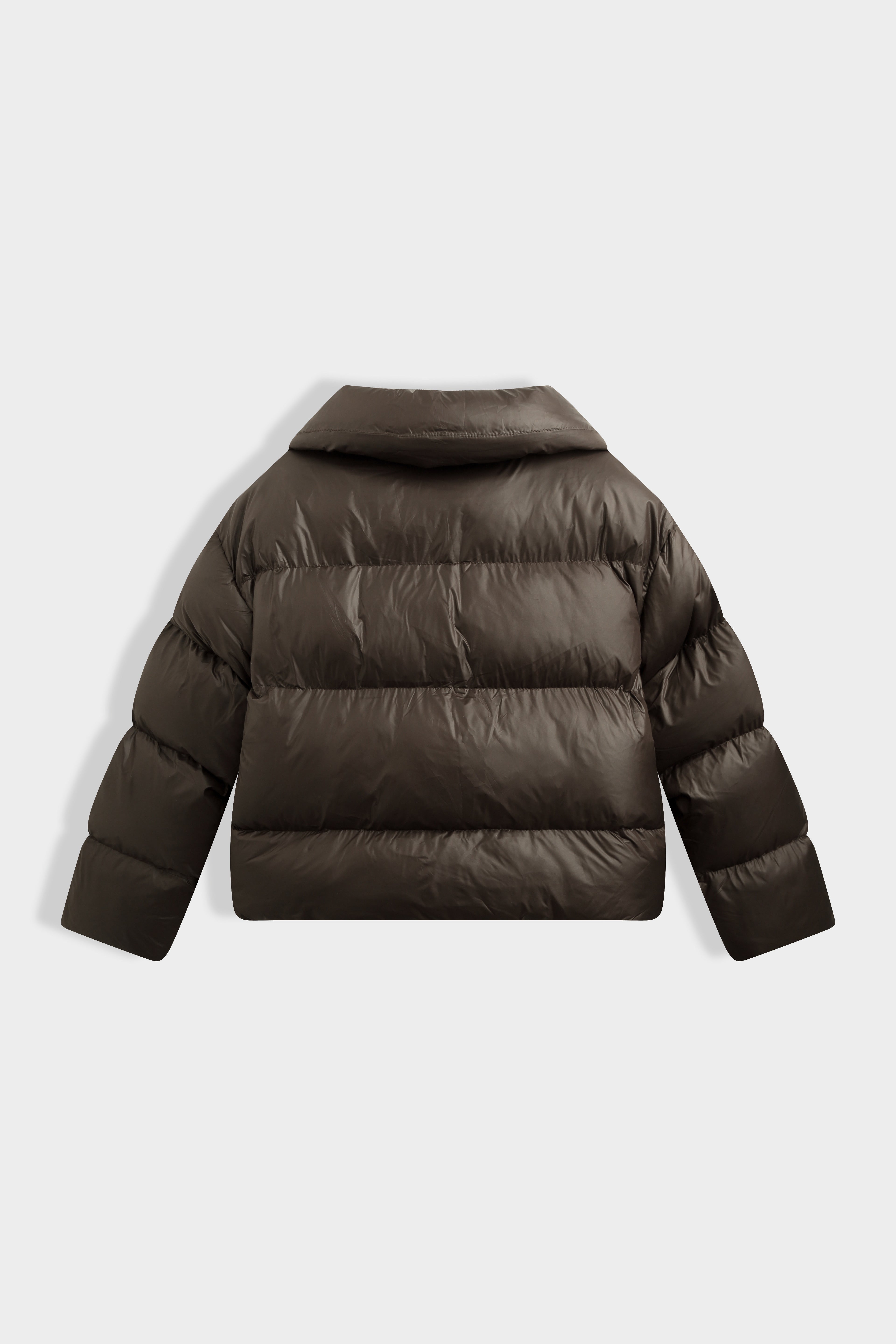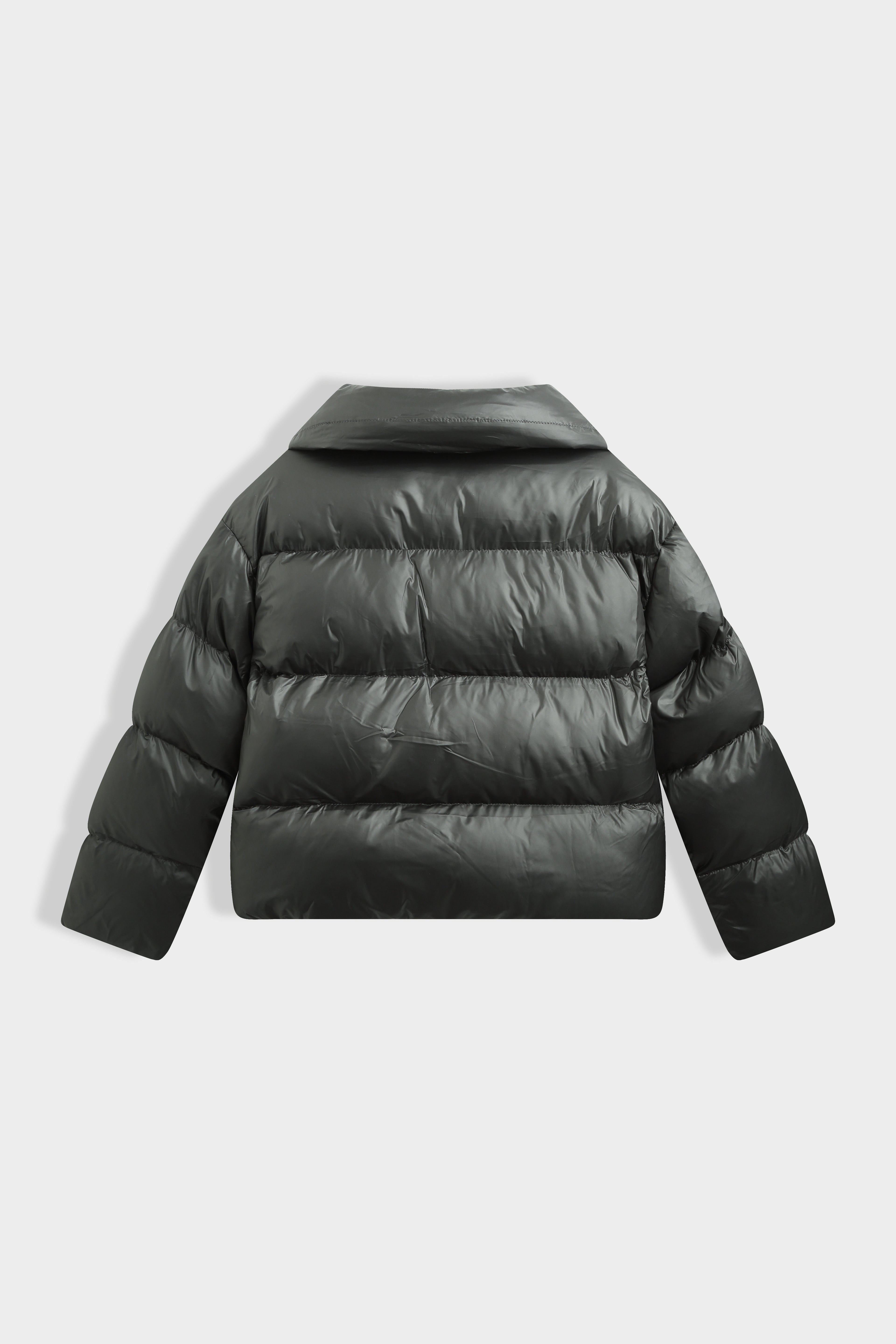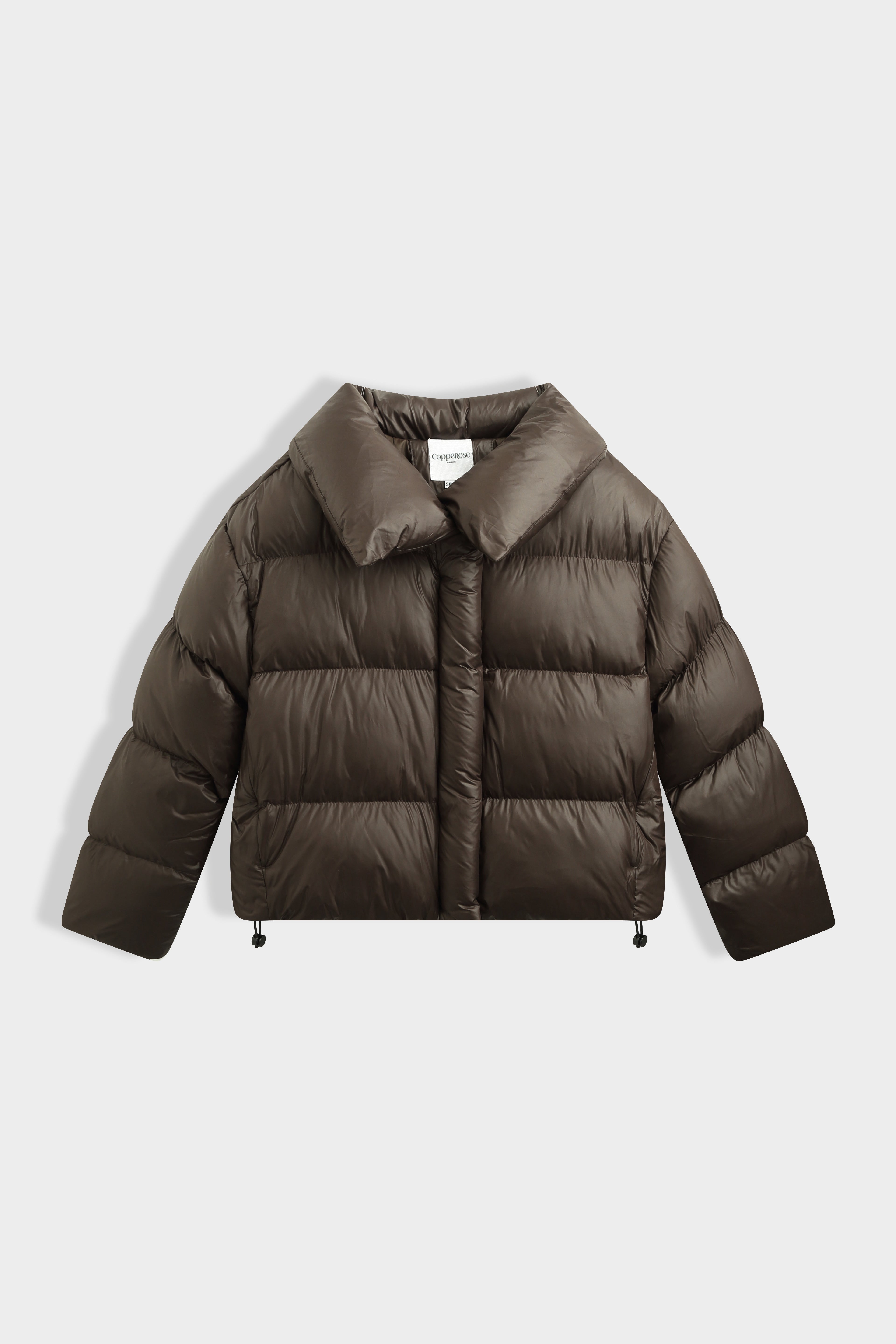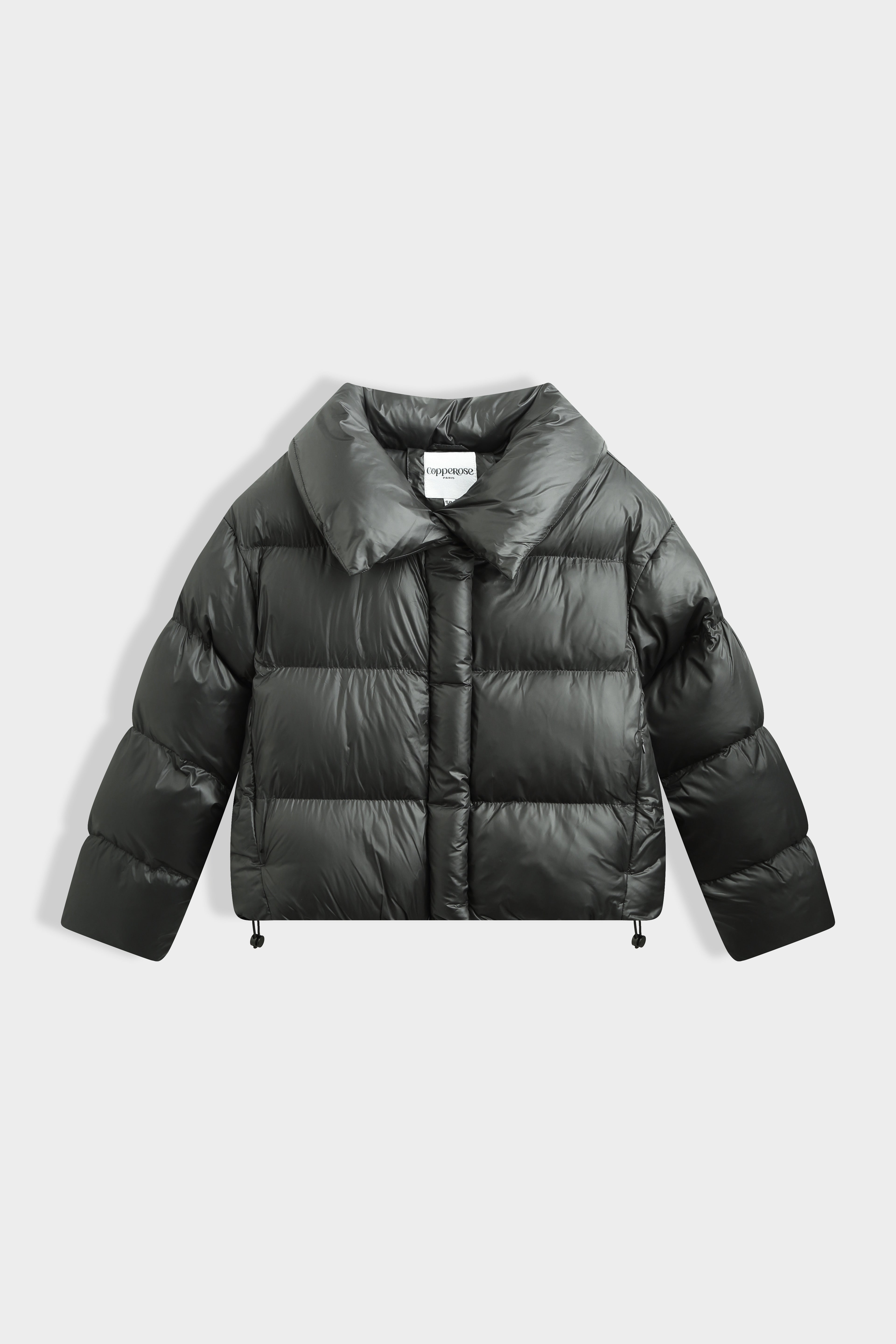 Doudoune courte à col large structuré. Fermeture par zip et boutons pression dissimulés. Poches latérales dans la couture. Bas ajustable par cordons élastiques avec stoppeurs. Finition mat légèrement brillante.