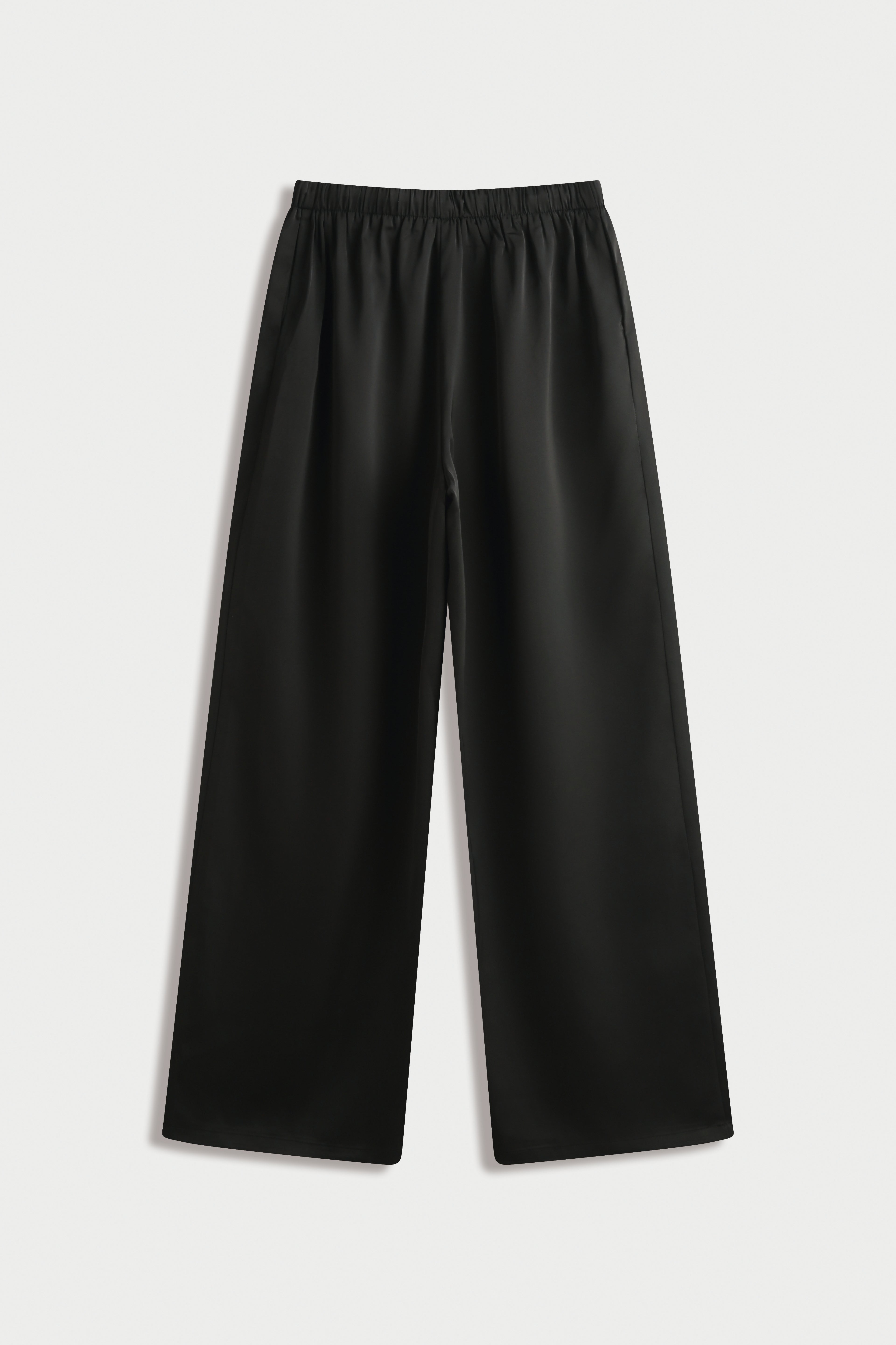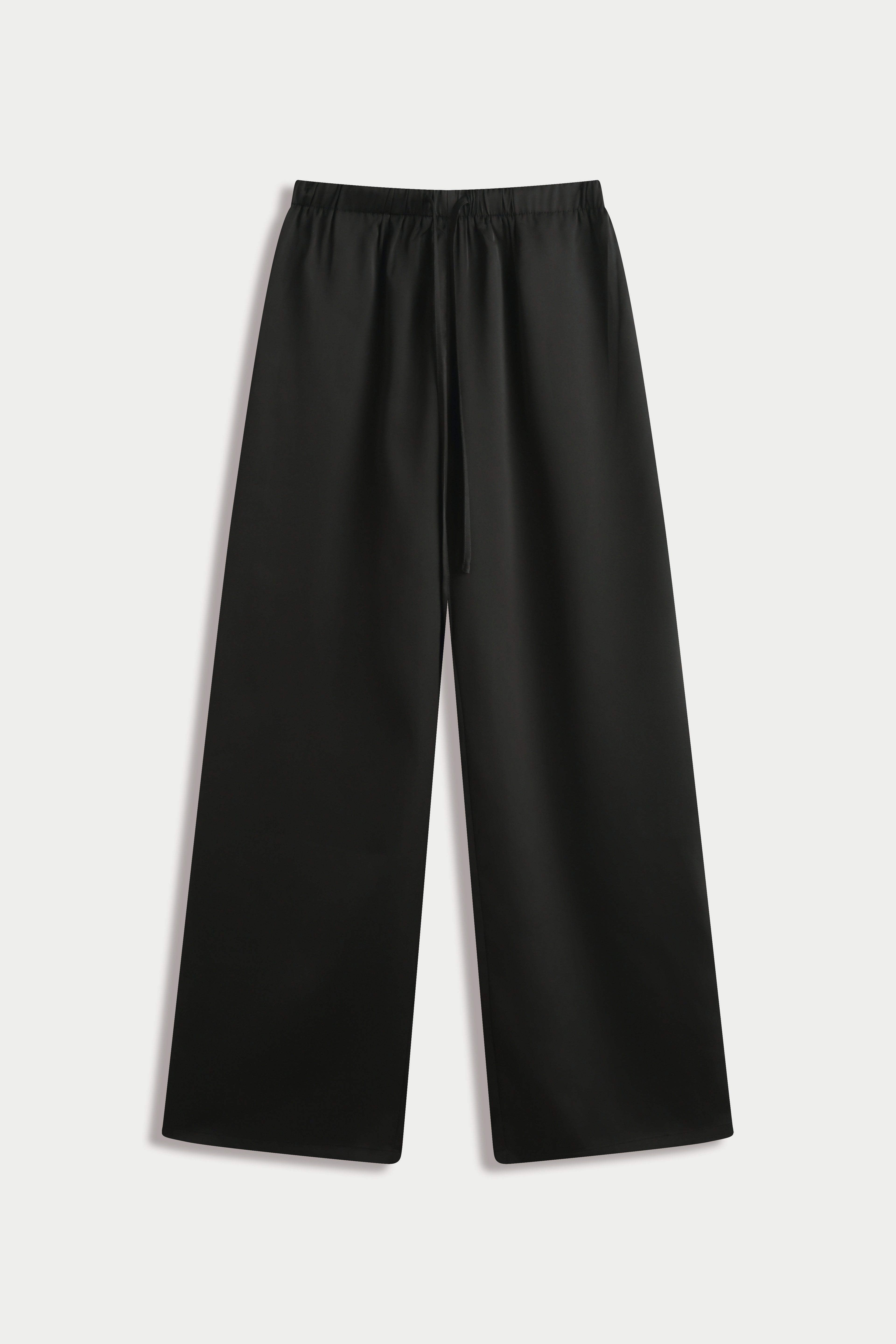 Pantalon large en satin fluide. Taille élastique avec lien ajustable, noué sur le devant. Poches côtés. Finition droite en bas de jambe.