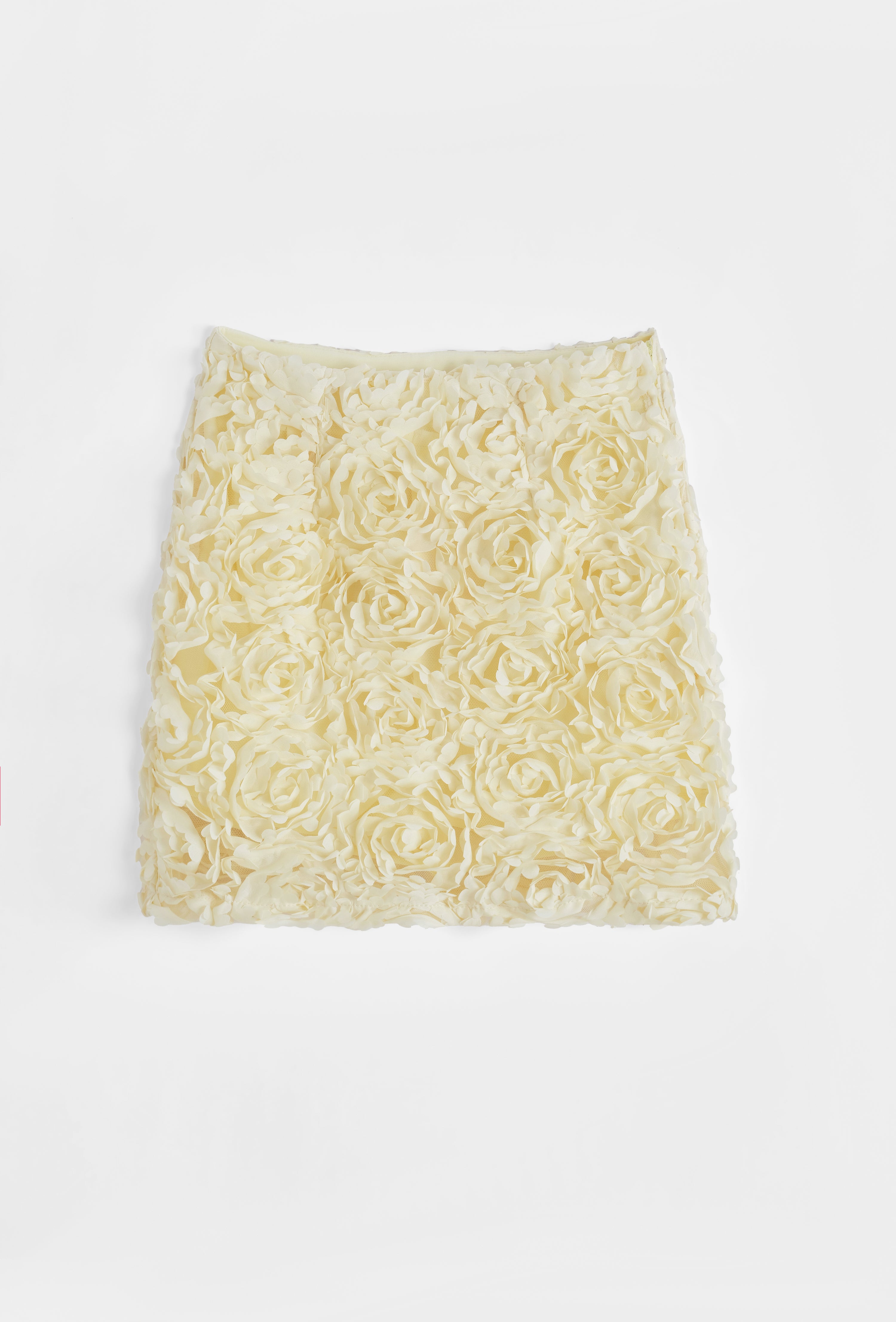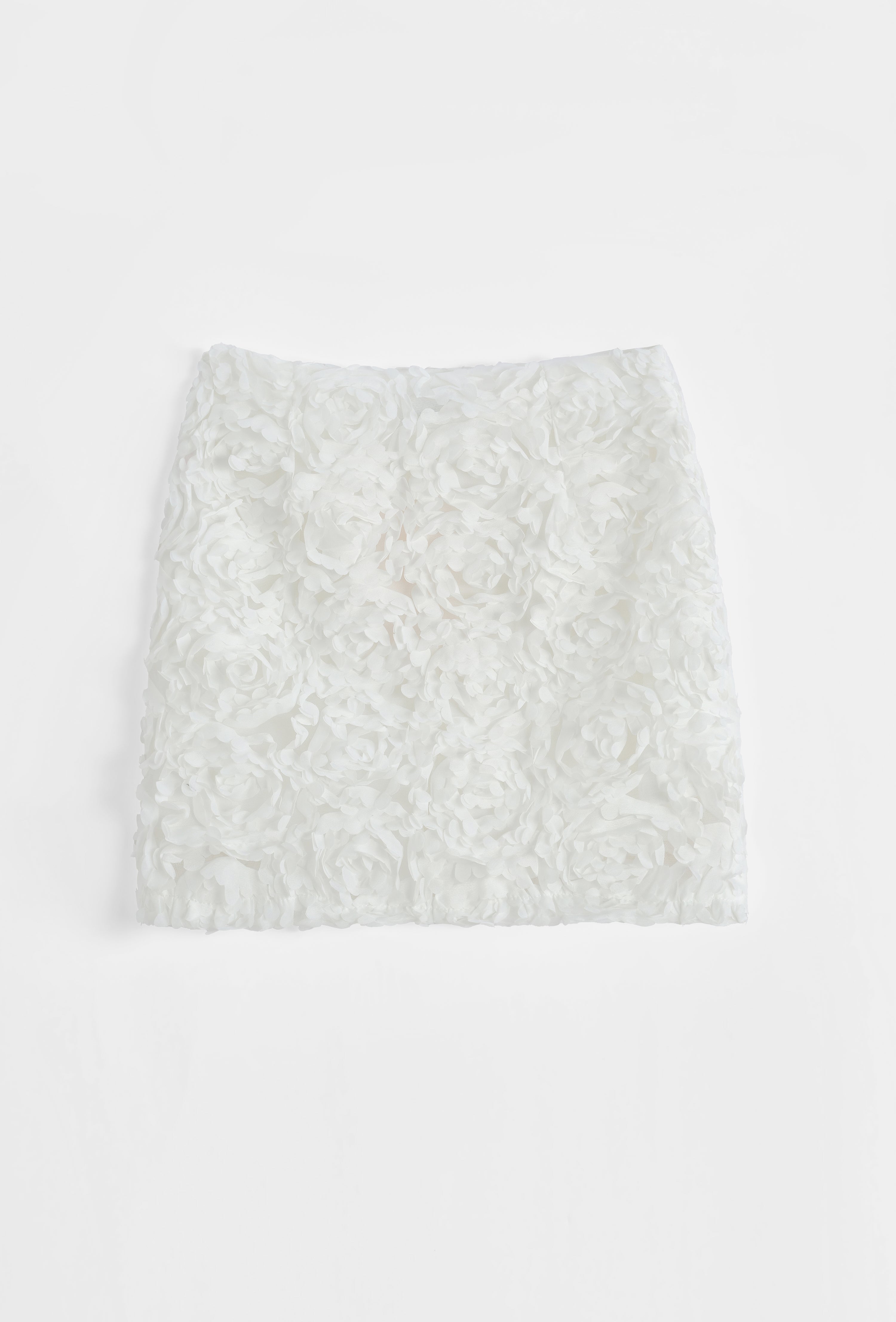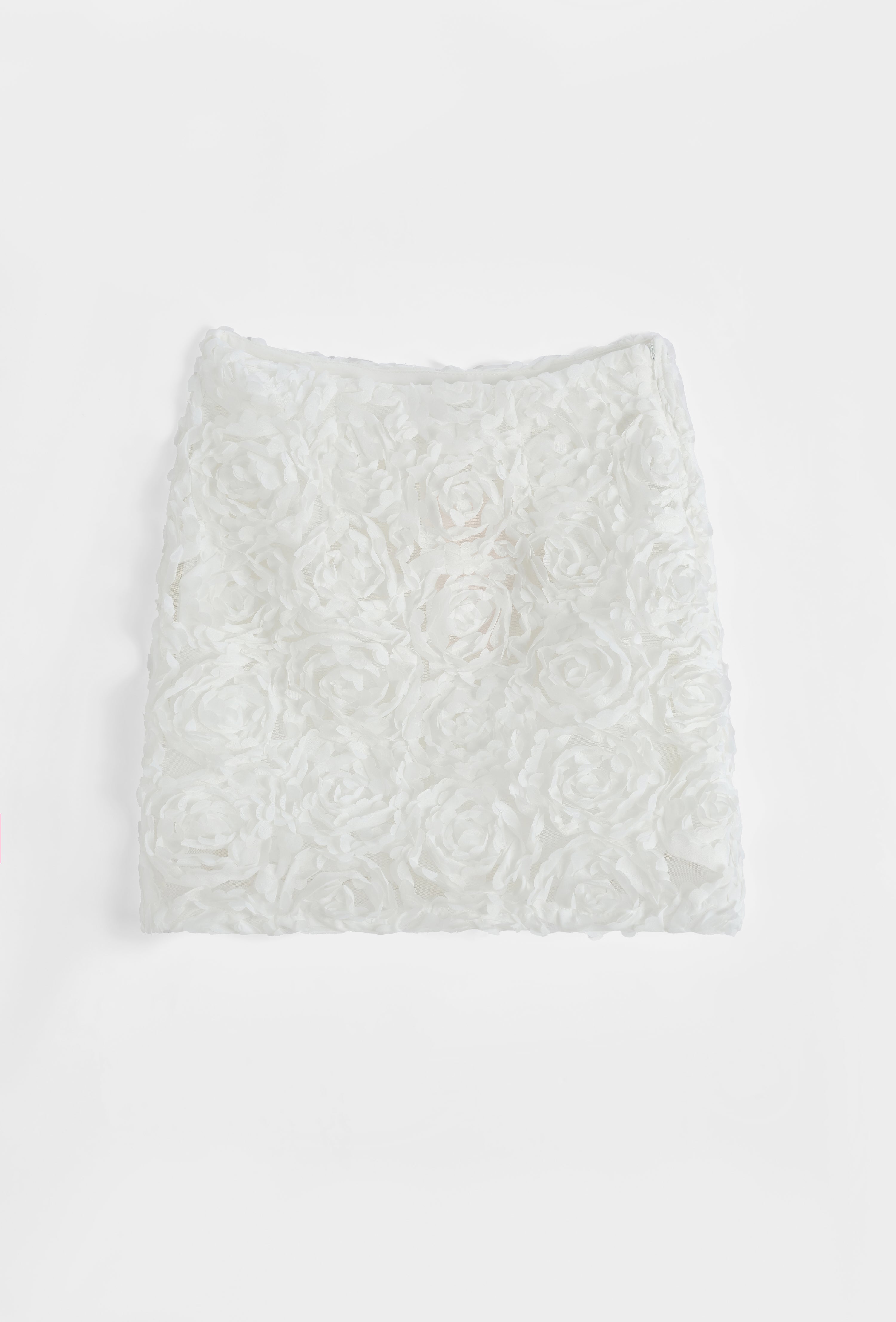 Jupe courte à taille haute structurée. Applications florales devant et derrière. Fermeture par zip invisible sur le côté. Doublure.