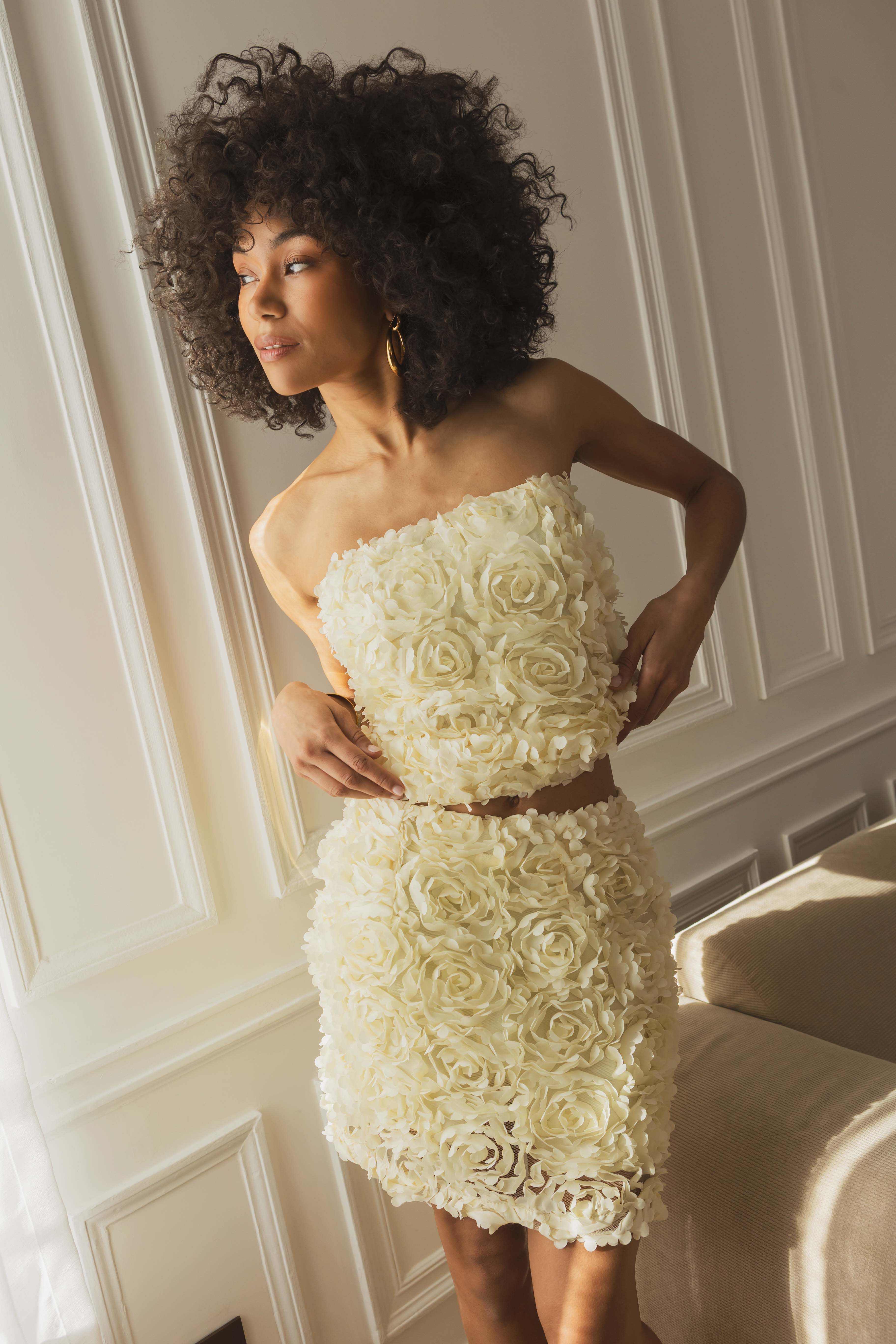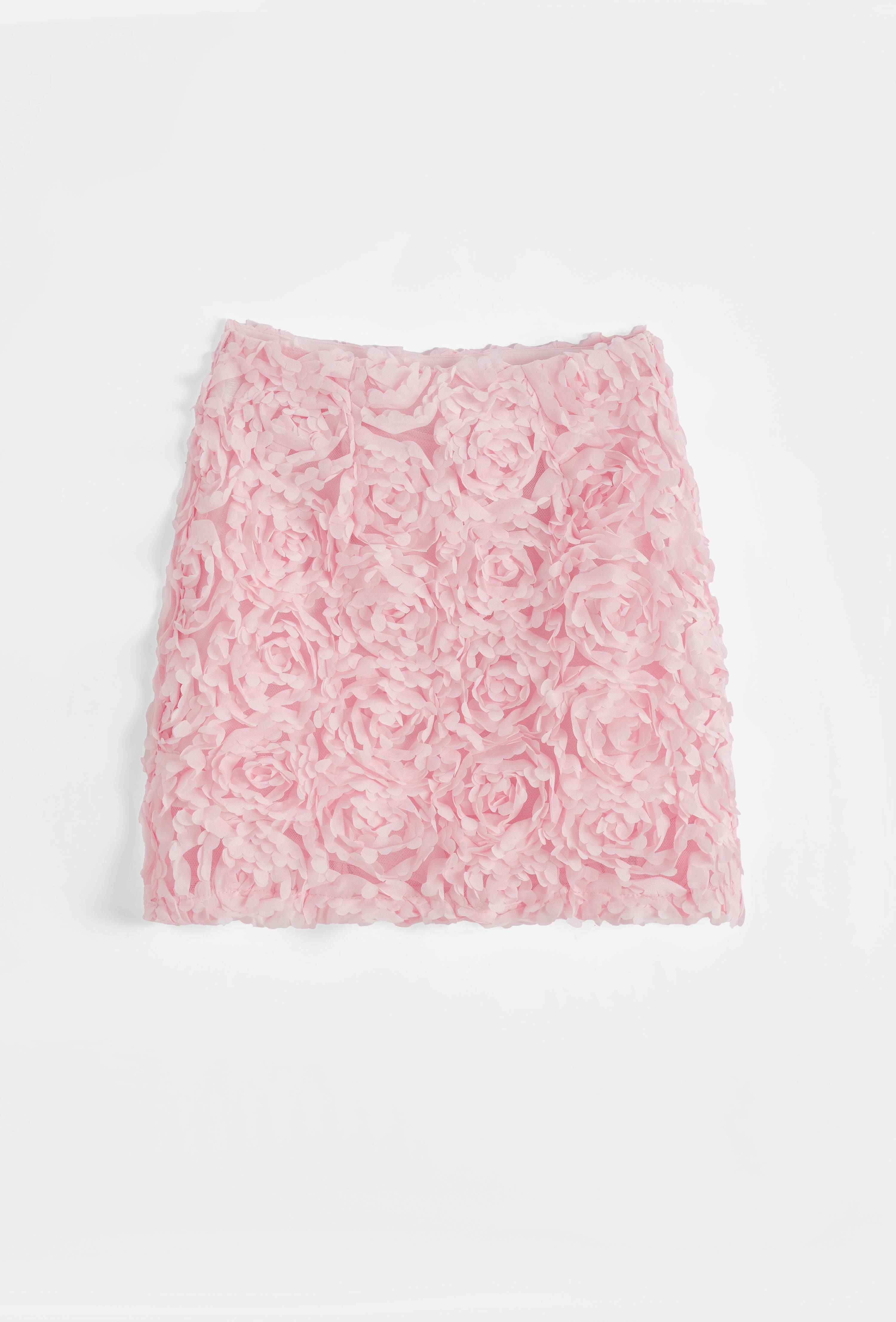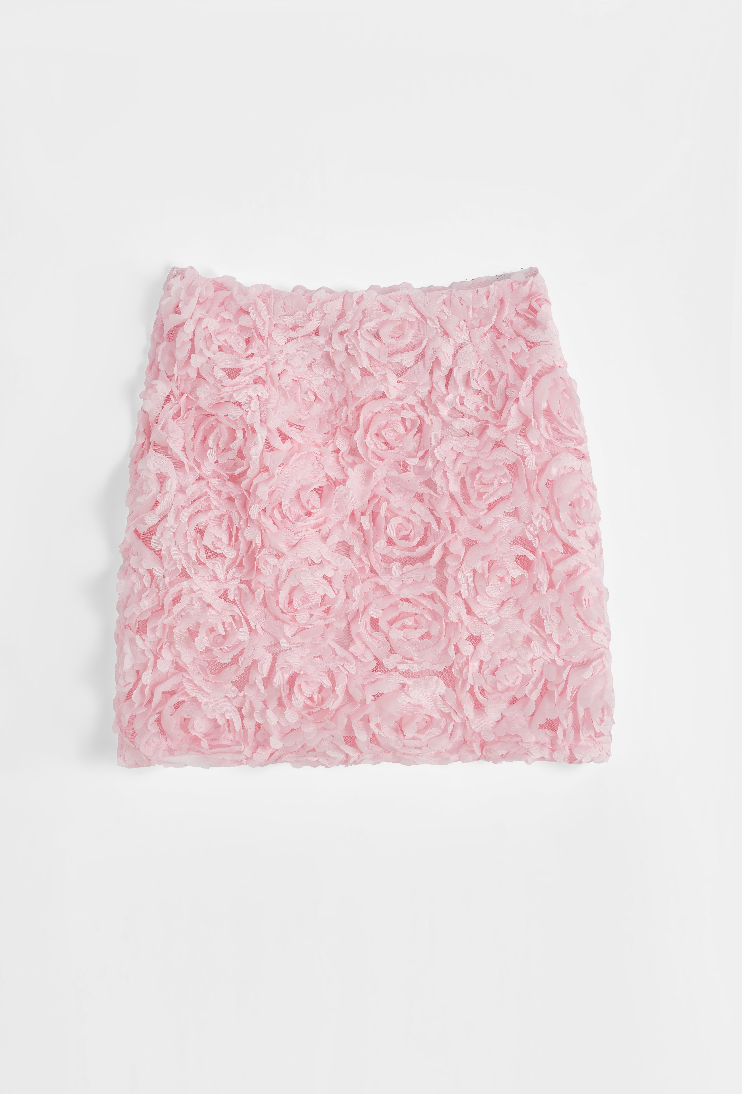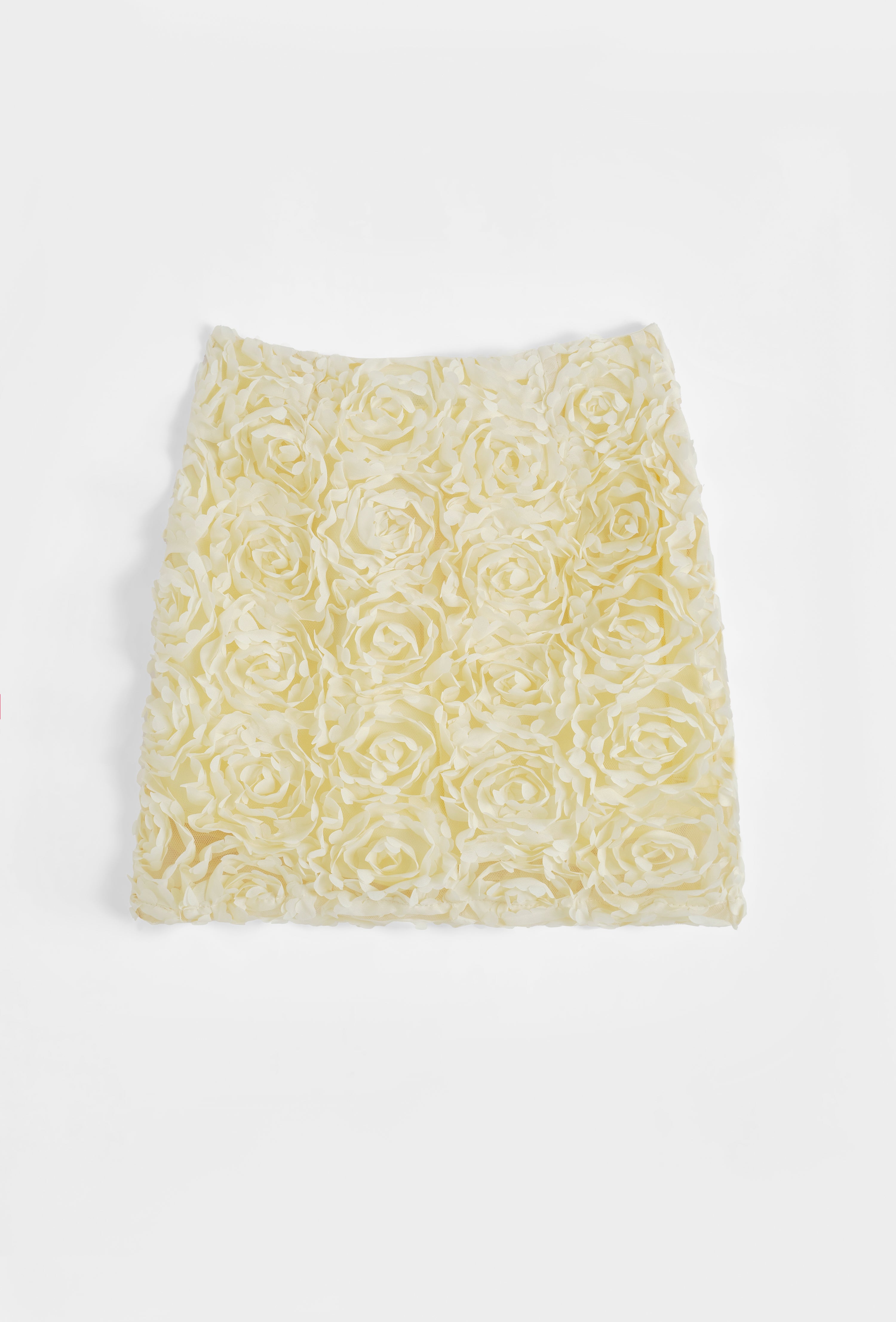Jupe courte à taille haute structurée. Applications florales devant et derrière. Fermeture par zip invisible sur le côté. Doublure.