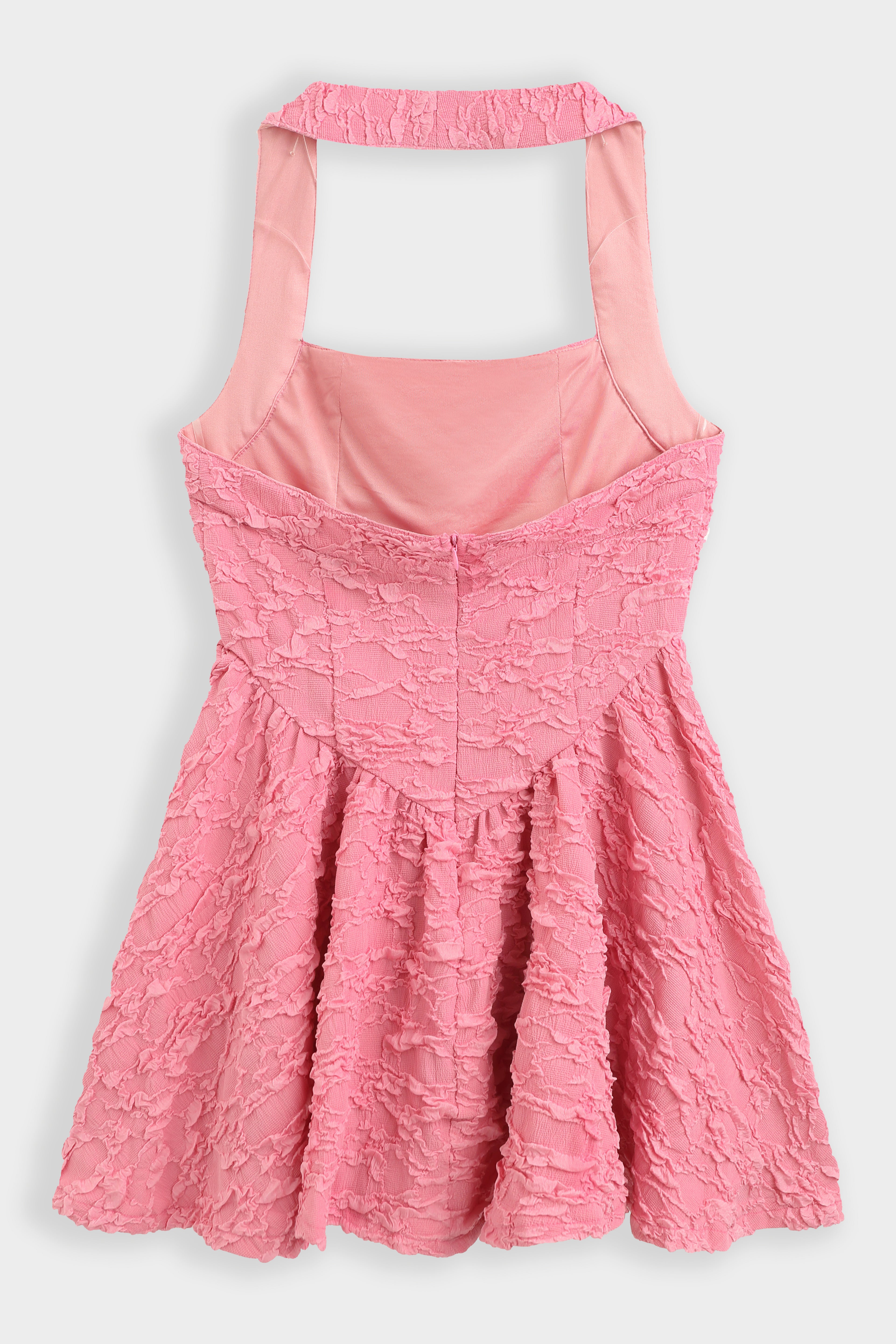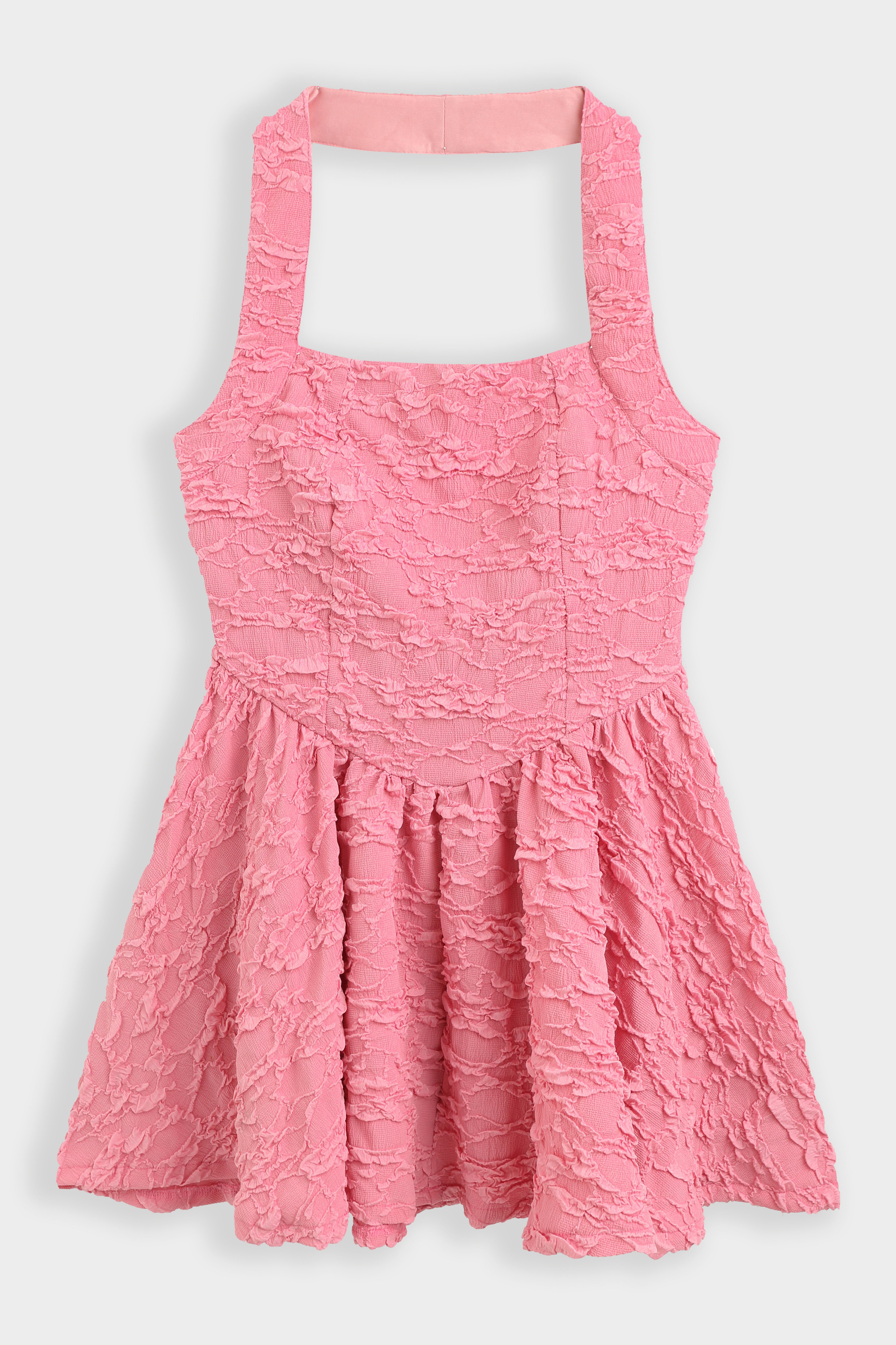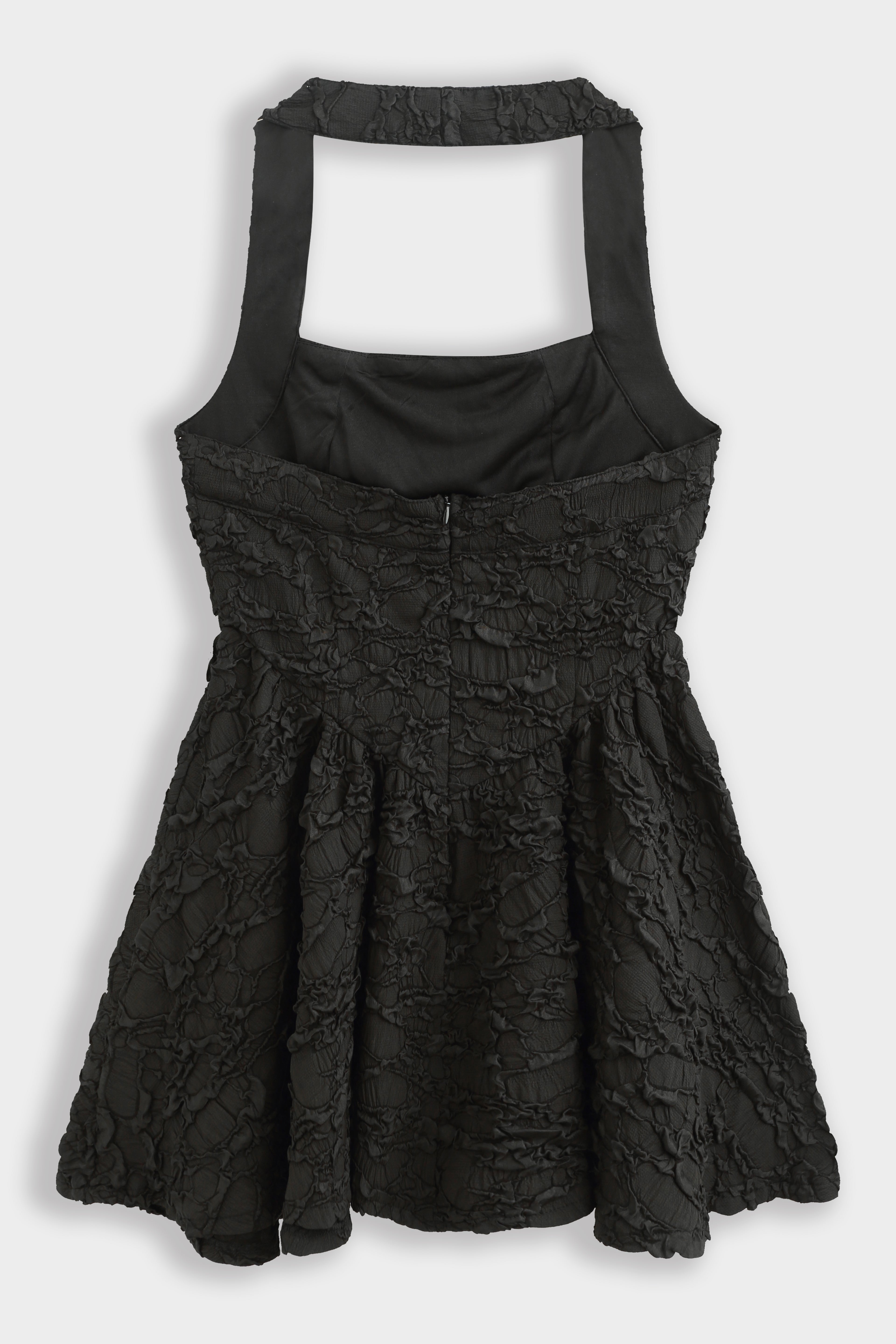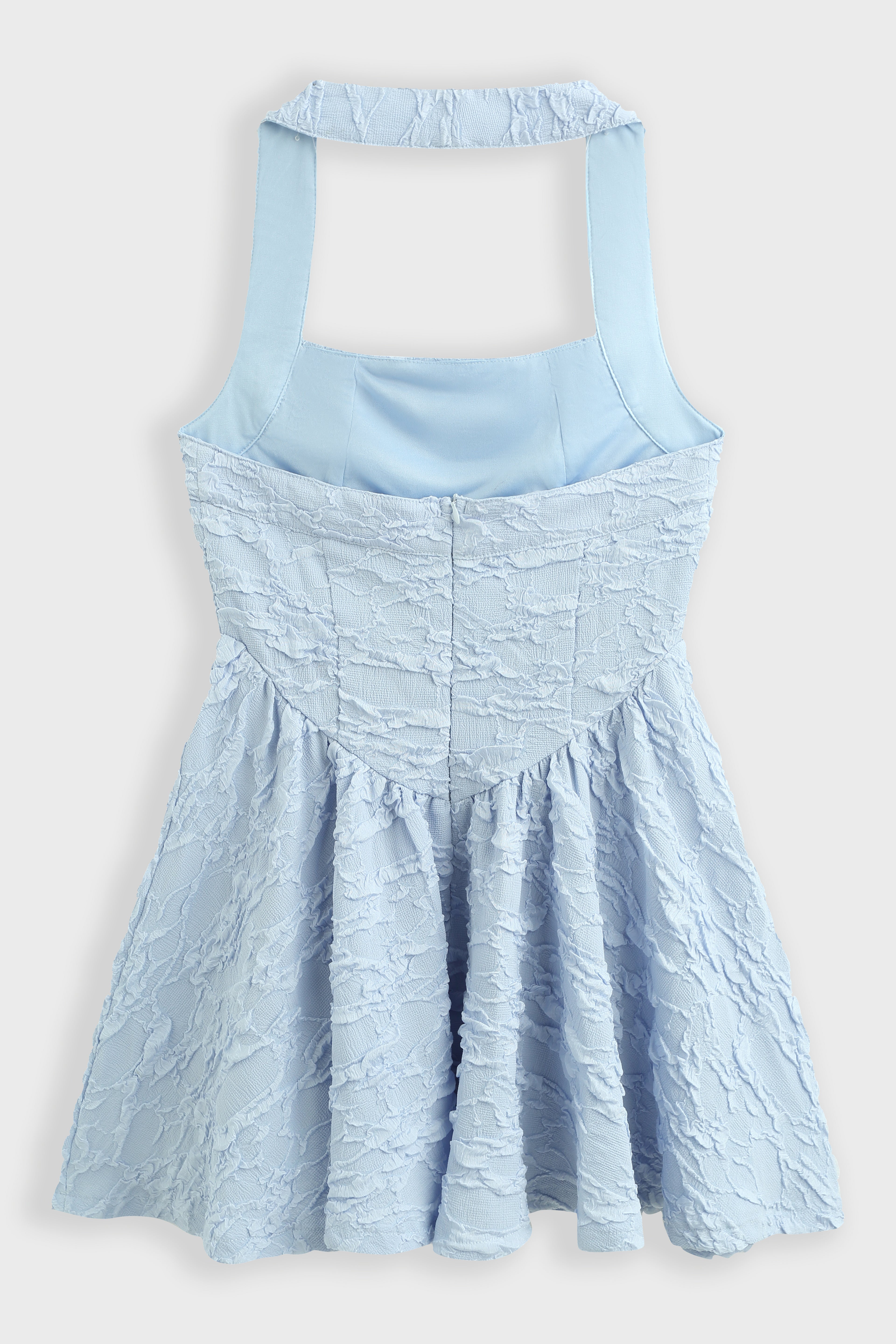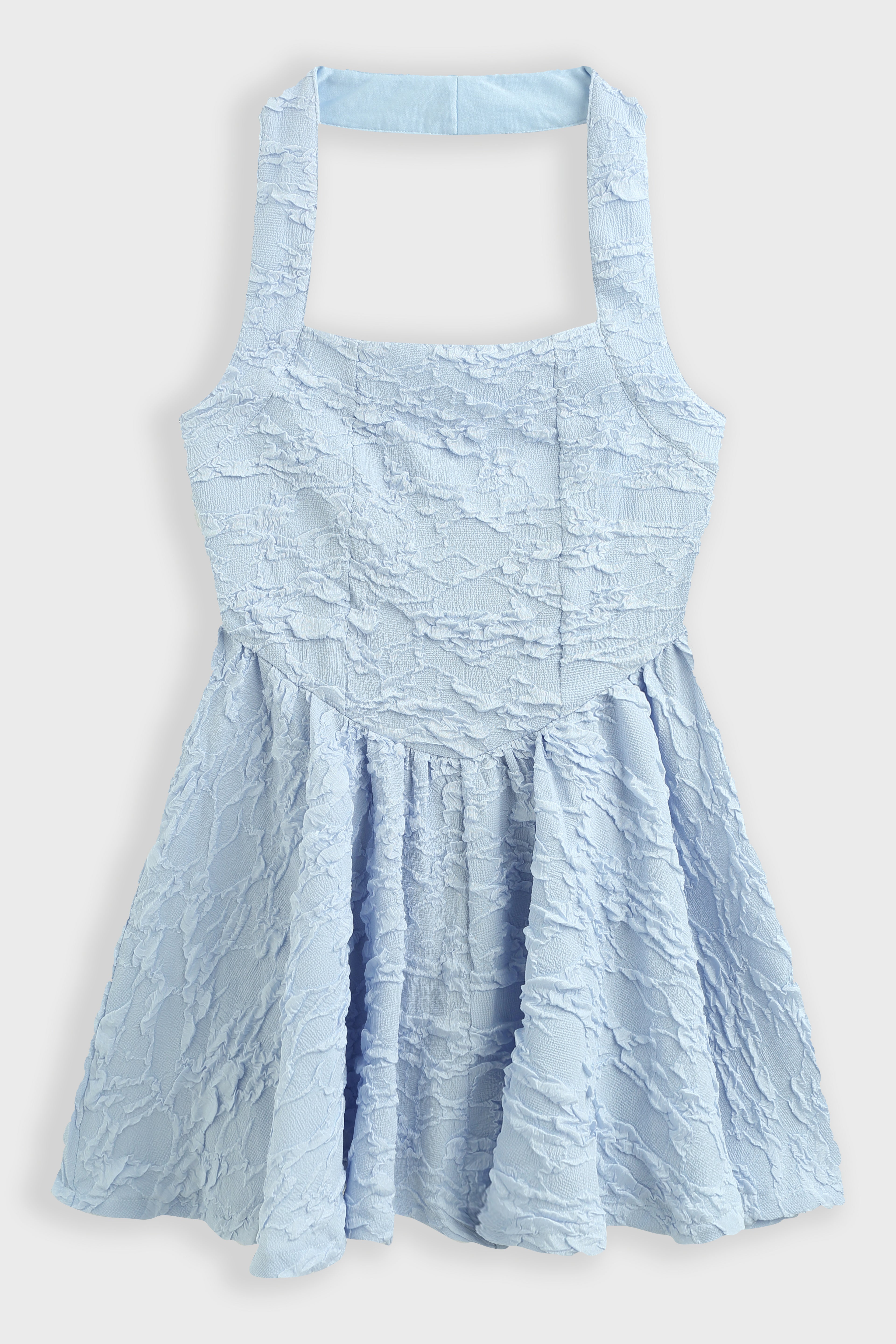 Robe mini évasée en tissu texturé effet froissé avec encolure carrée et large bretelle tour de cou.Corsage avec découpe en pointe à la taille et jupe froncée. Fermeture à glissière dissimulée dans le dos. (idéal pour les petites)