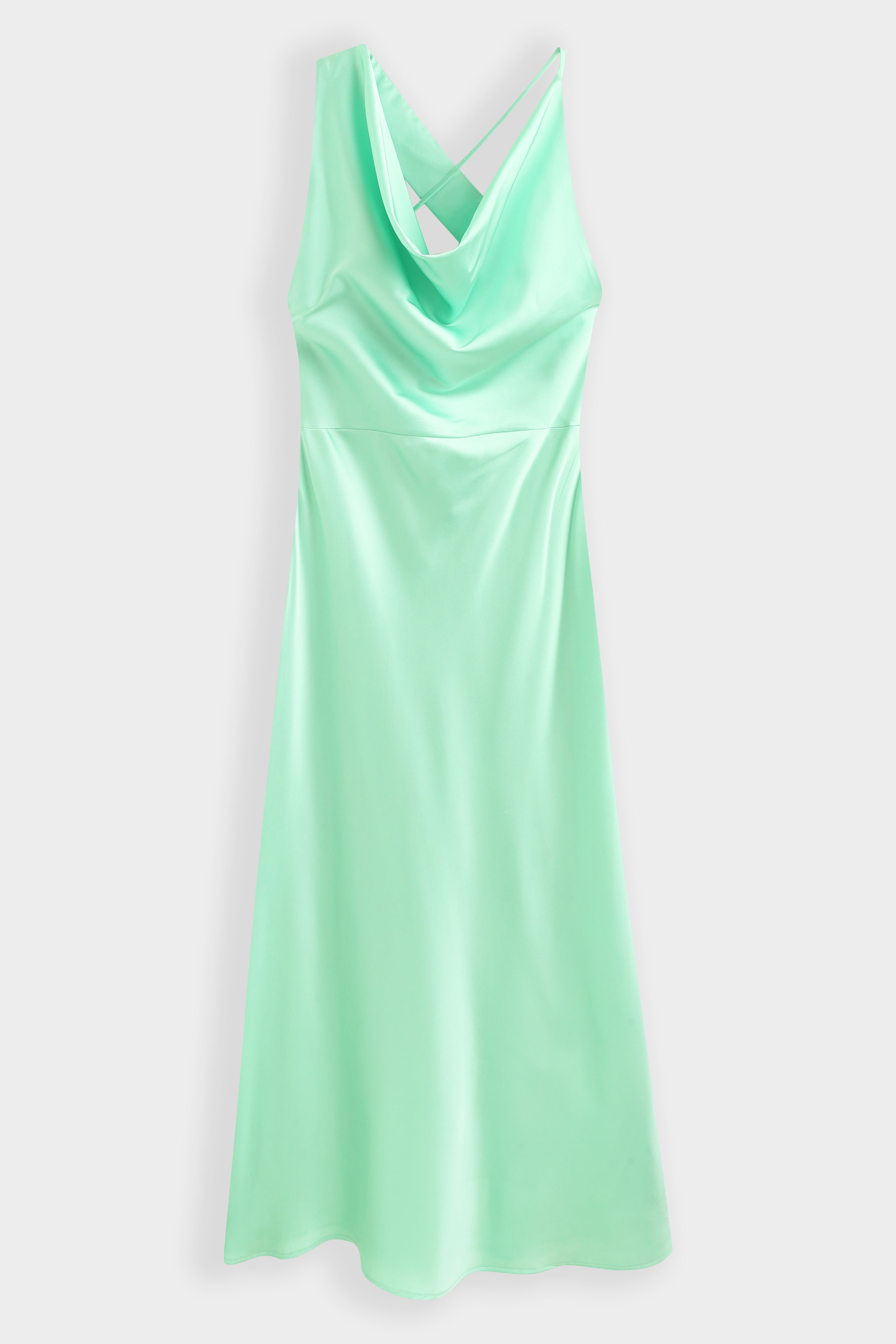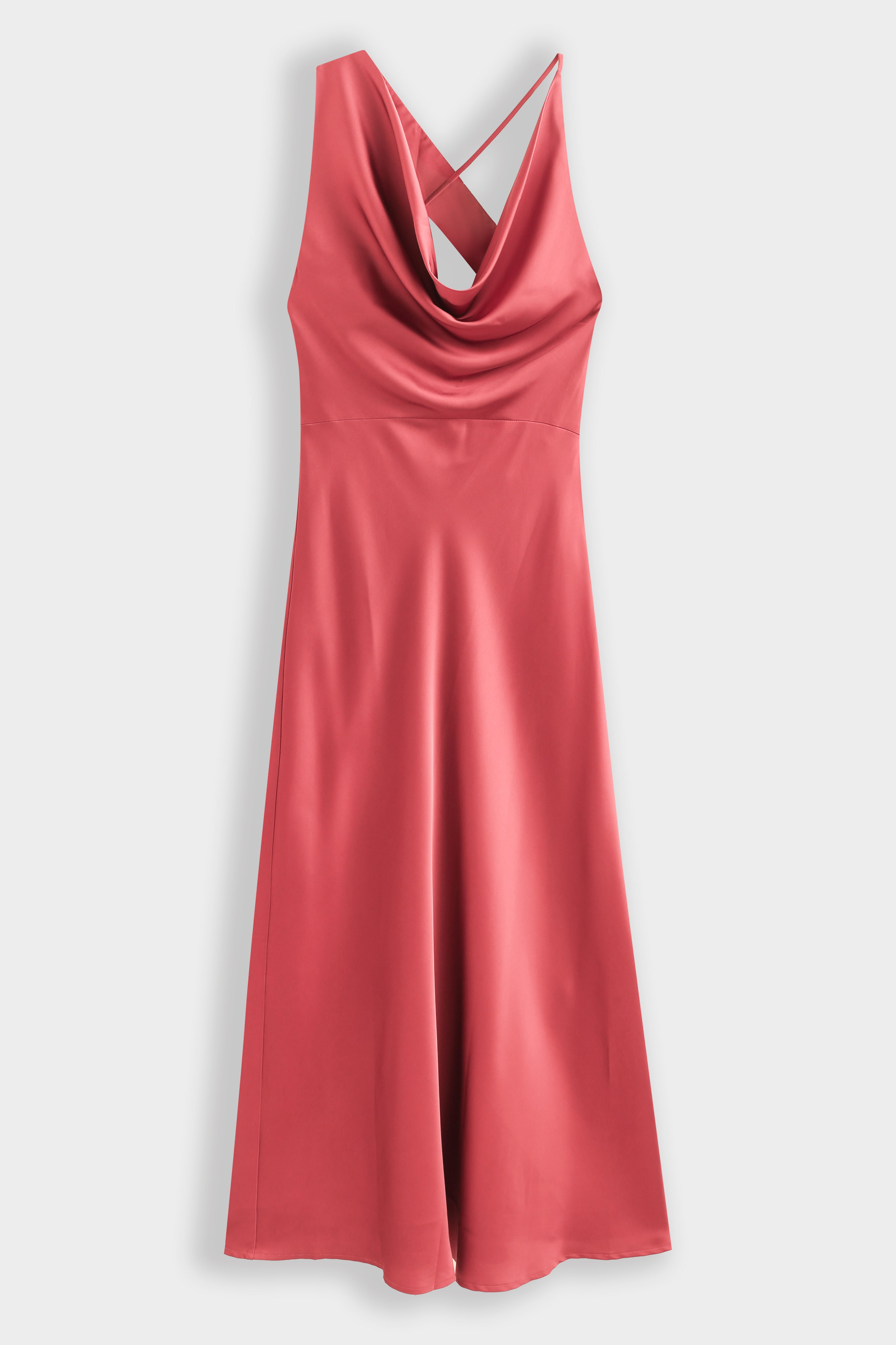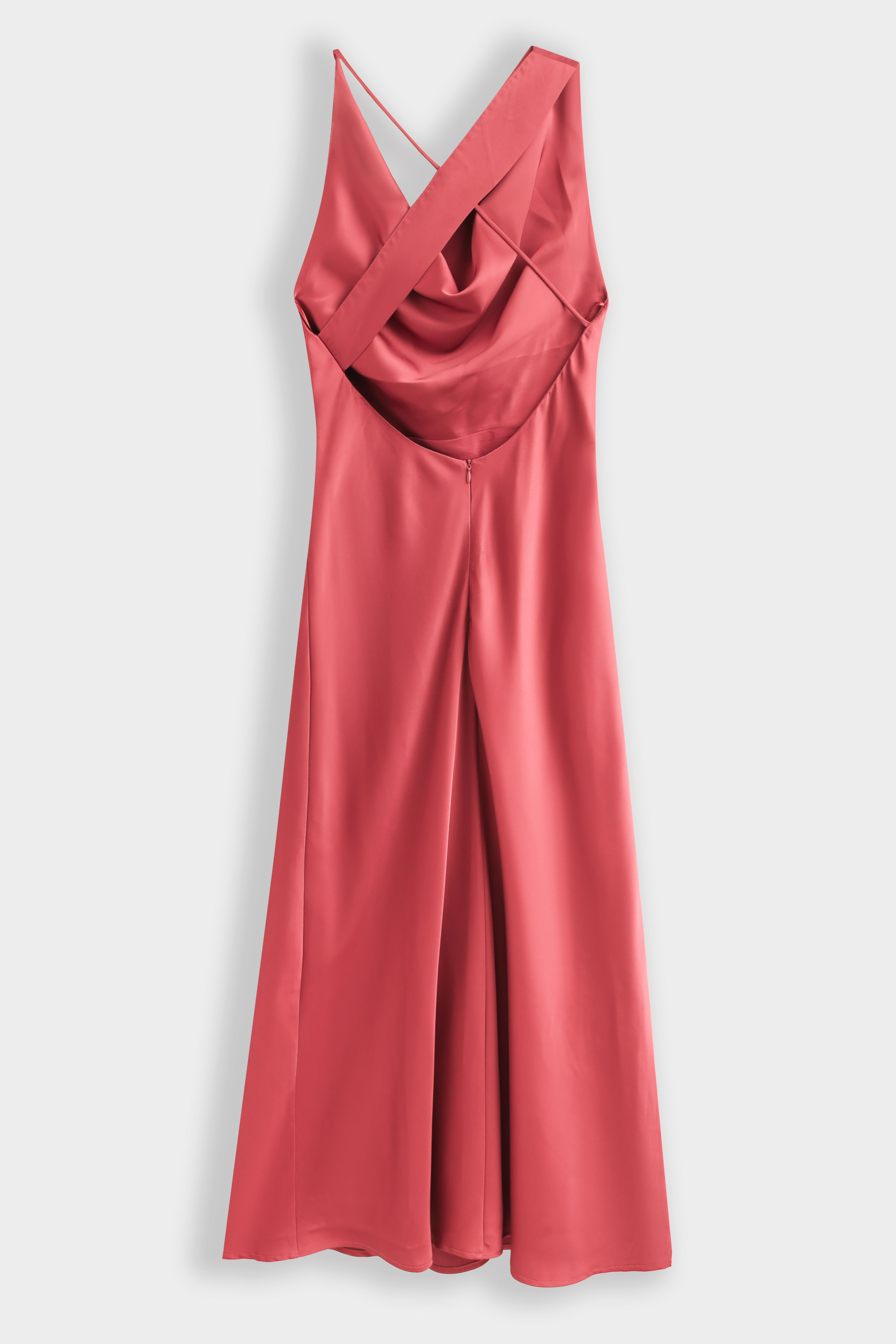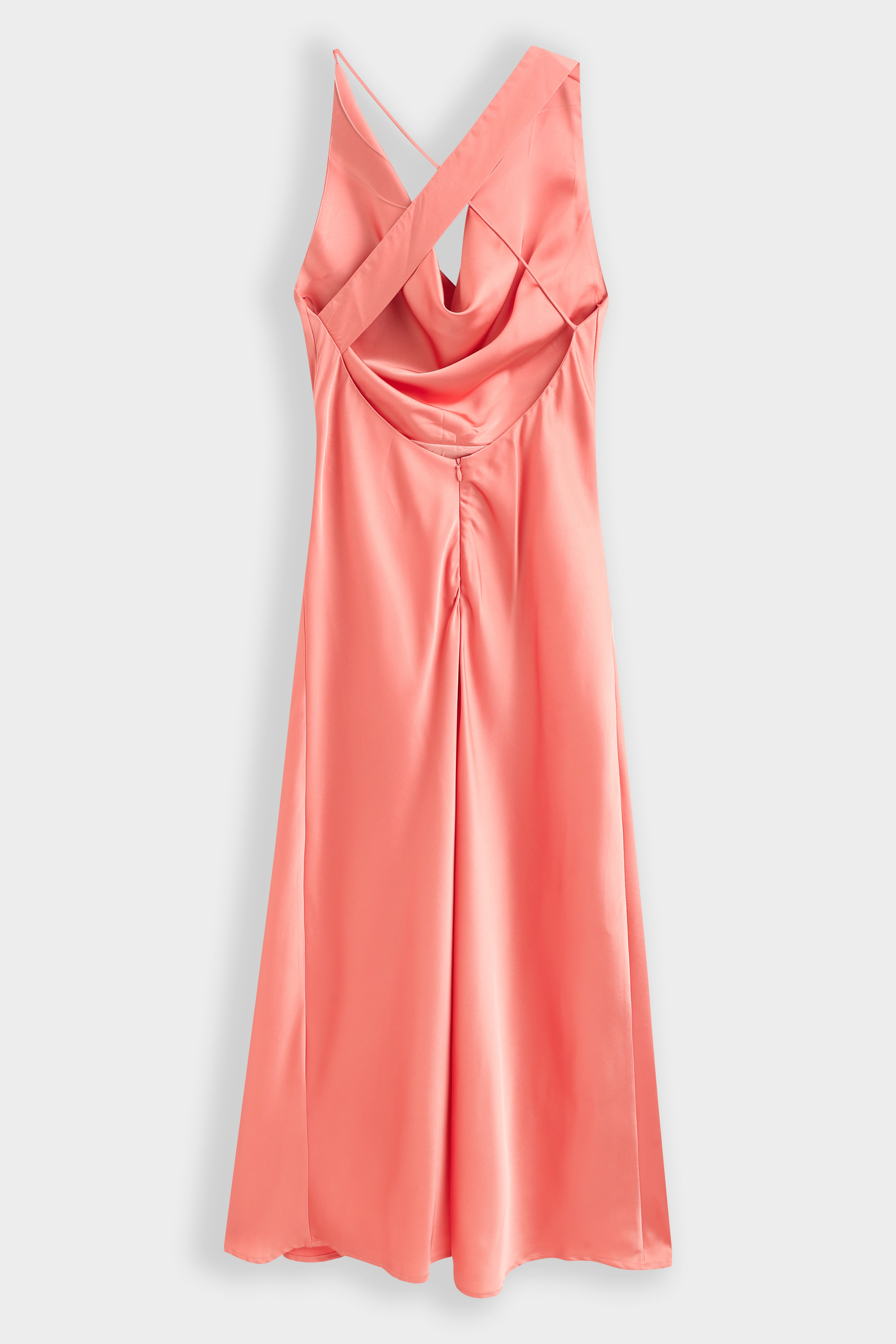 Robe longue en satin avec col bénitier. Dos nu plongeant est doté d'un jeu de bretelles asymétriques croisées. Fermeture à glissière dissimulée à l'arrière.