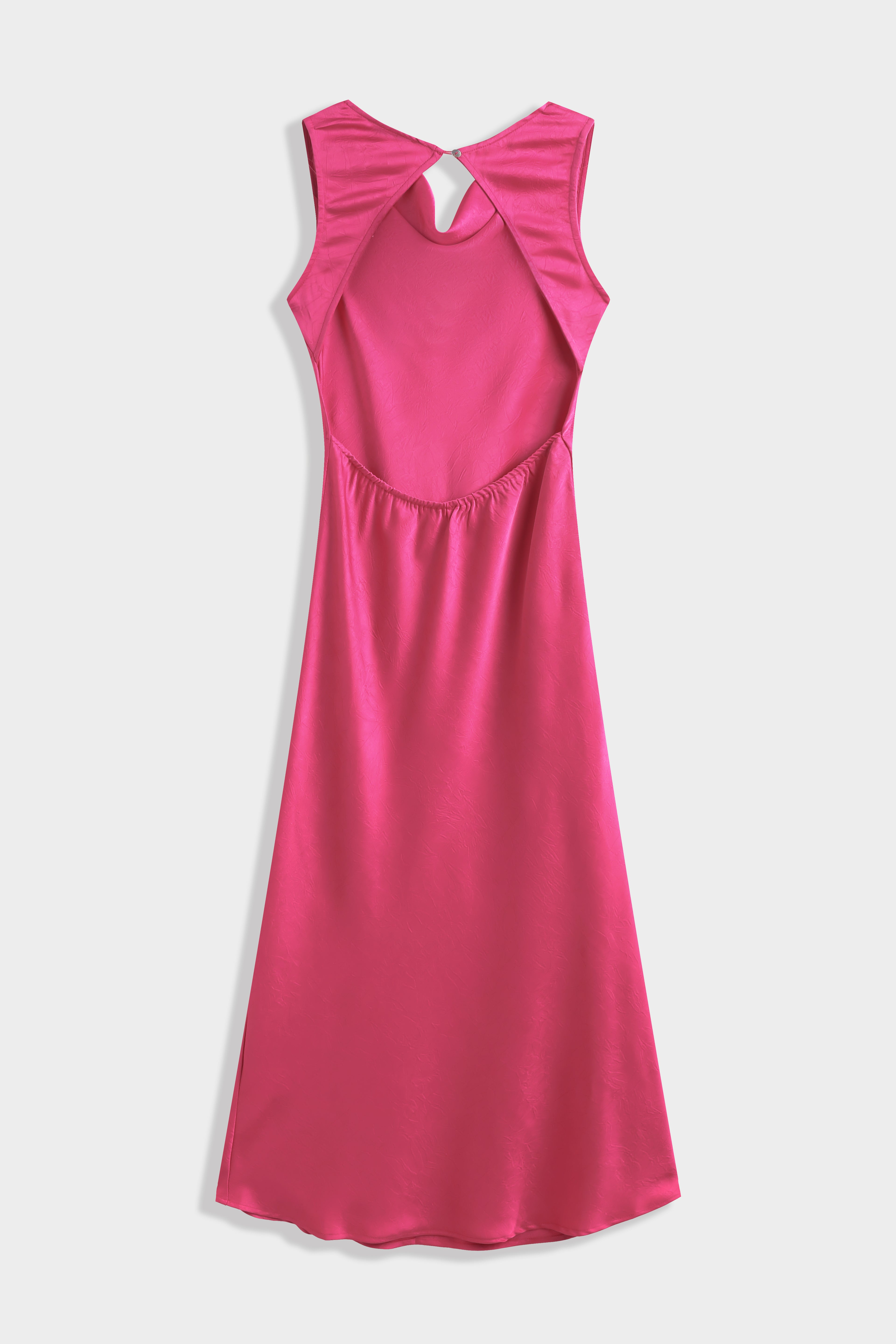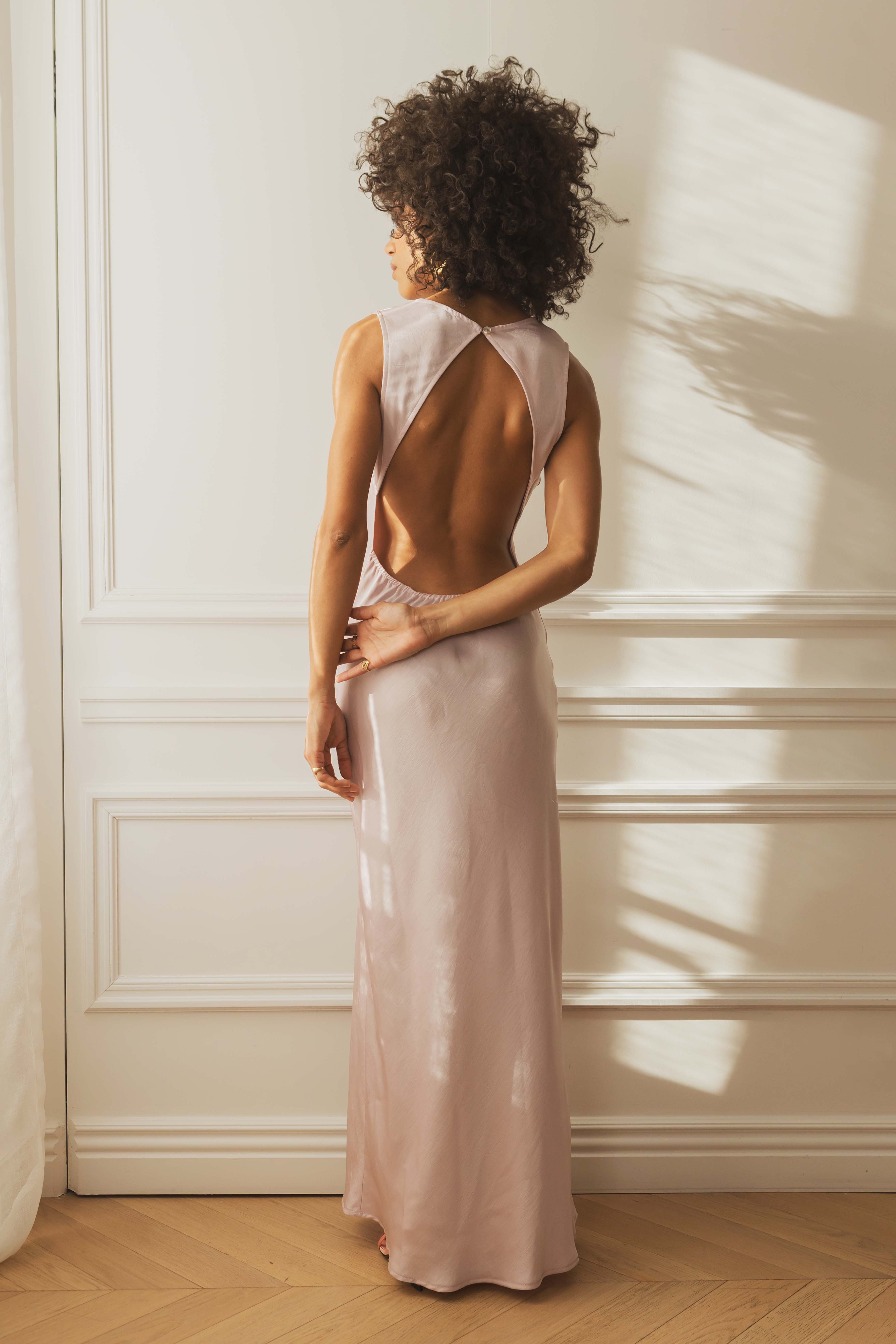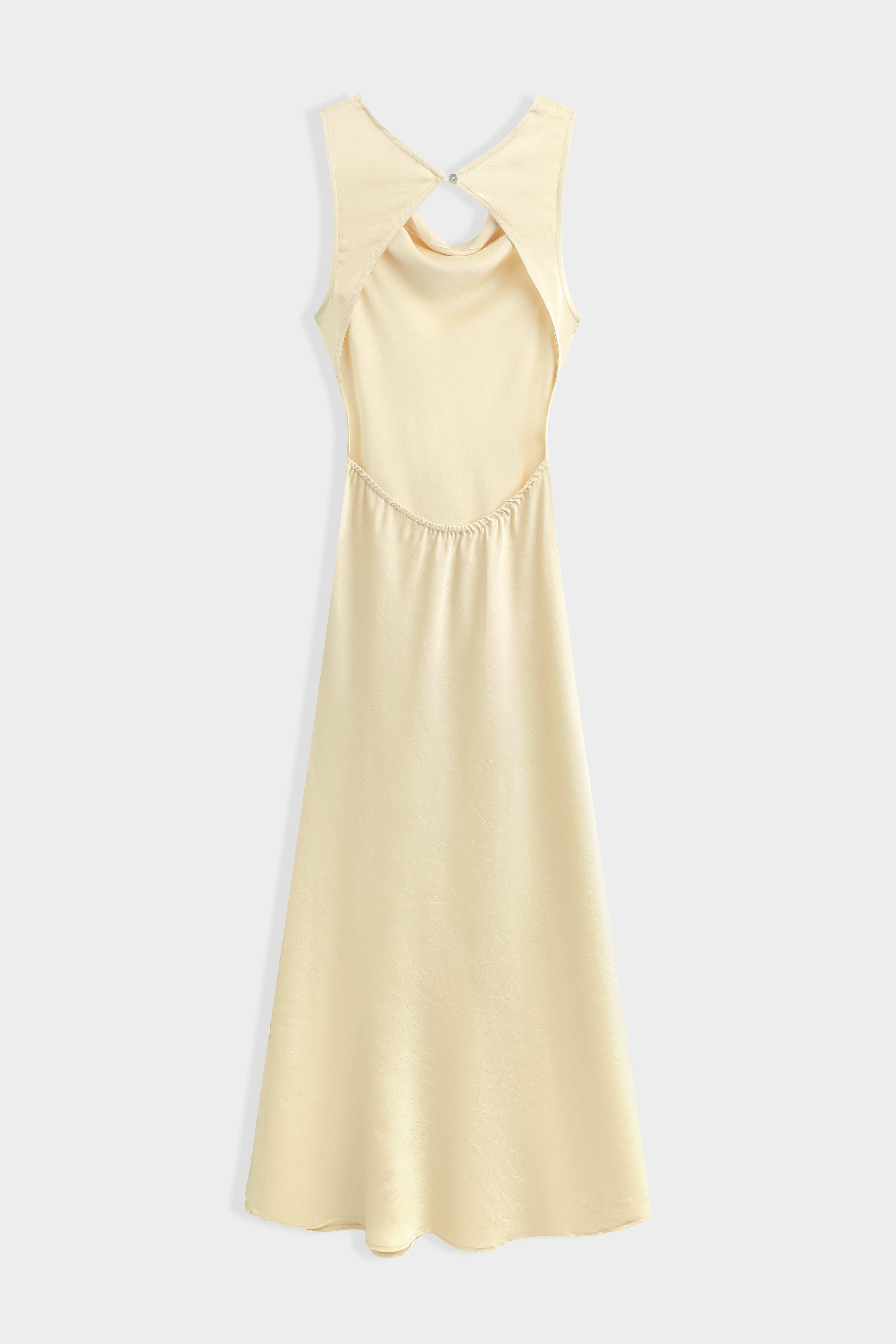 Robe longue sans manches confectionnée en tissu satiné légèrement texturé avec un effet froissé. Encolure drapée avec détail ajouré au dos. Fermeture par bouton au niveau de la nuque.