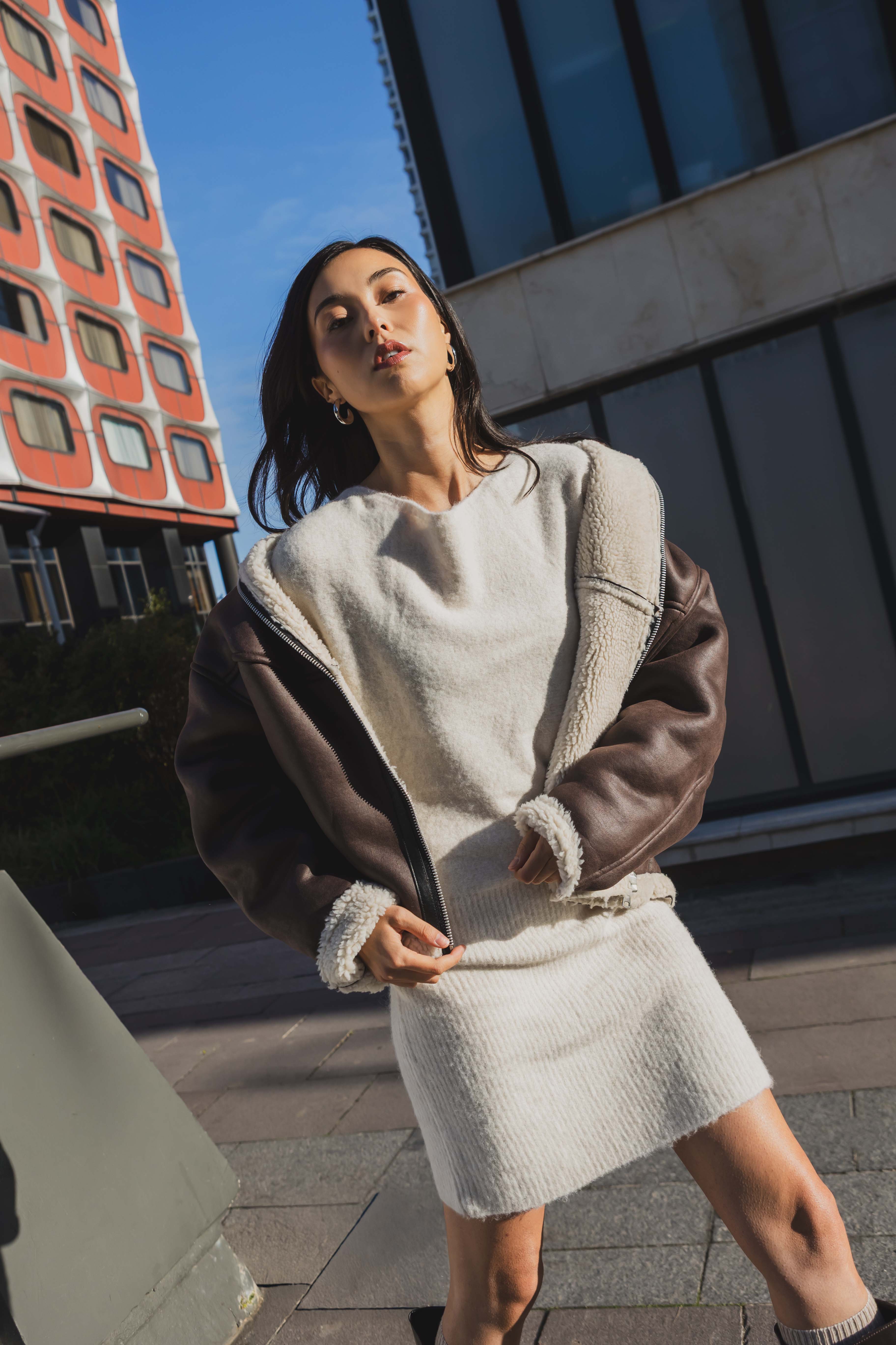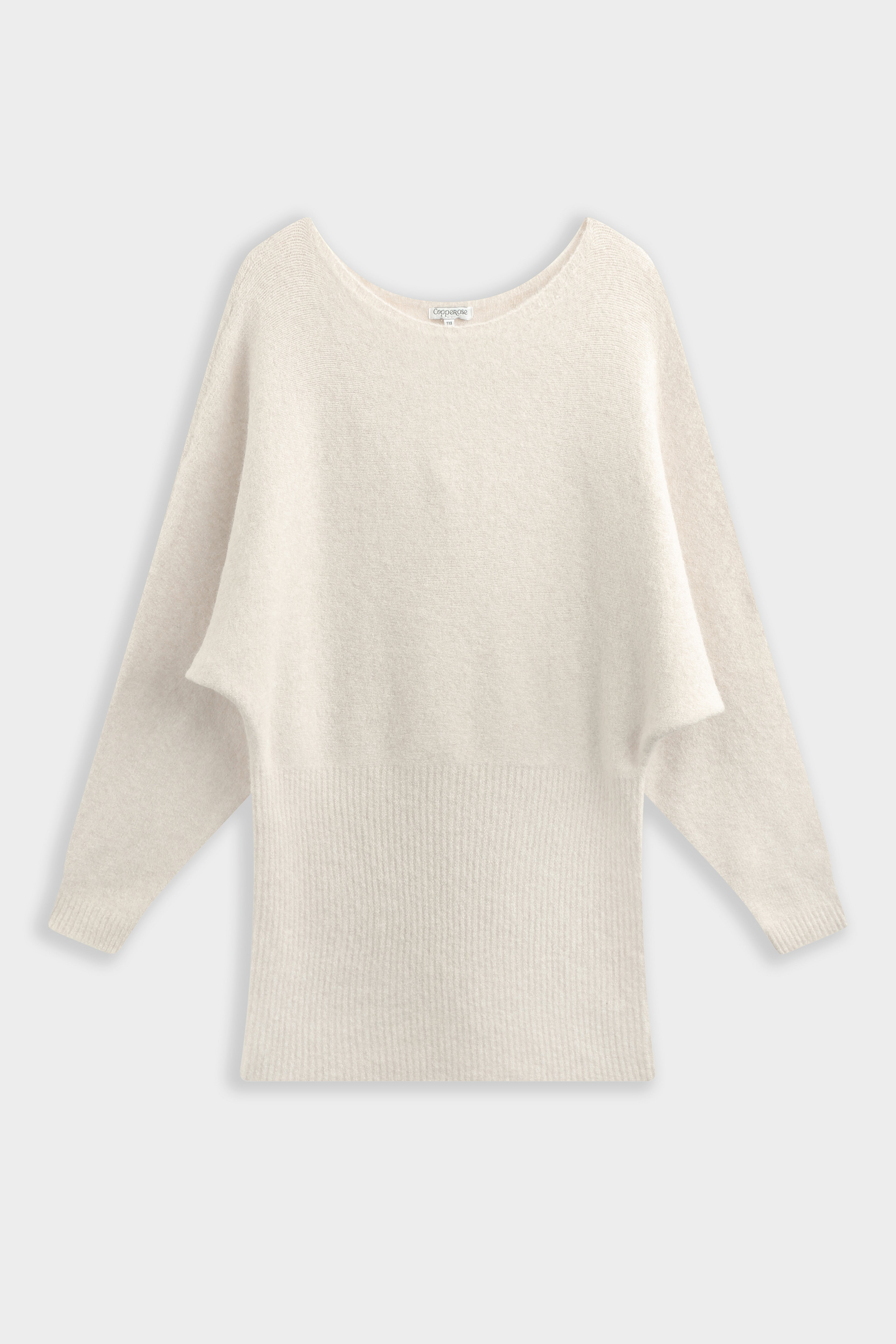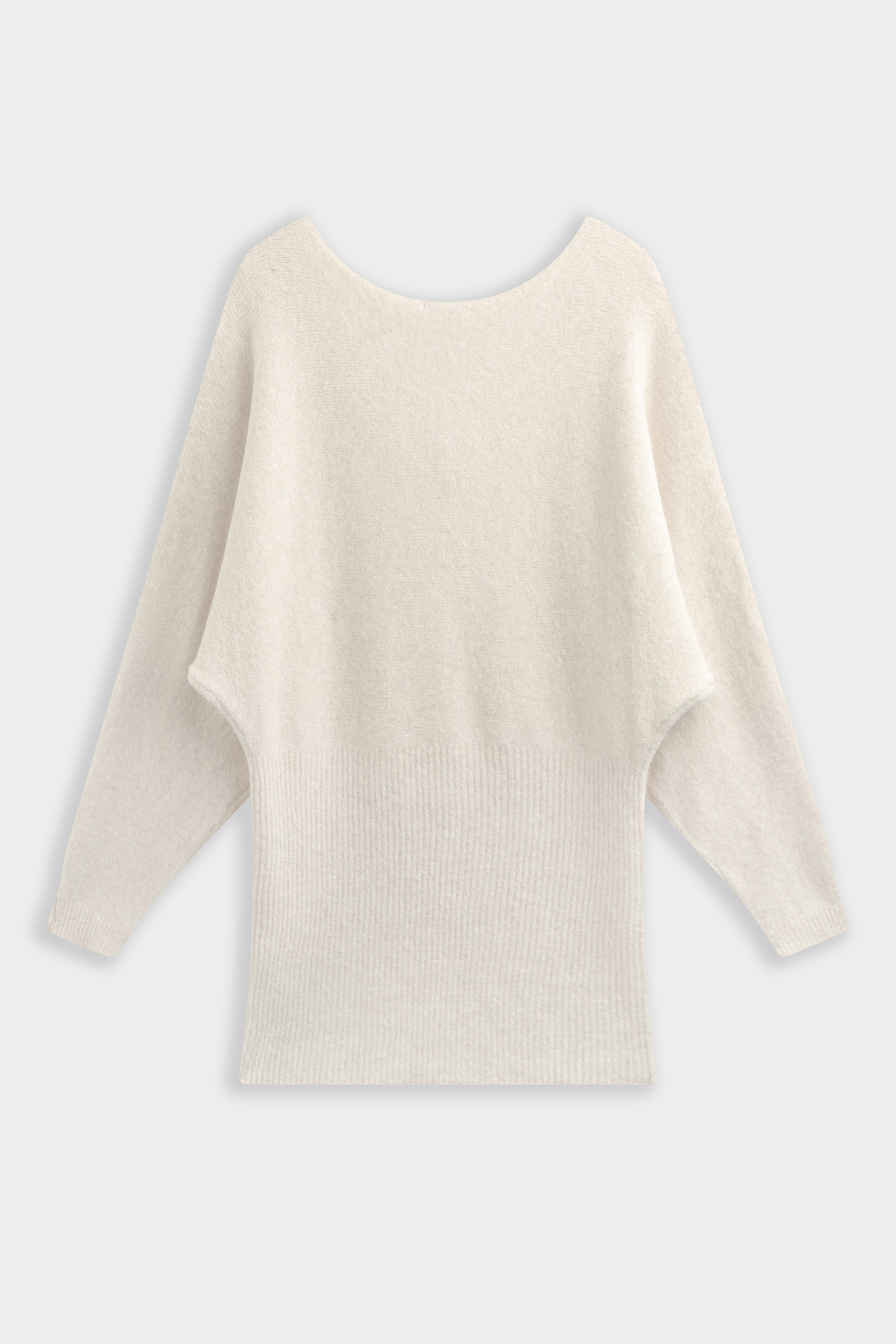 Modèle à col bateau, manches longues chauve-souris et taille ajustée.