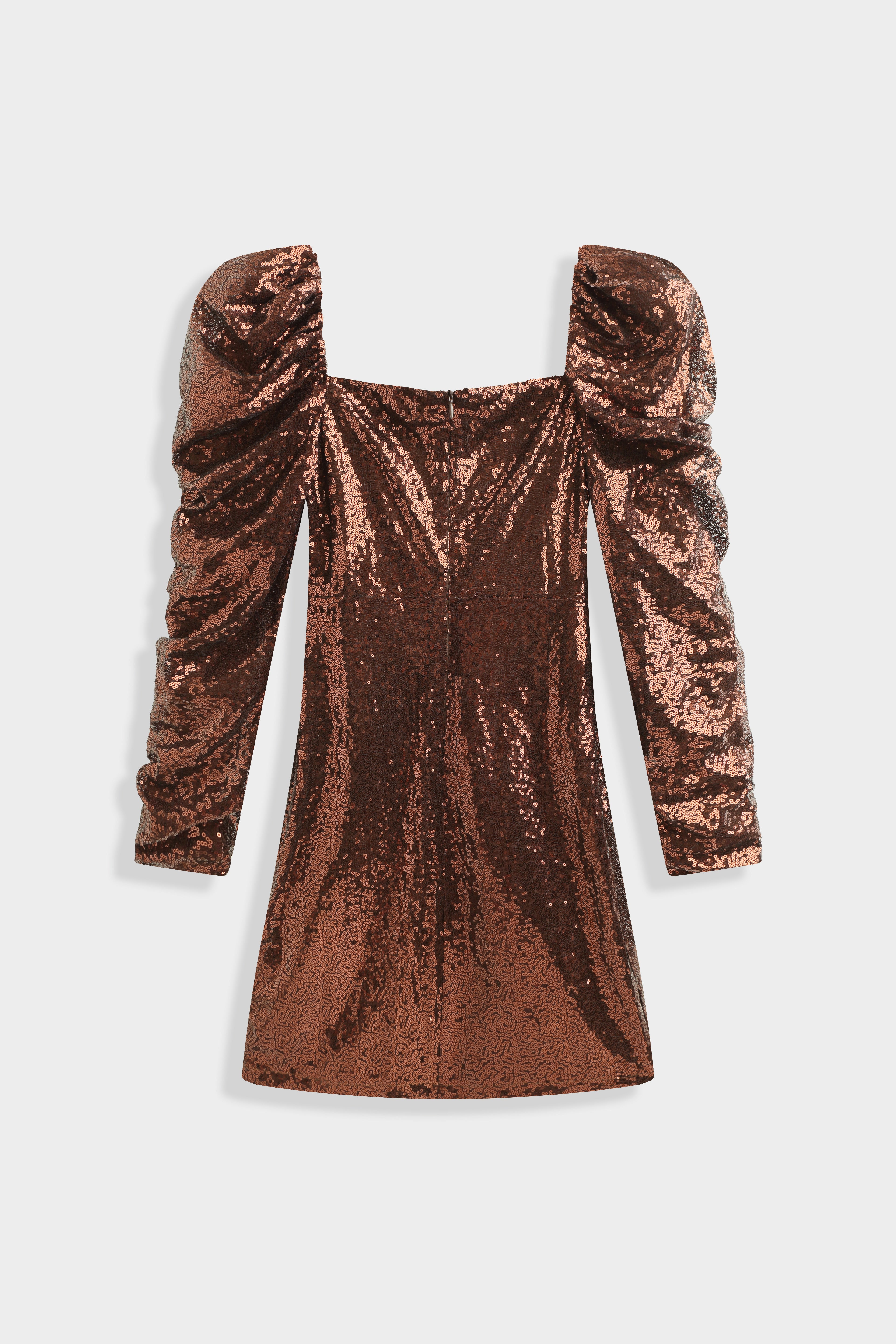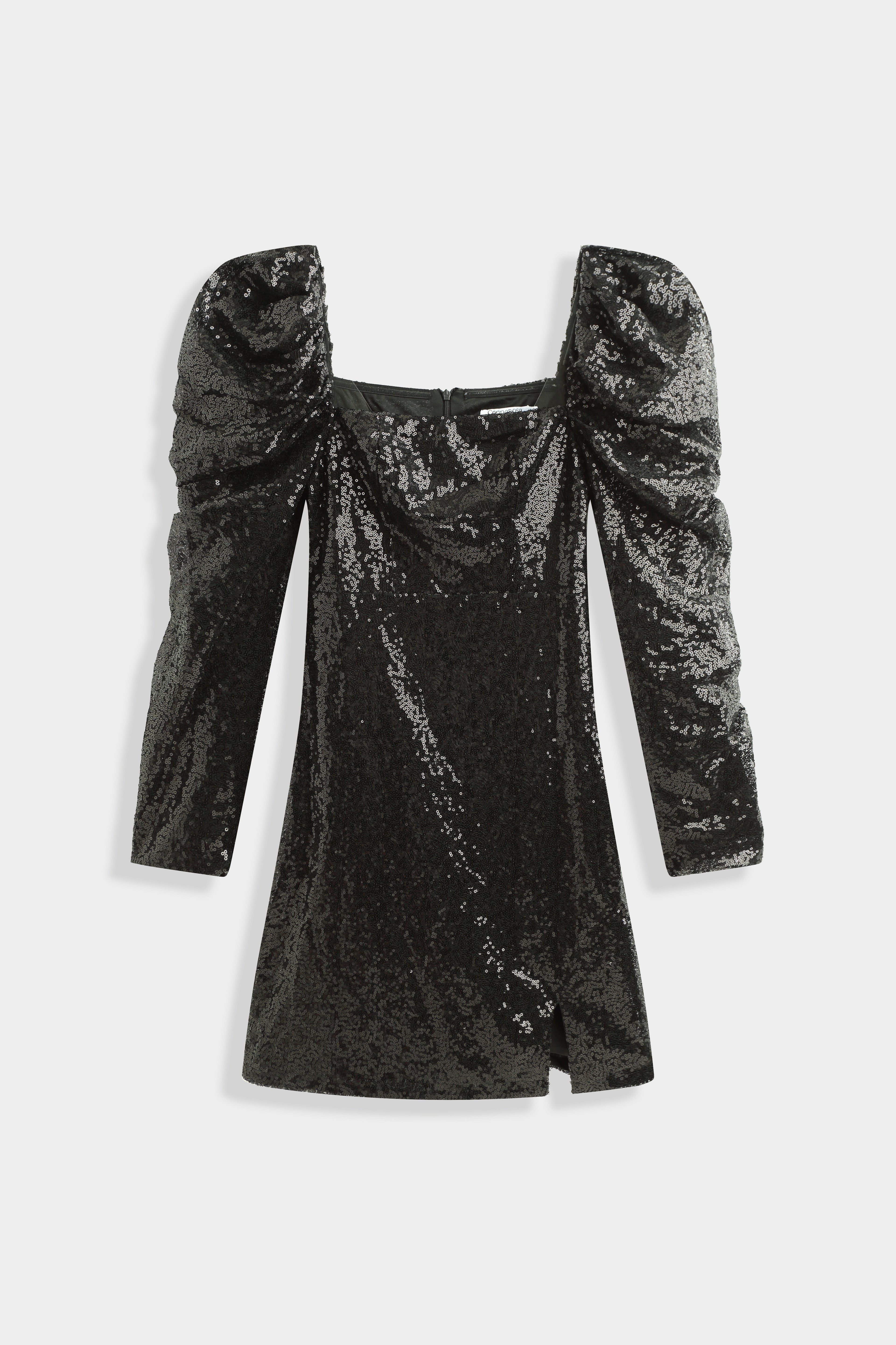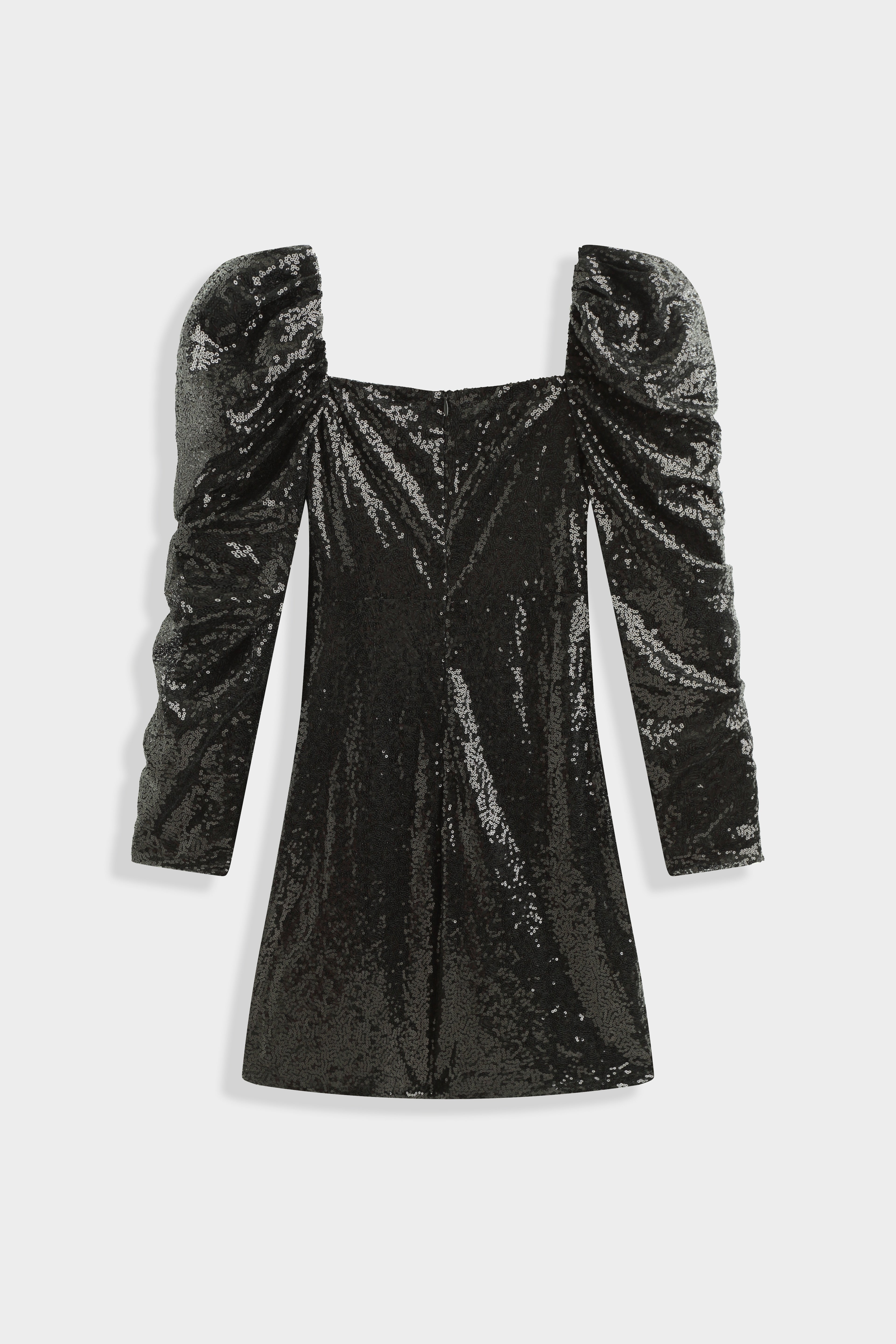 Robe courte en sequin à encolure carrée. manches longues bouffantes avec plissés. Petite fente sur le devant. Fermeture au dos par zip dissimulé.