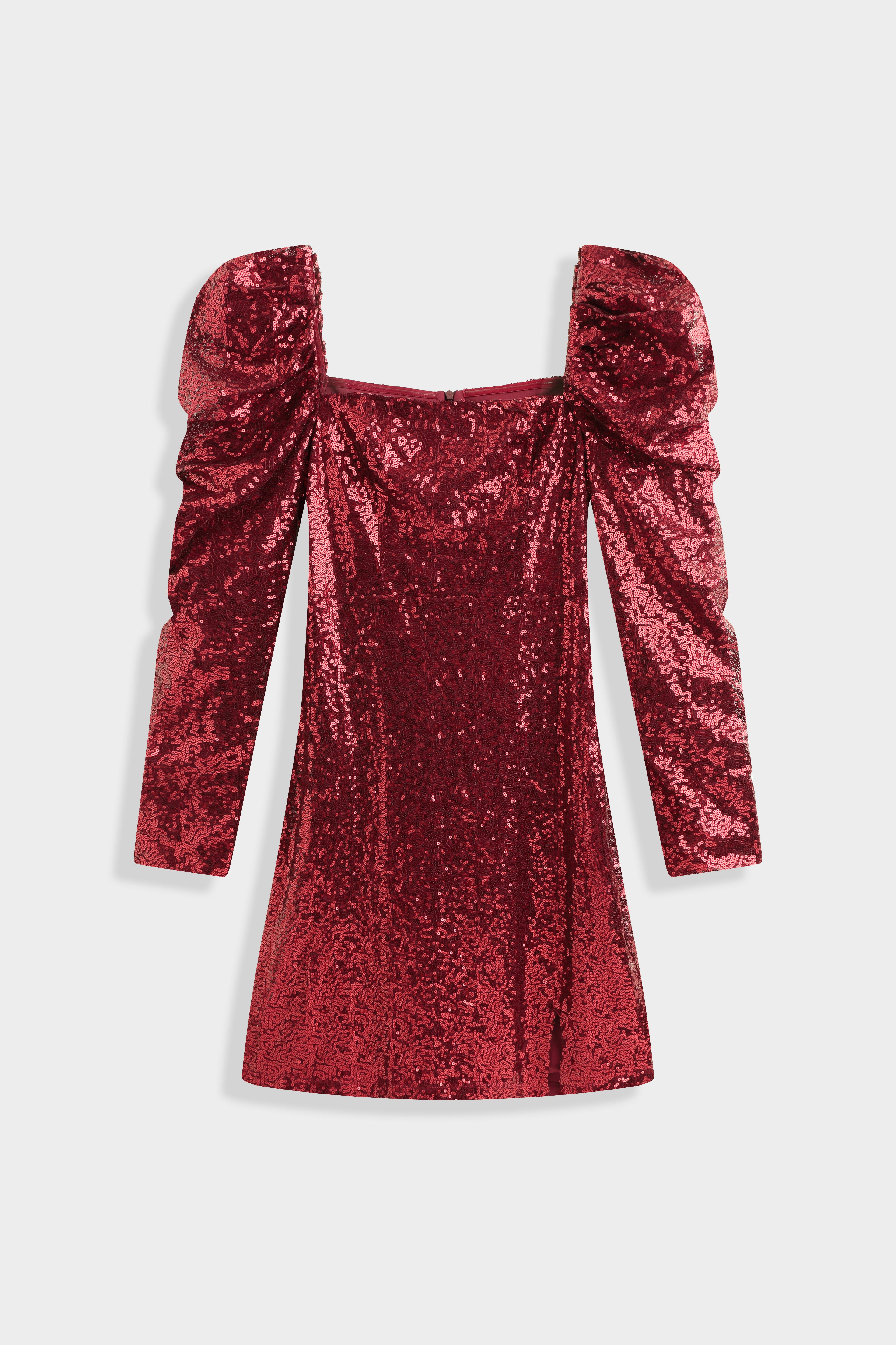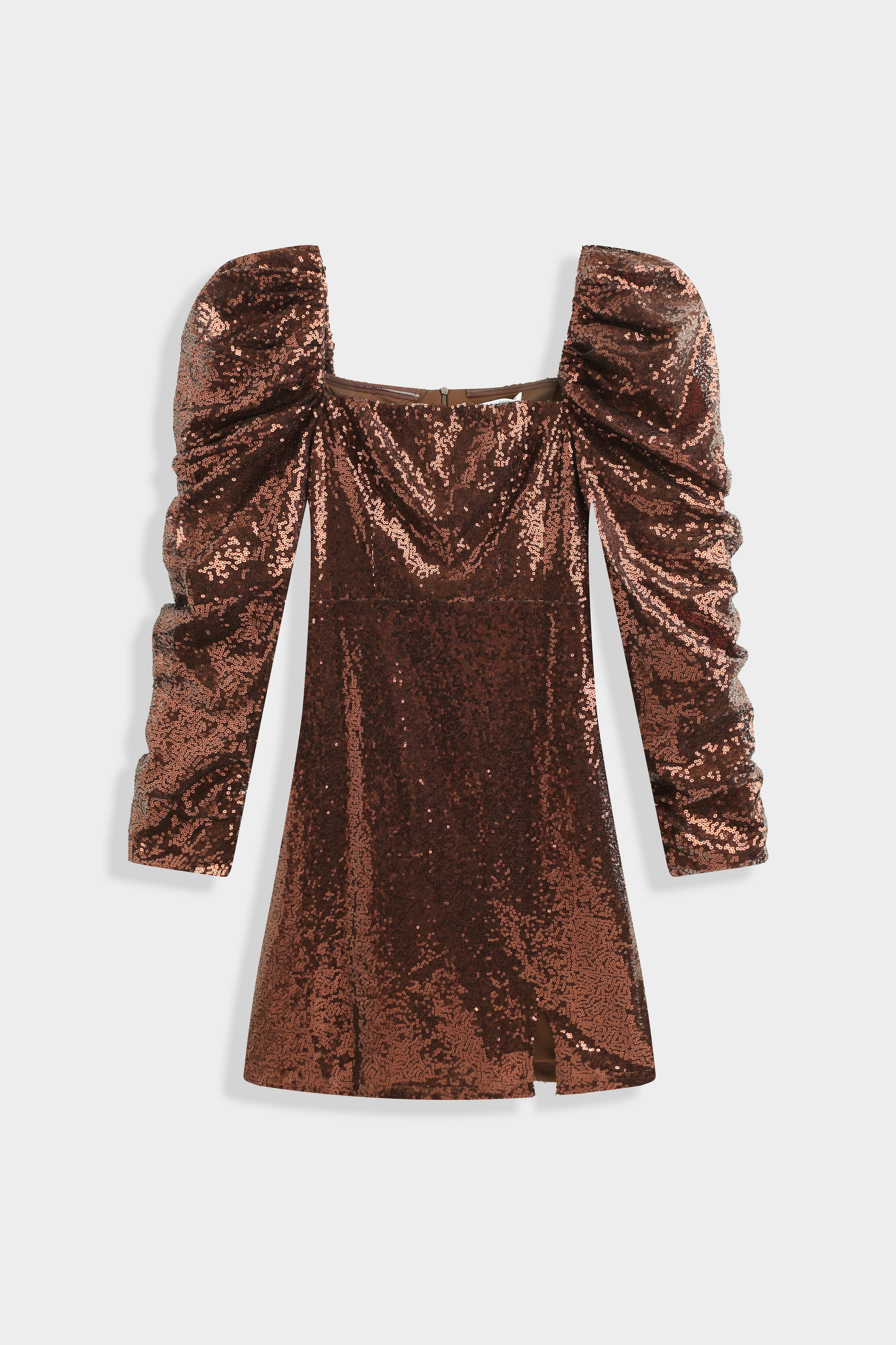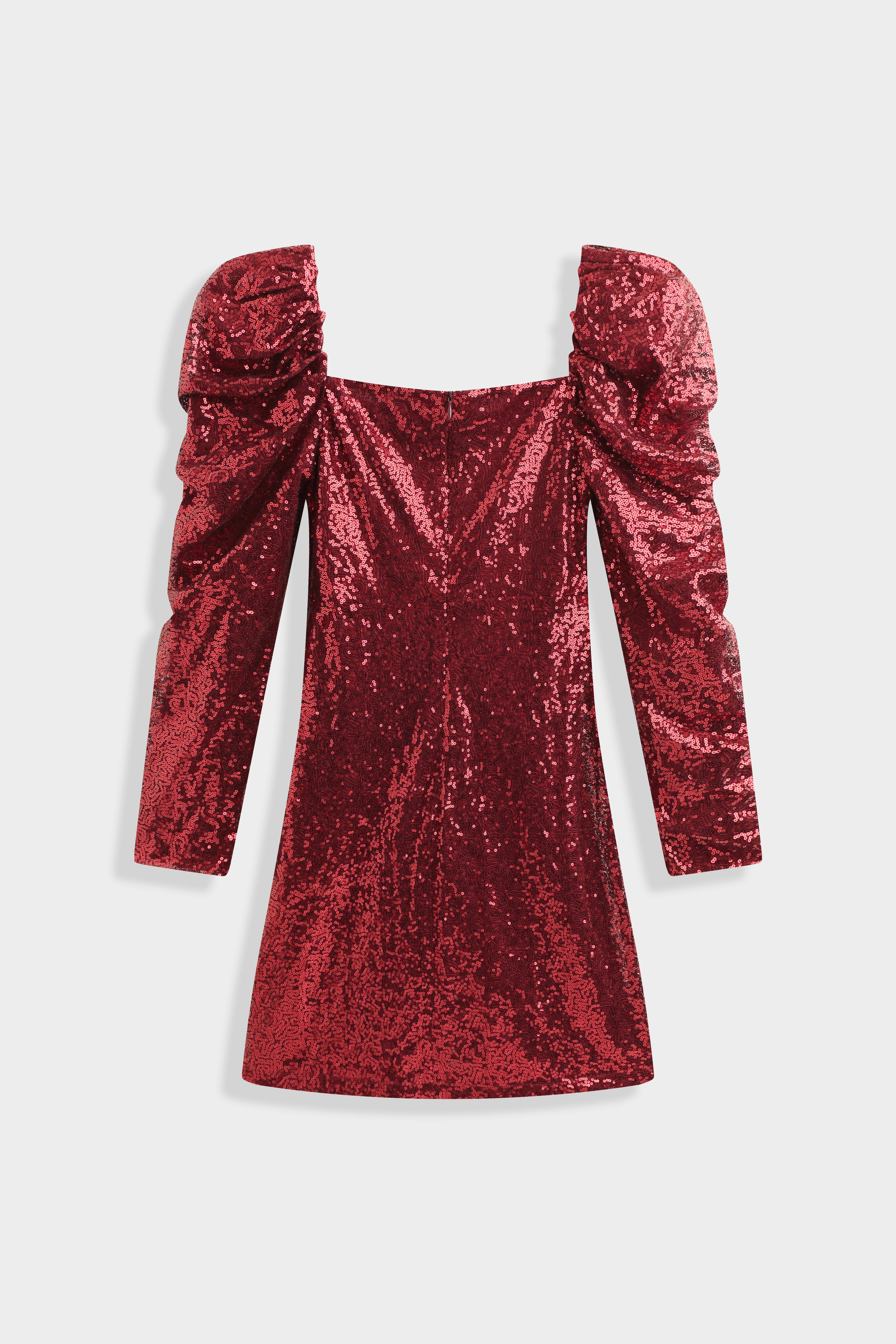 Robe courte en sequin à encolure carrée. manches longues bouffantes avec plissés. Petite fente sur le devant. Fermeture au dos par zip dissimulé.