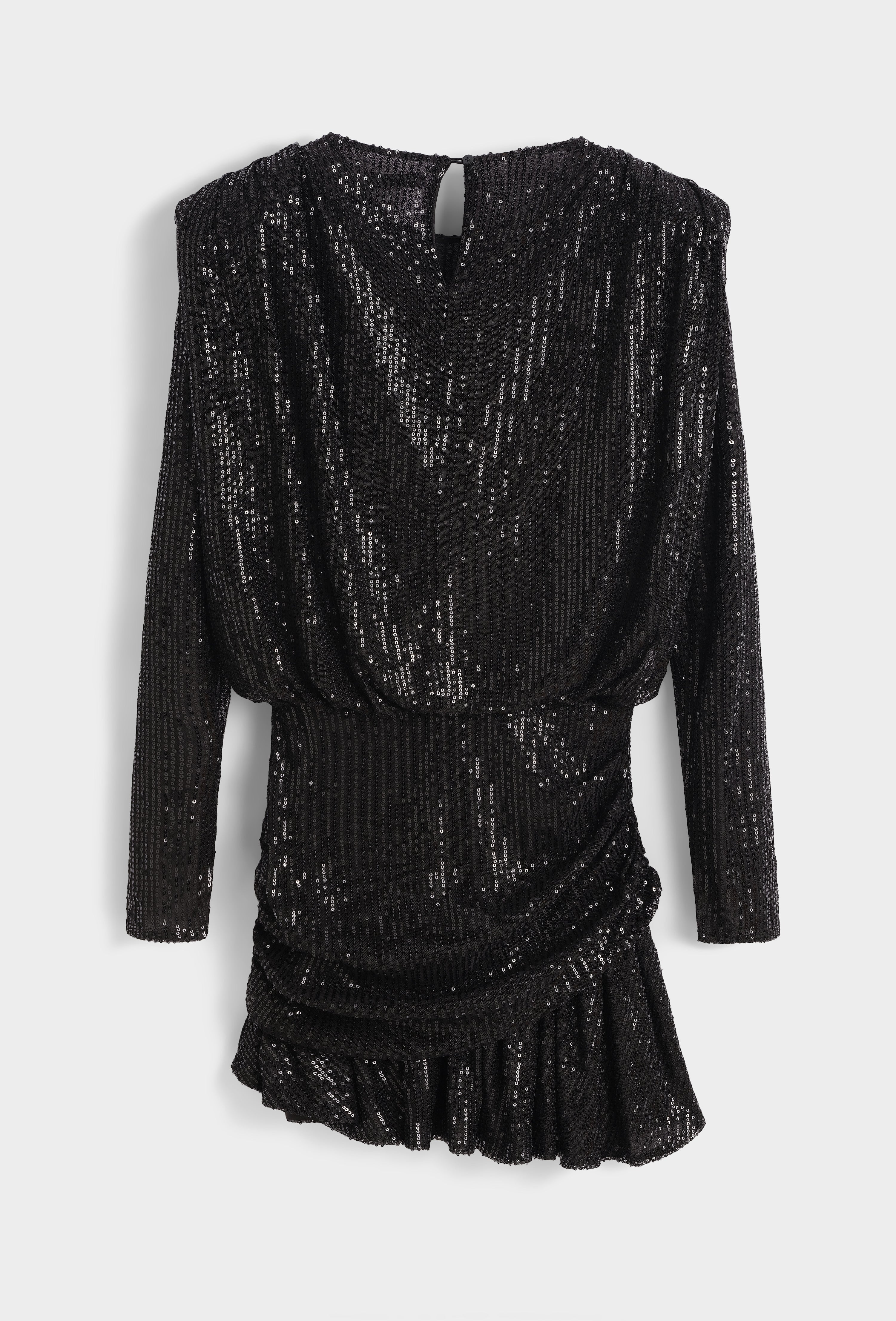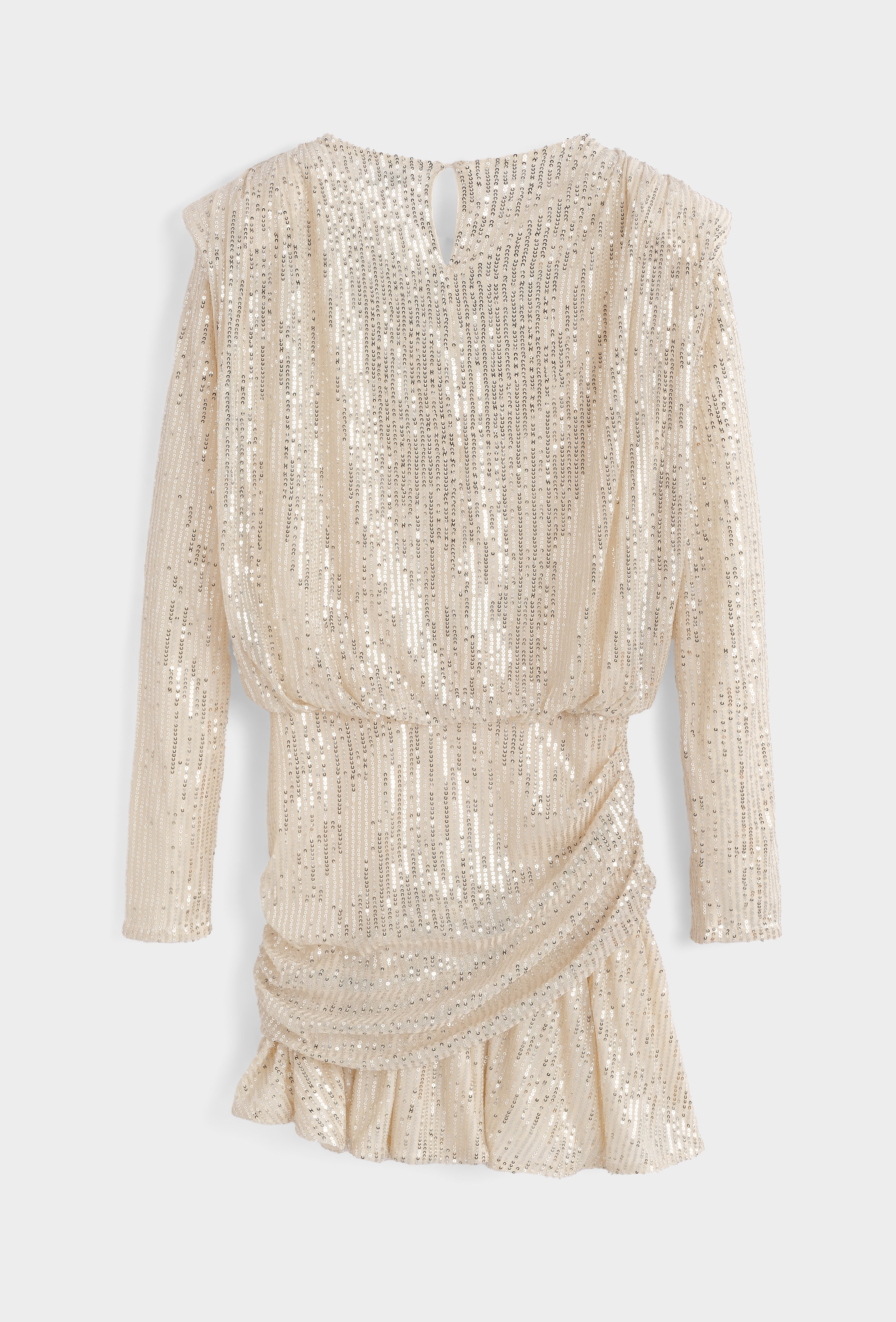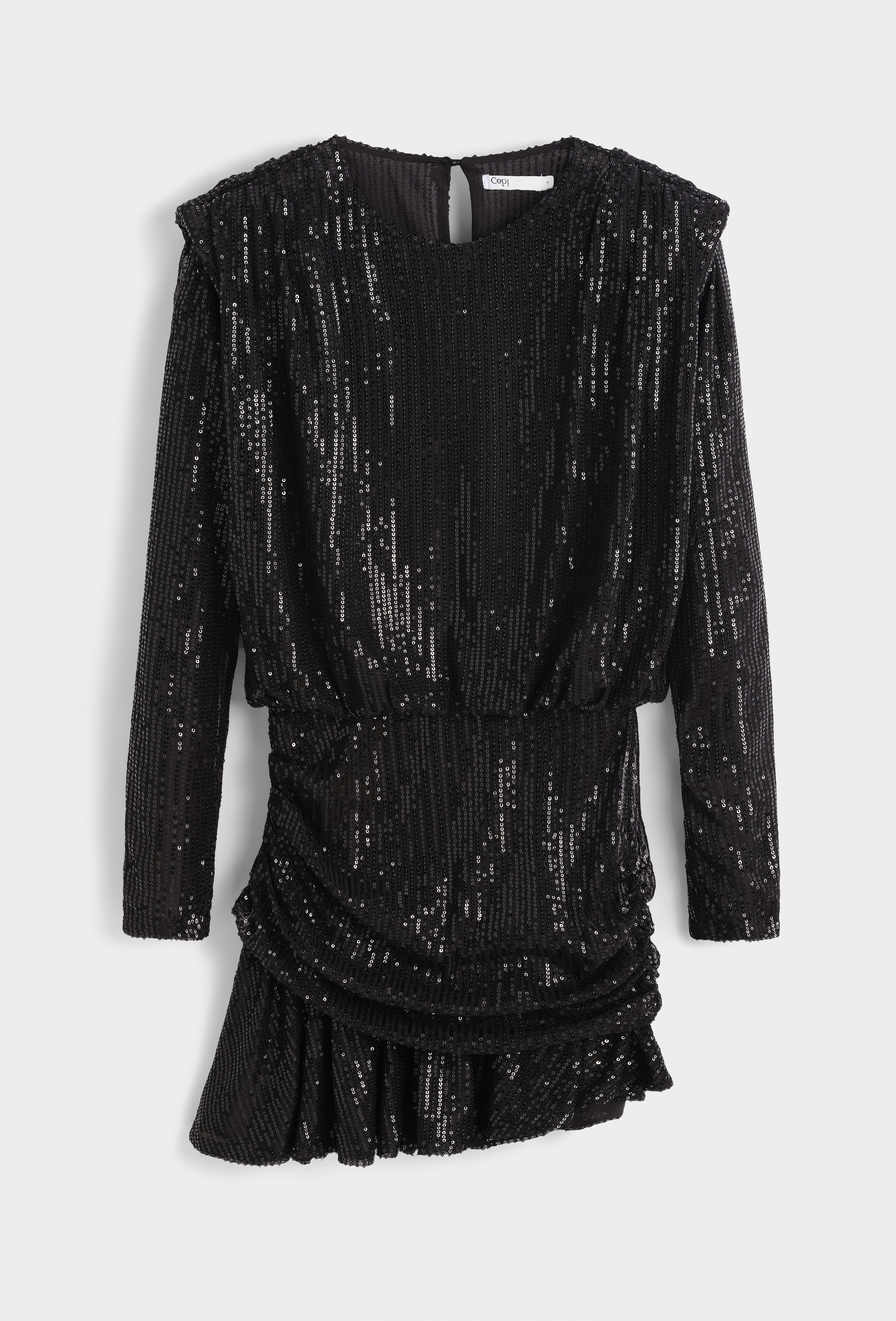 Robe courte à sequins avec encolure ronde et manches longues. Haut effet blousant et taille ajustée. Jupe drap‚ avec volants asymétriques sur le bas.