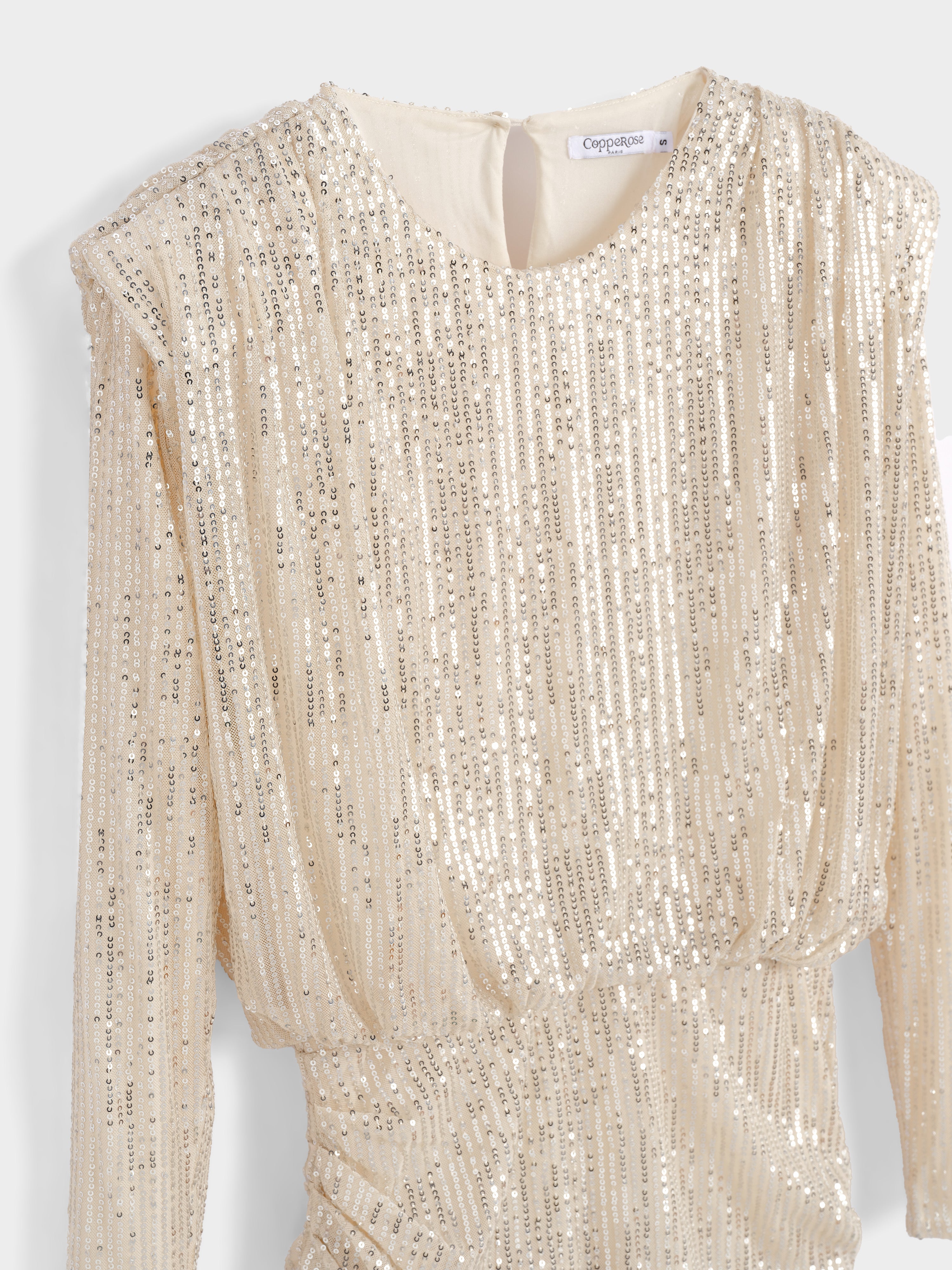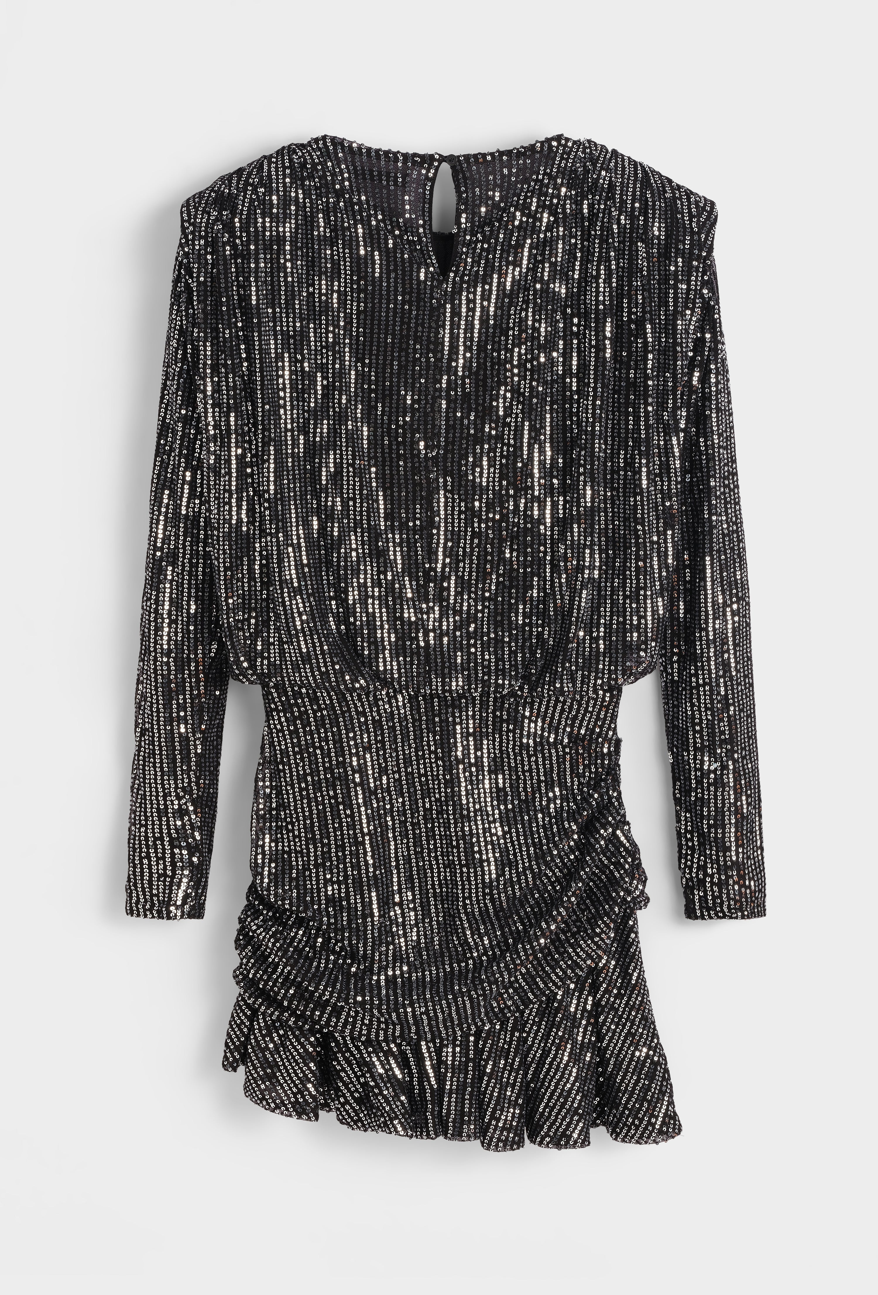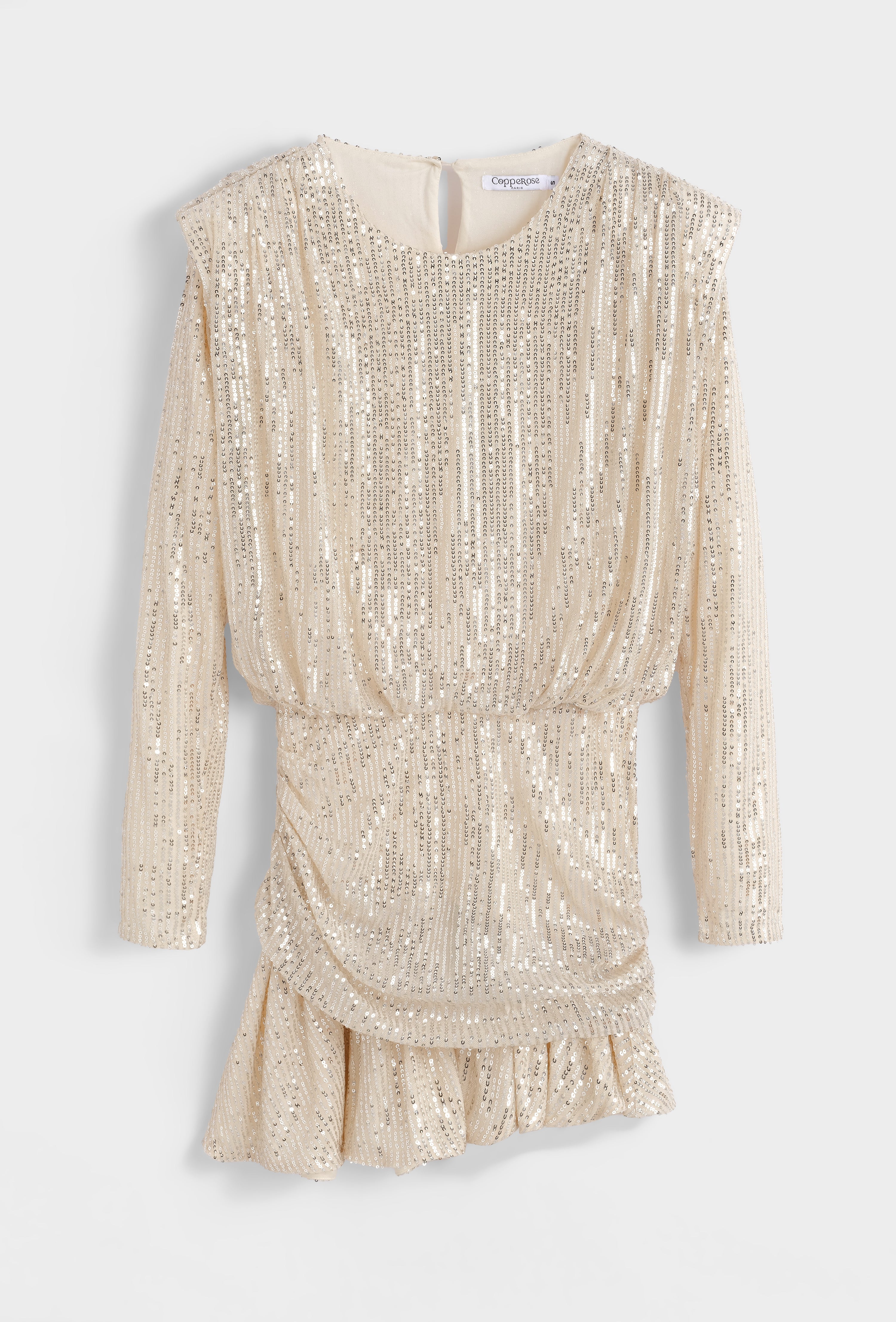 Robe courte à sequins avec encolure ronde et manches longues. Haut effet blousant et taille ajustée. Jupe drap‚ avec volants asymétriques sur le bas.