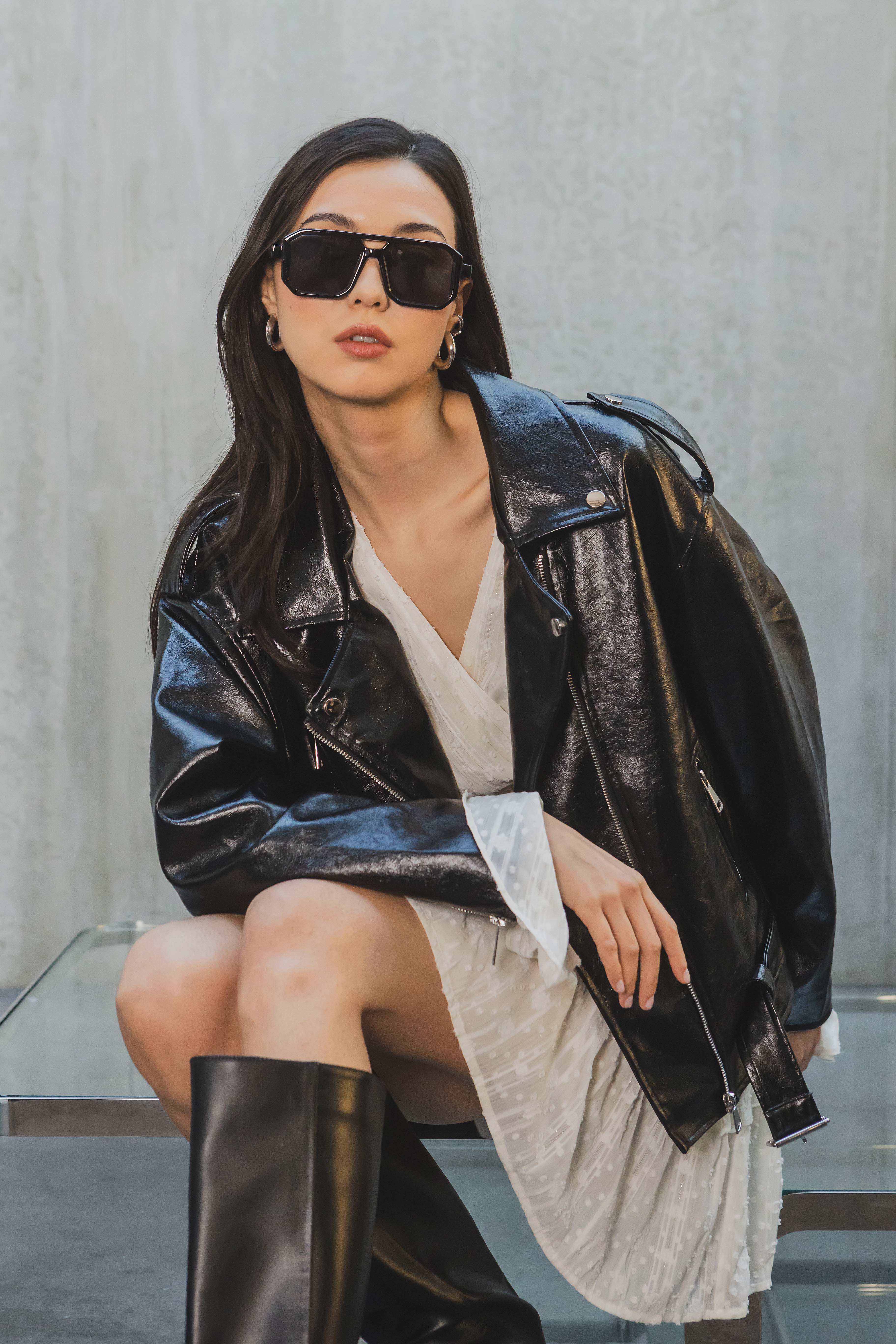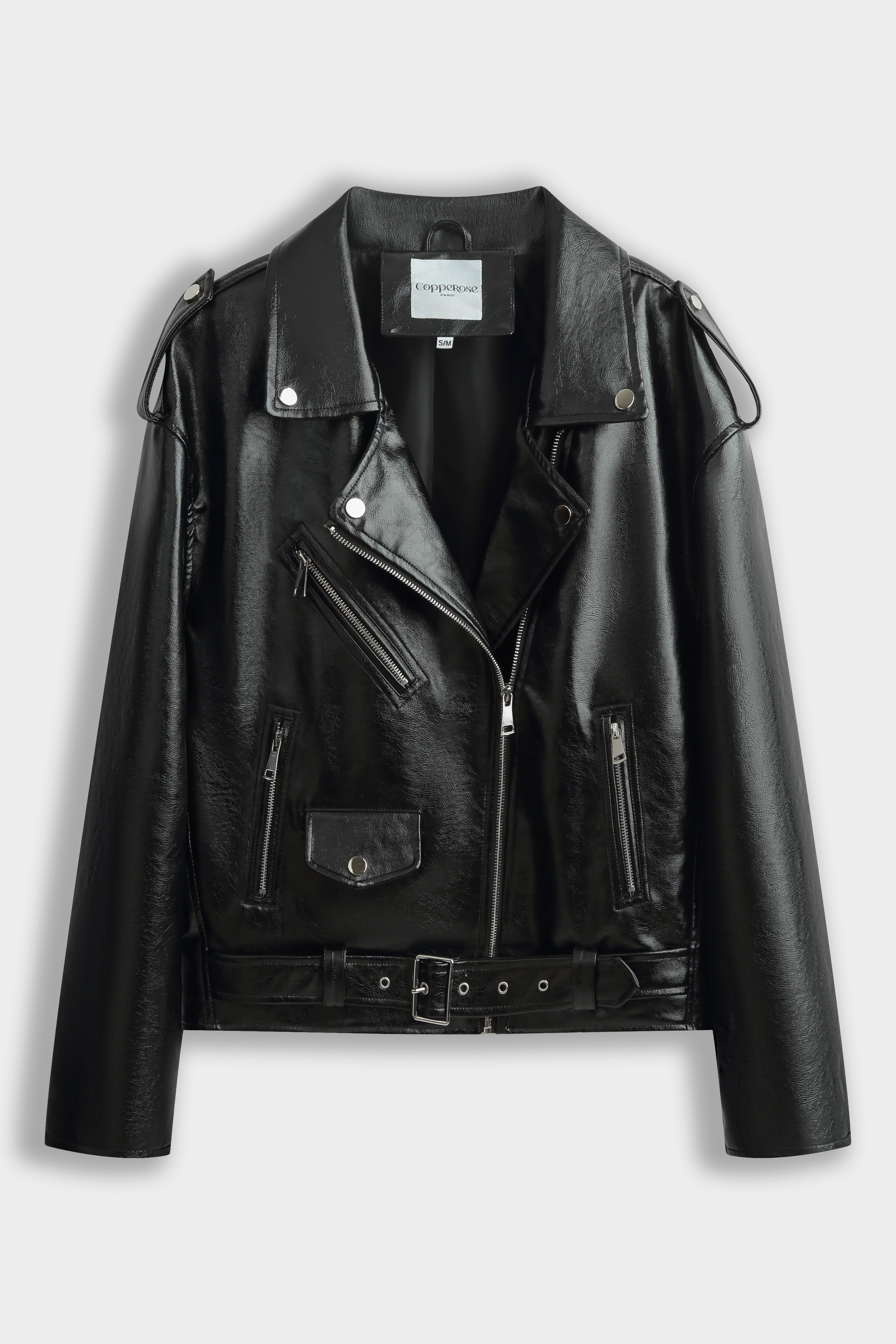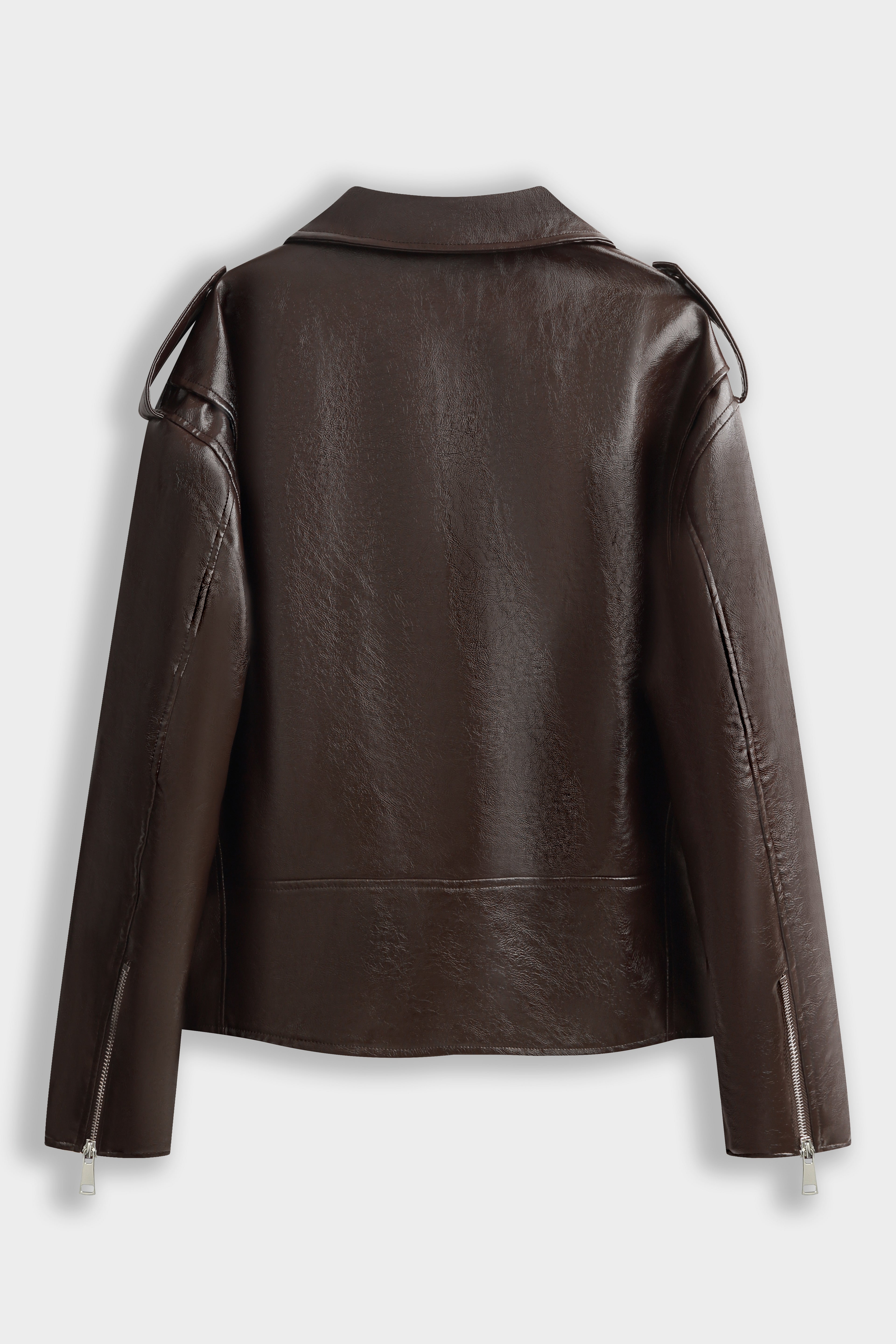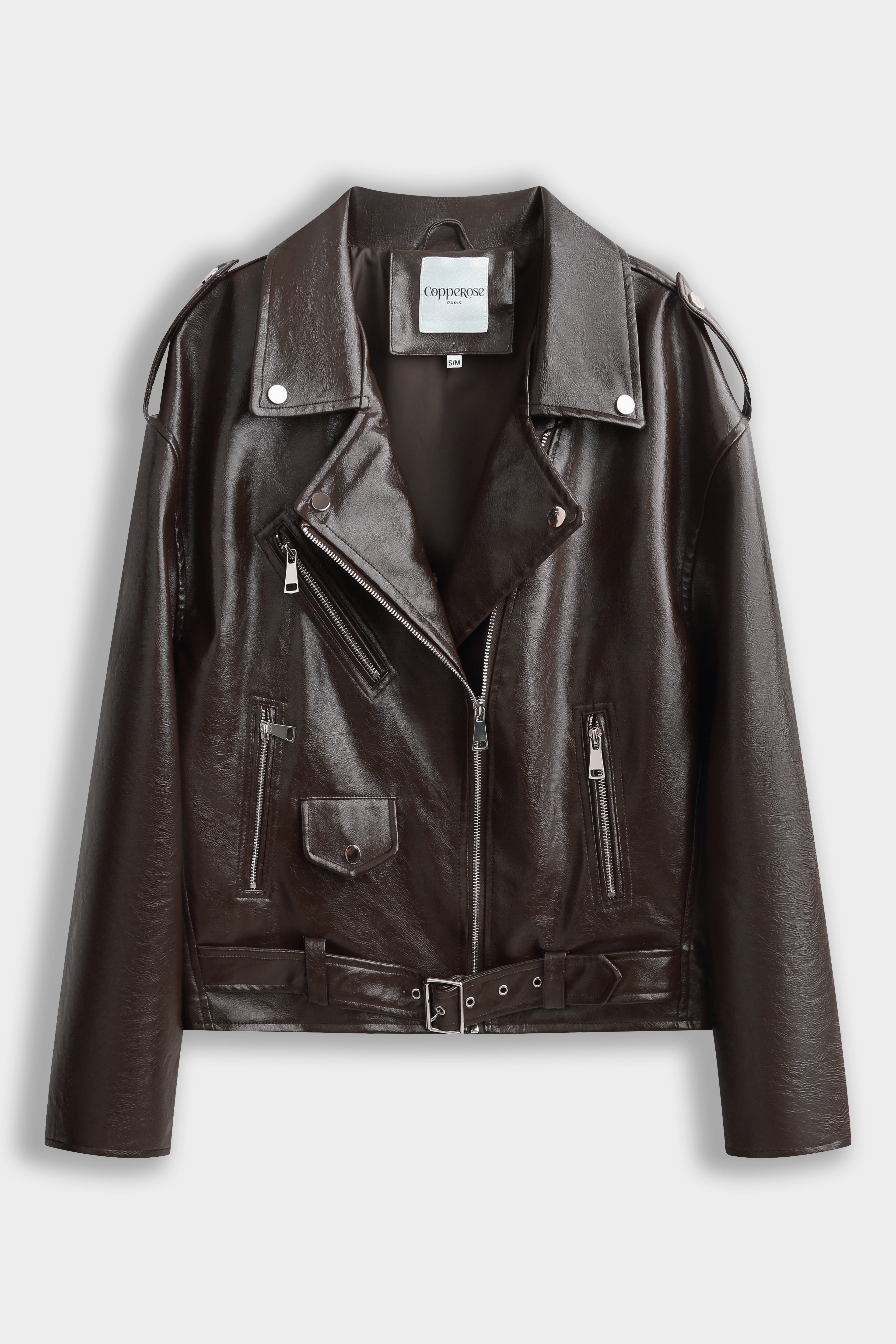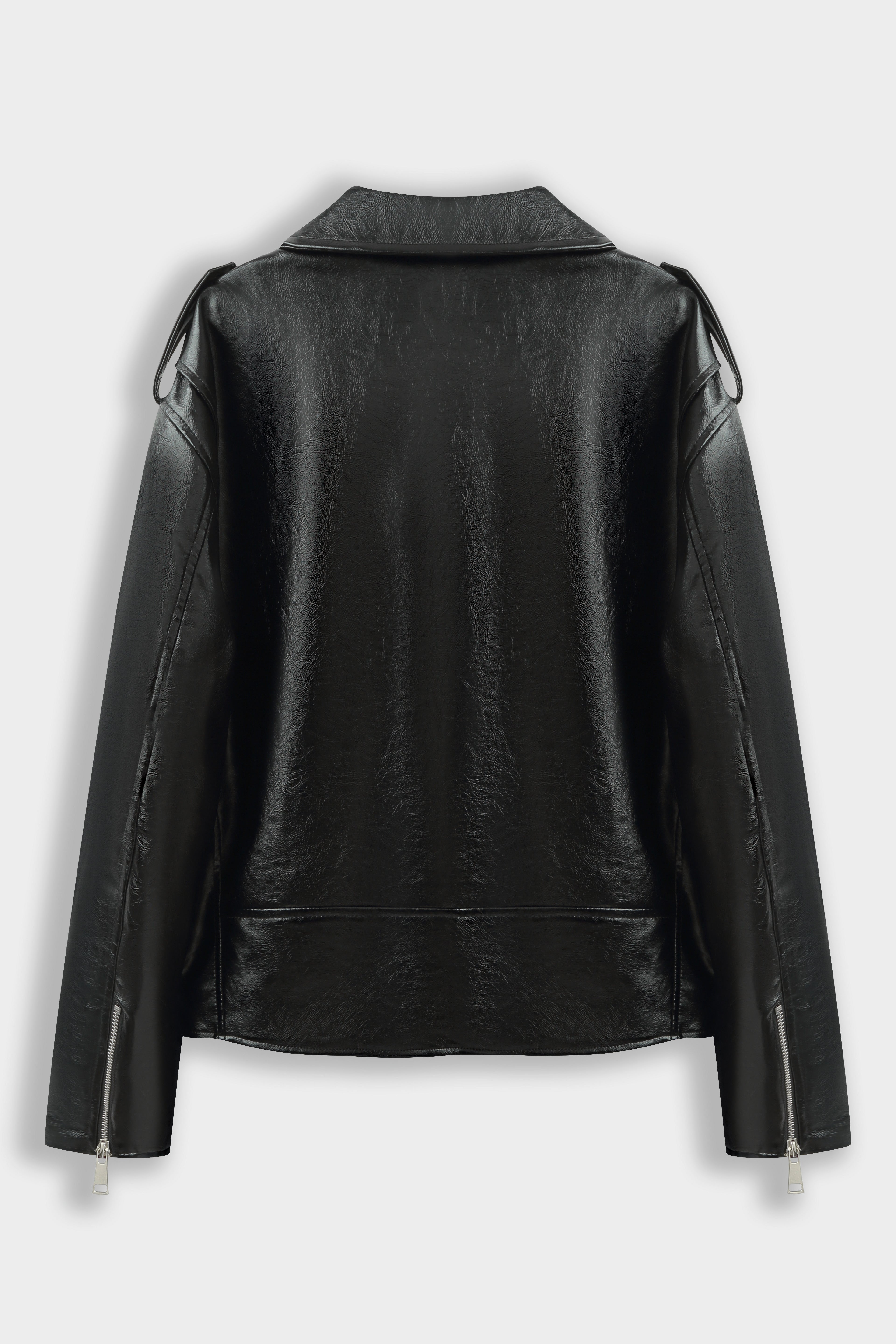 Blouson motard à col cranté avec revers pressionnés. Fermeture croisée par zip métallique asymétrique. Épaulettes avec pattes pressionées. Poches zippées verticales sur le devant et poche à rabat présionnée. Ceinture intégrée avec boucle métallique au bas. Manches longues avec zips en bas de manches.