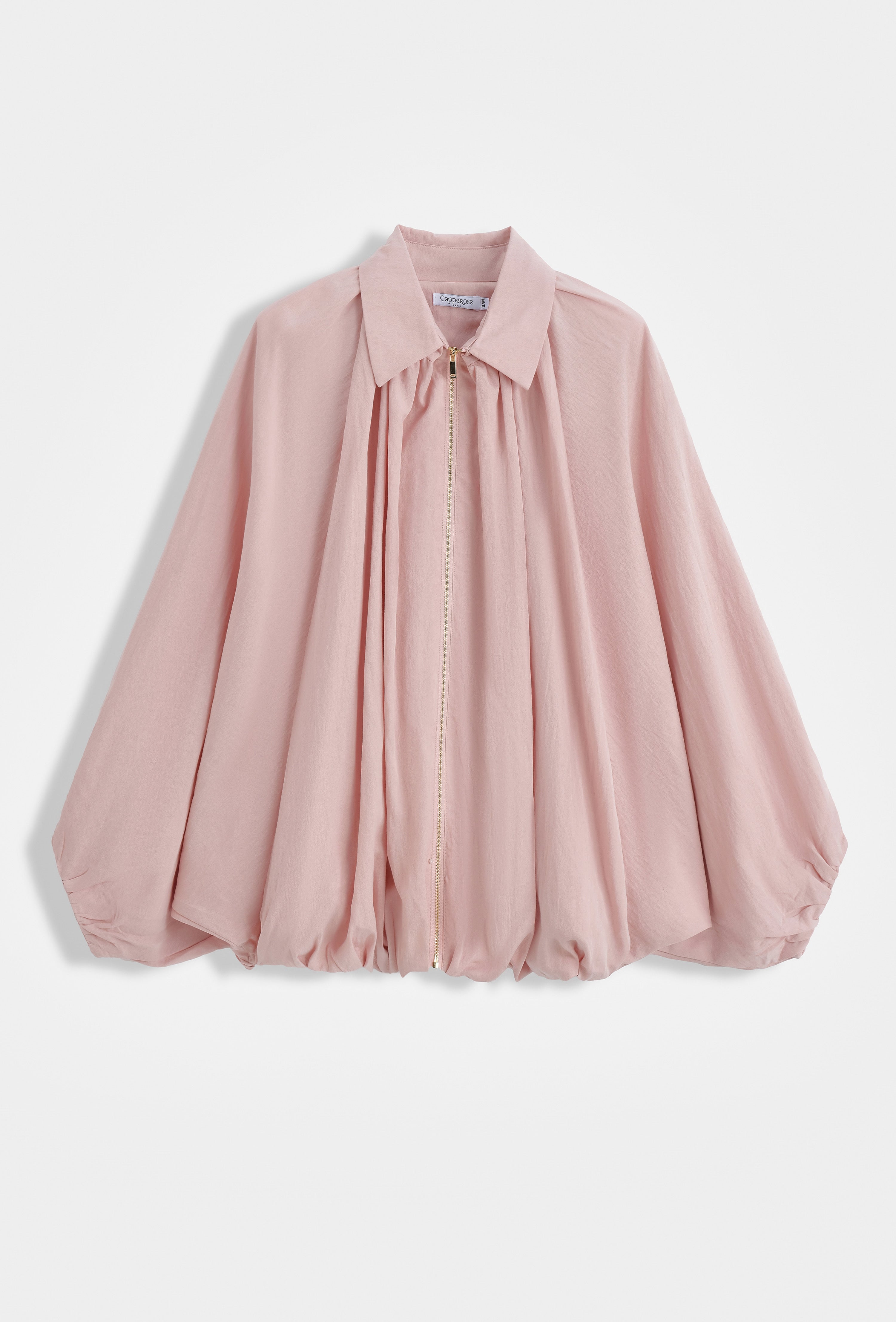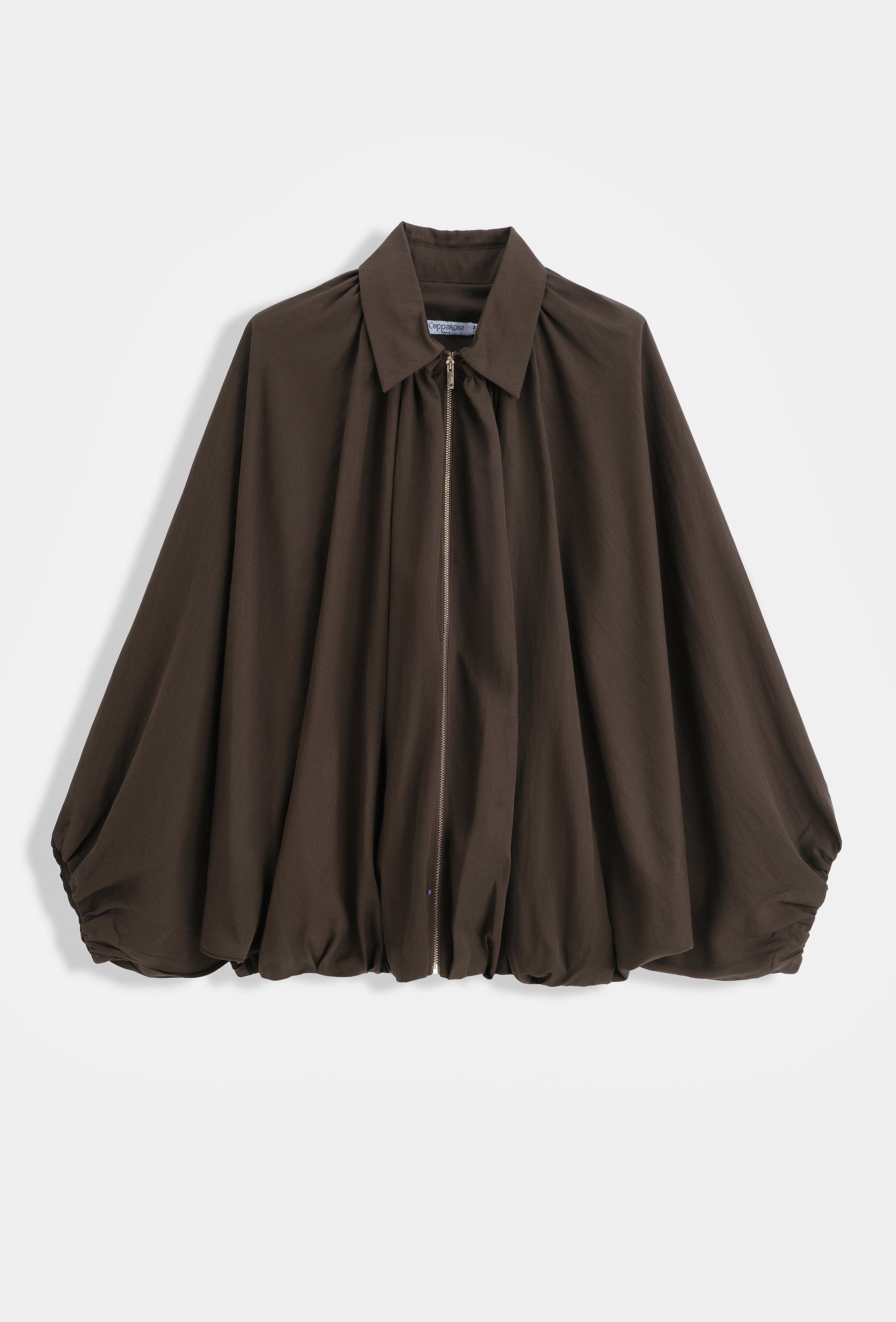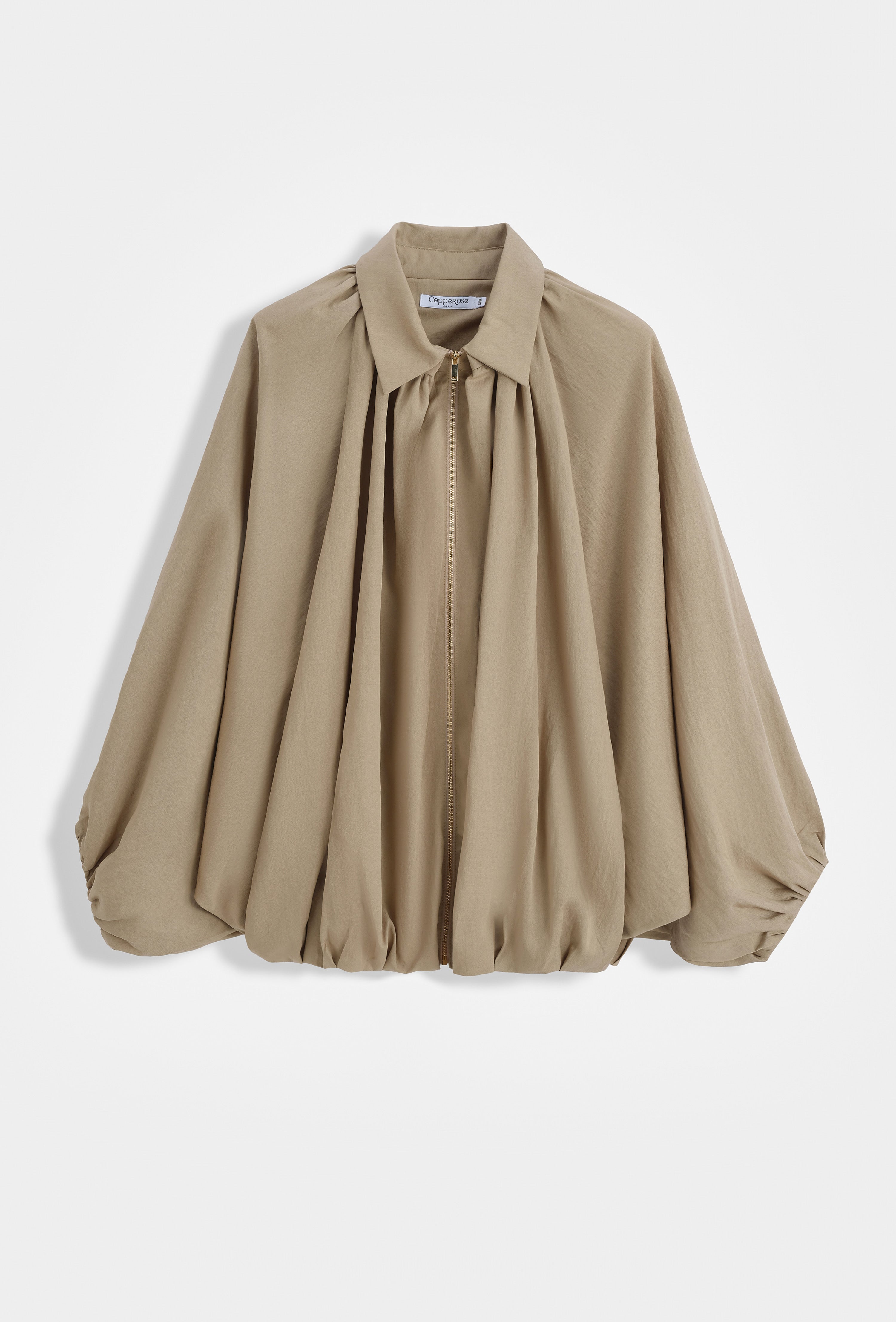 Bomber effet lyocell. Col à rabat et manches longues bouffantes. Bas avec plus bouffants. Fermeture zippée devant. Poches avant inséré dans la couture