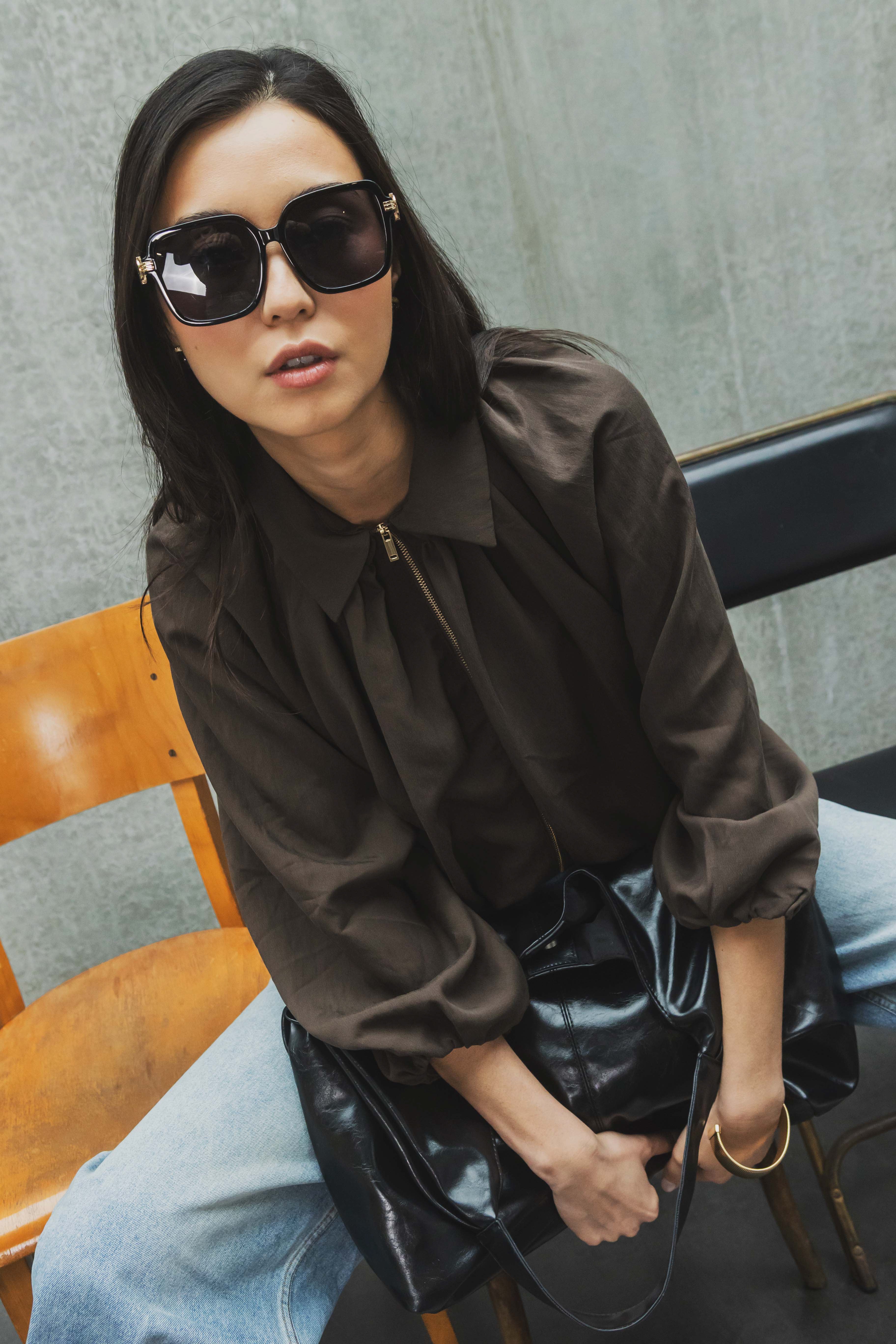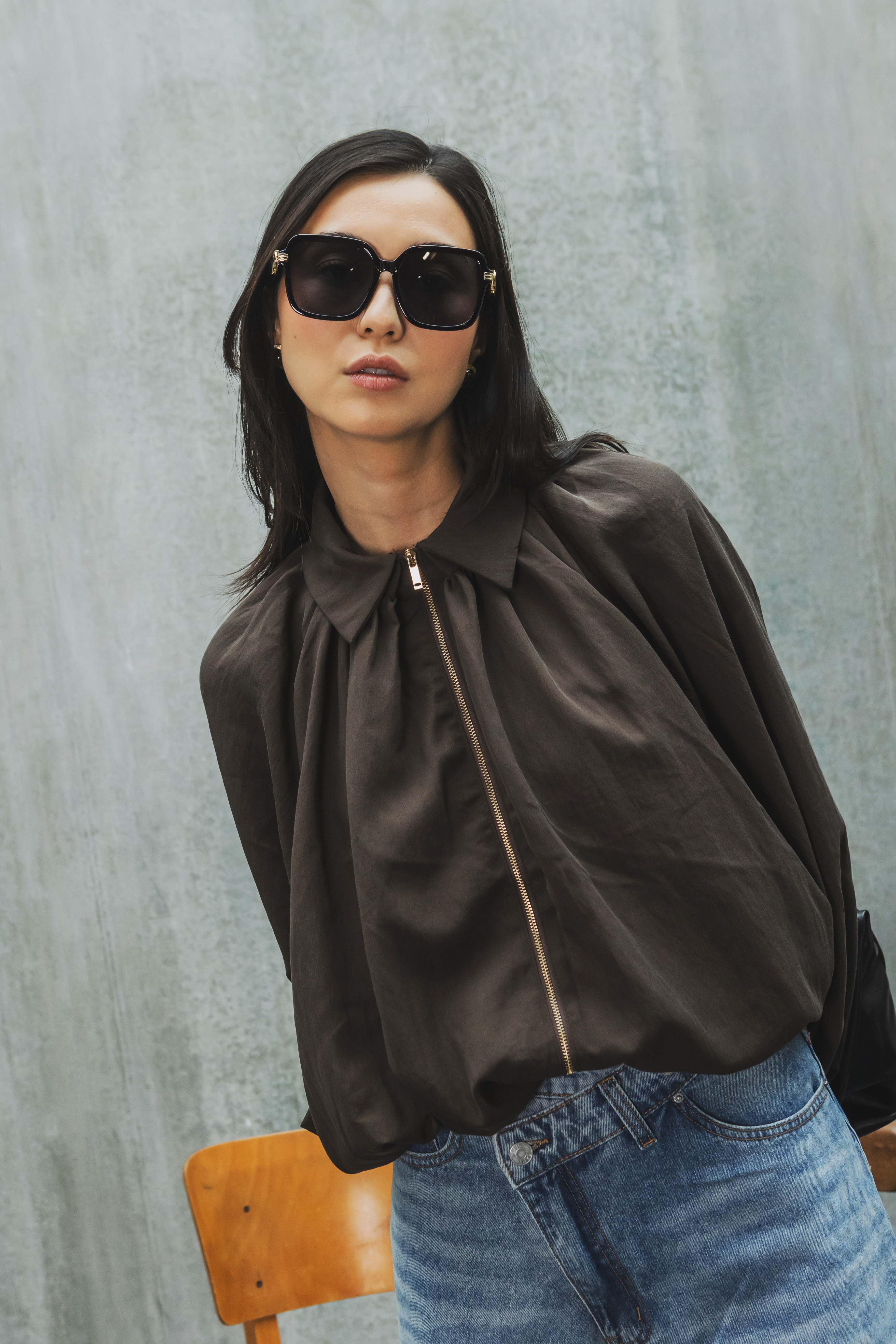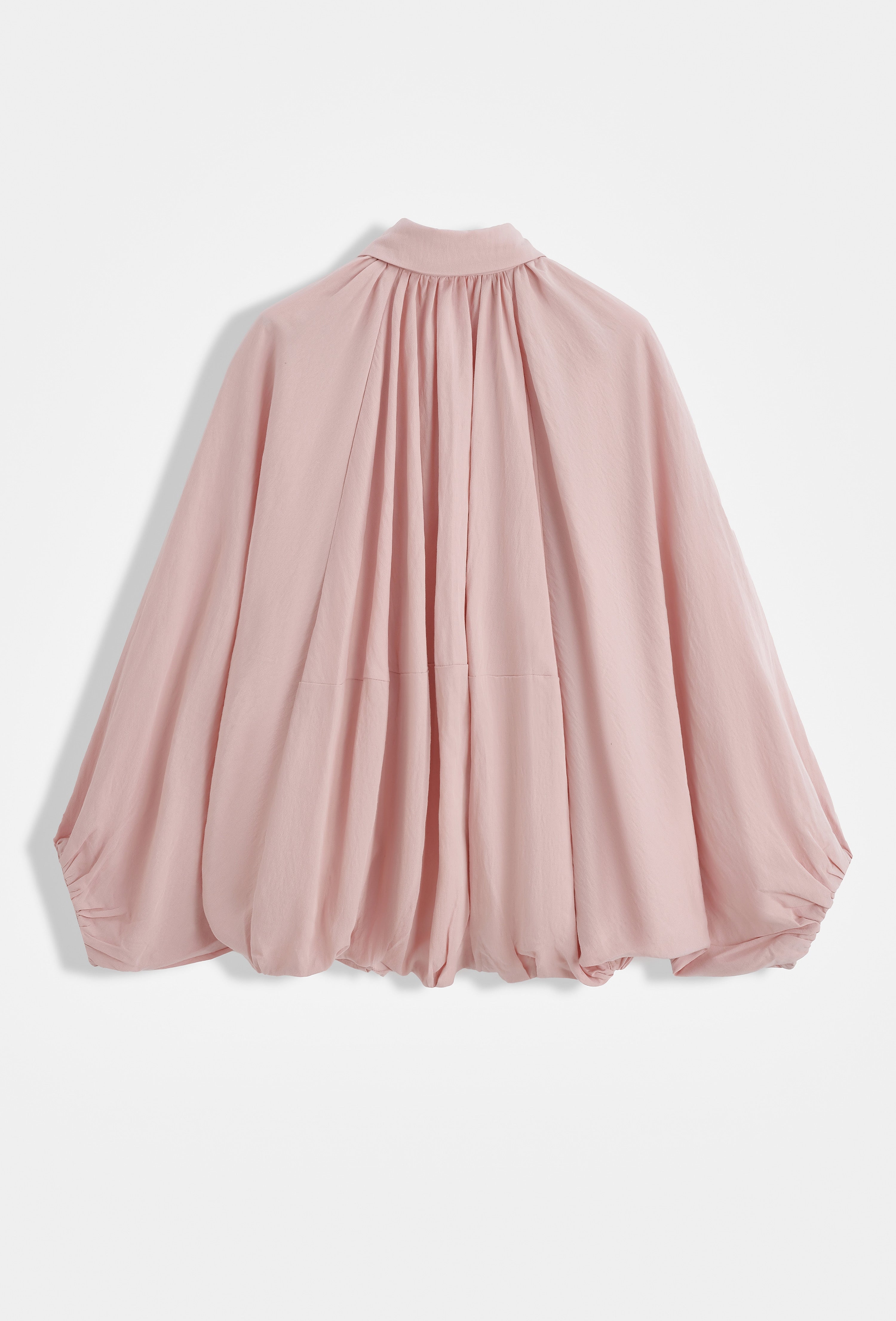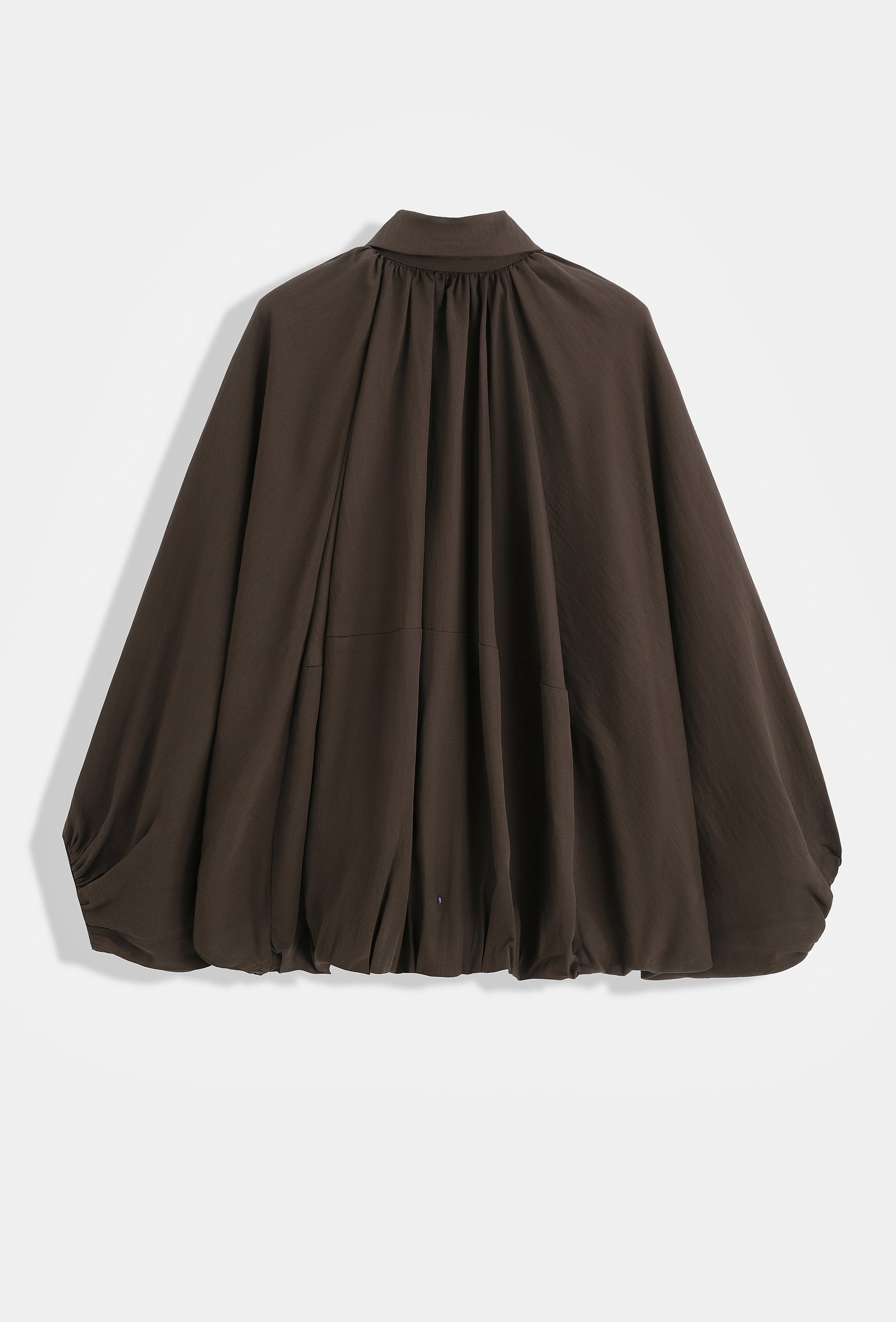 Bomber effet lyocell. Col à rabat et manches longues bouffantes. Bas avec plus bouffants. Fermeture zippée devant. Poches avant inséré dans la couture