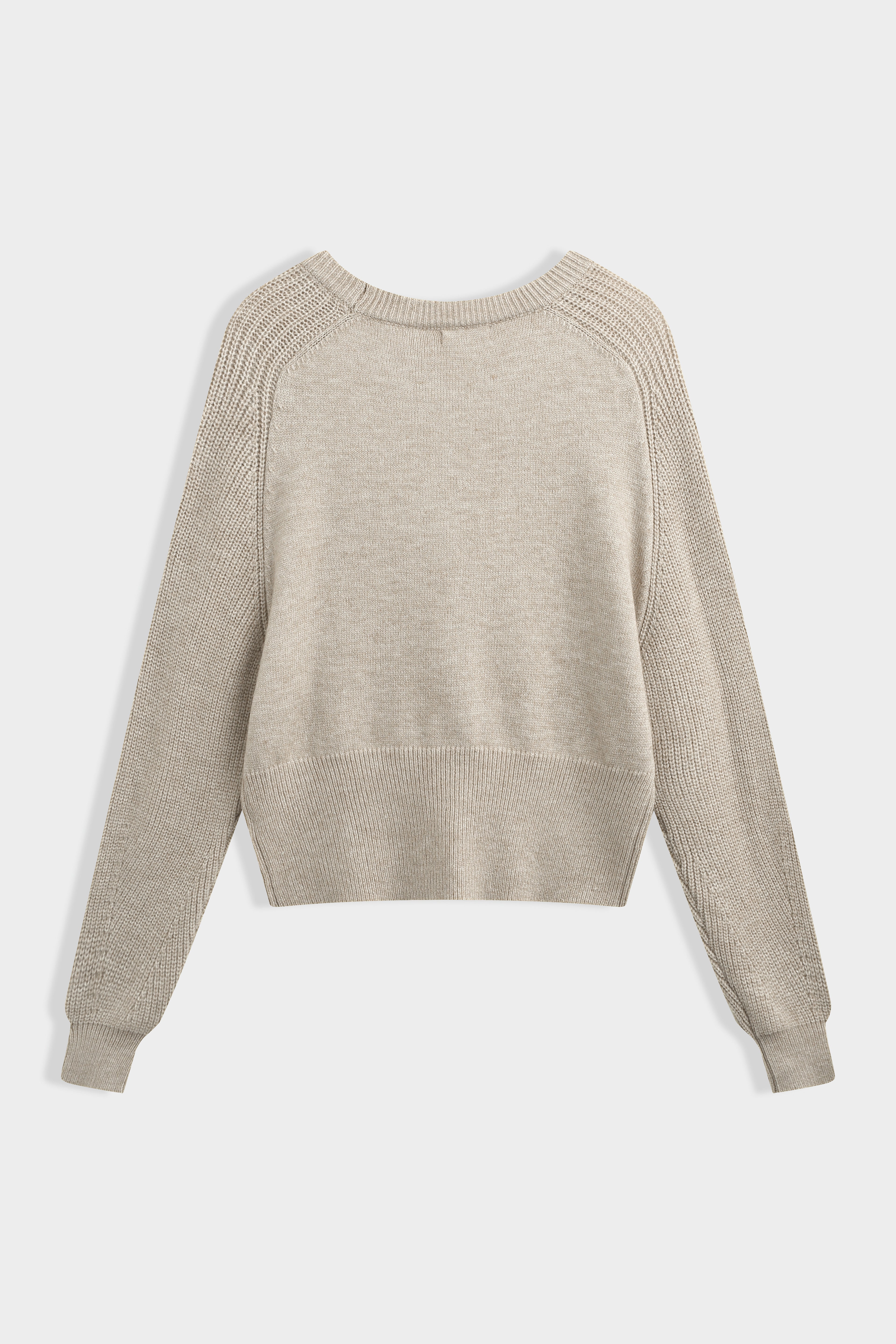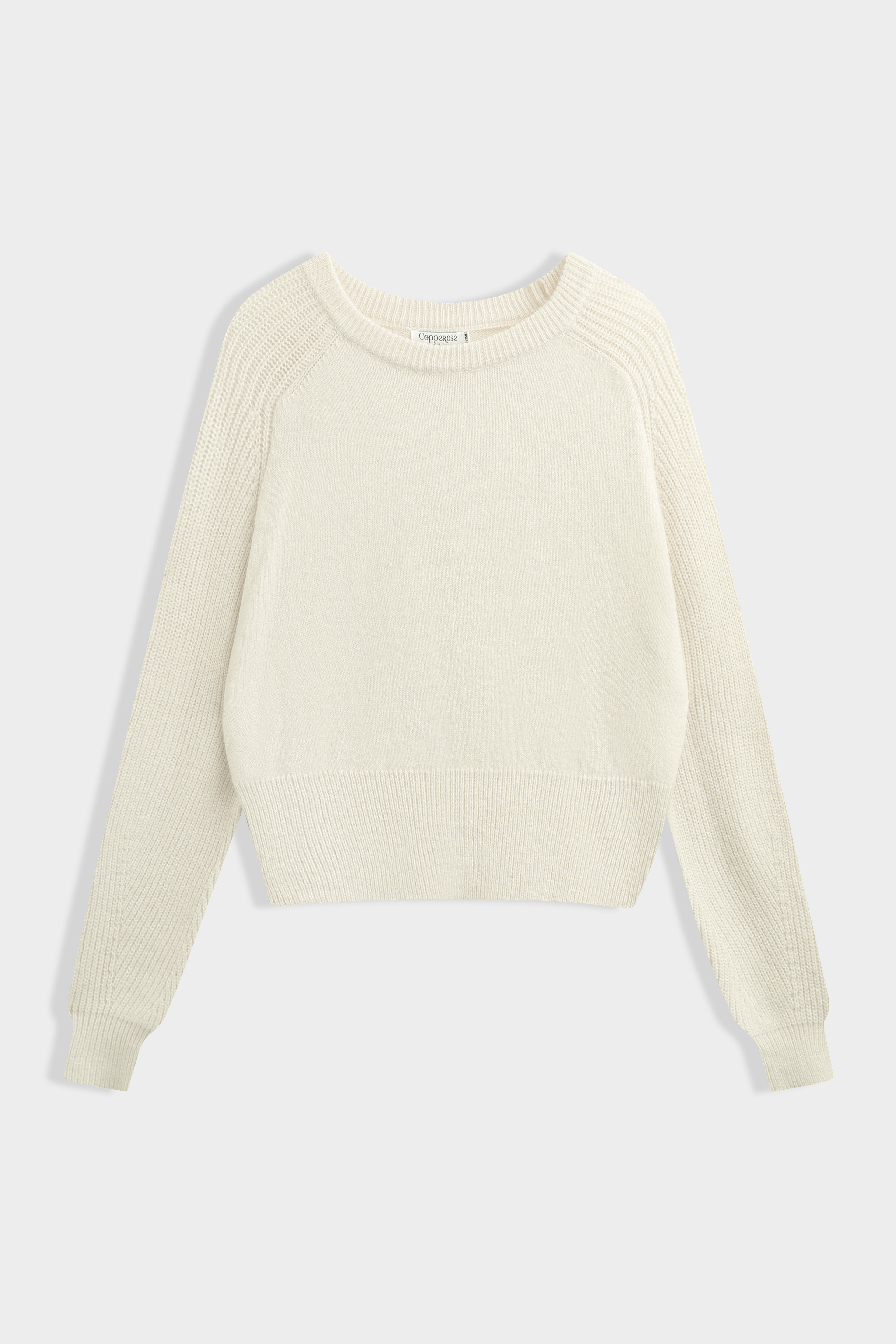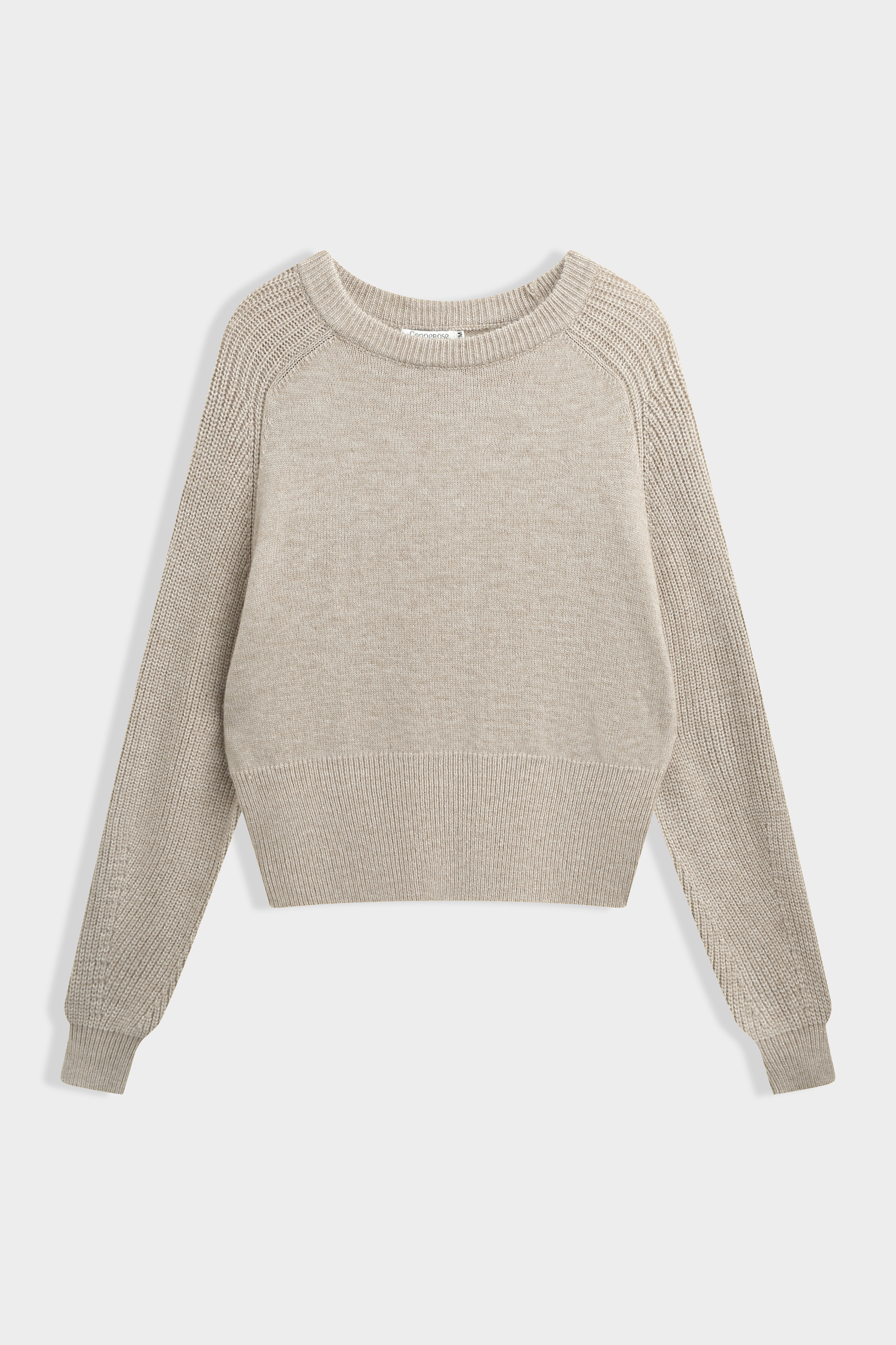 Détails côtelés contrastants aux manches, aux poignets et à la base.