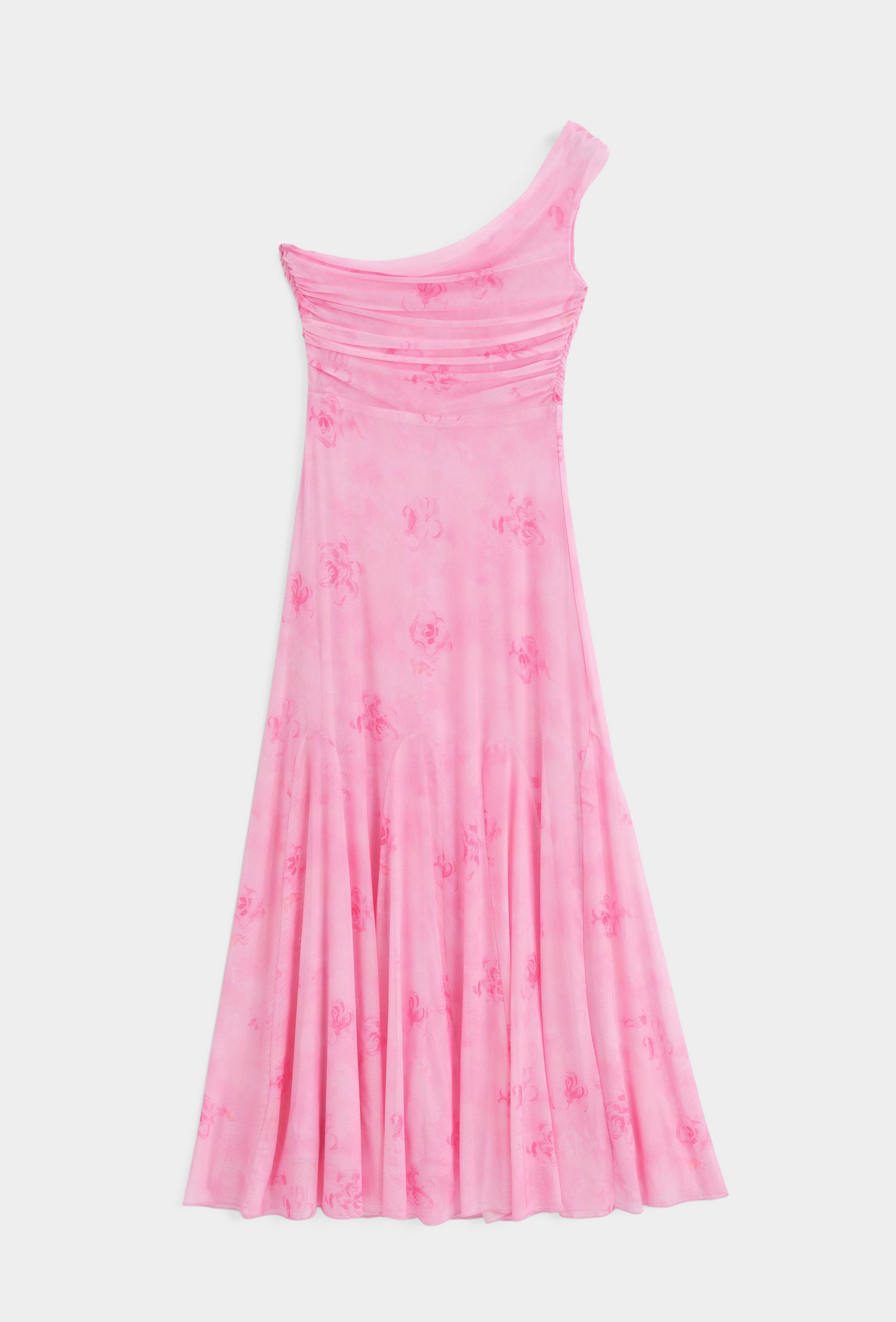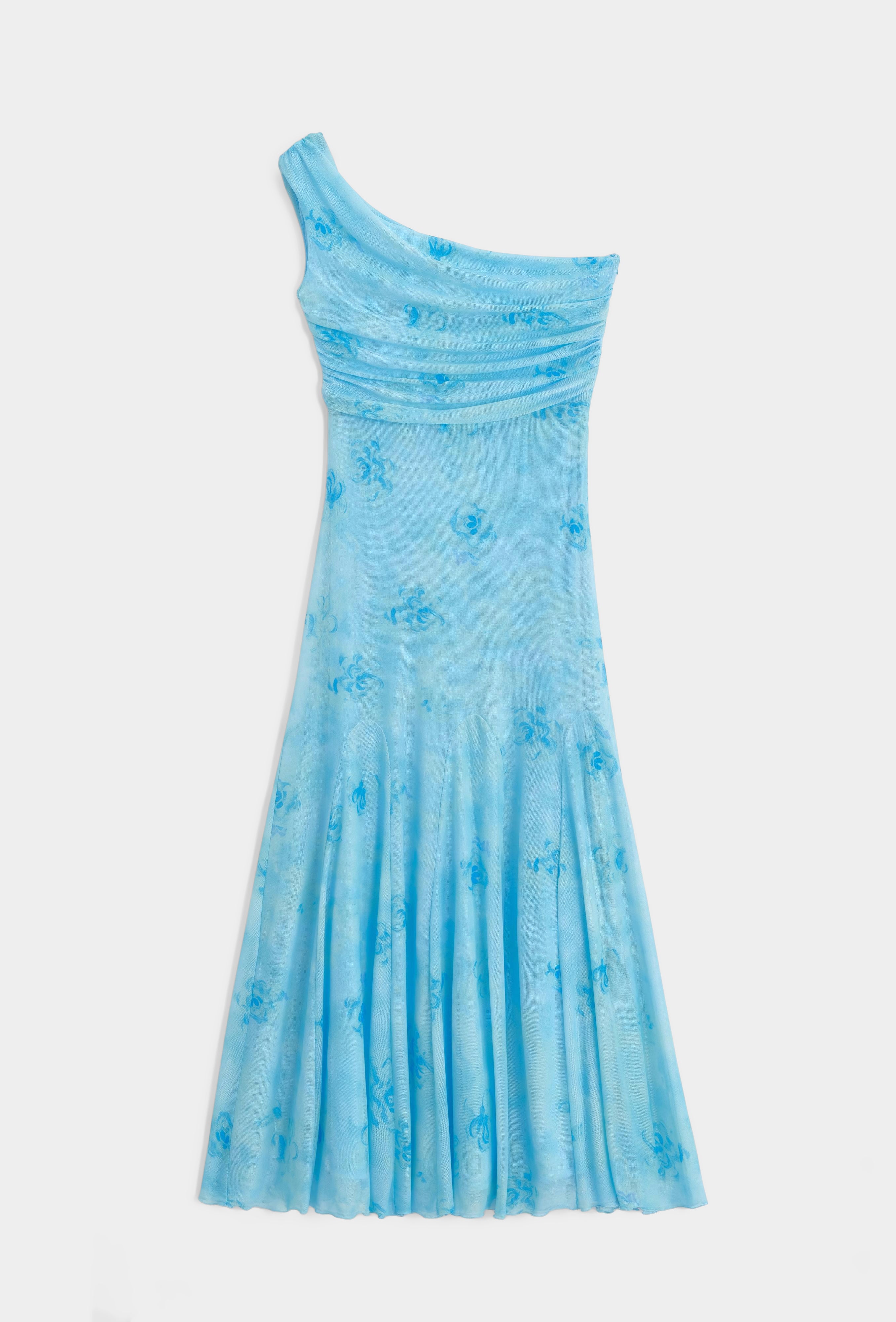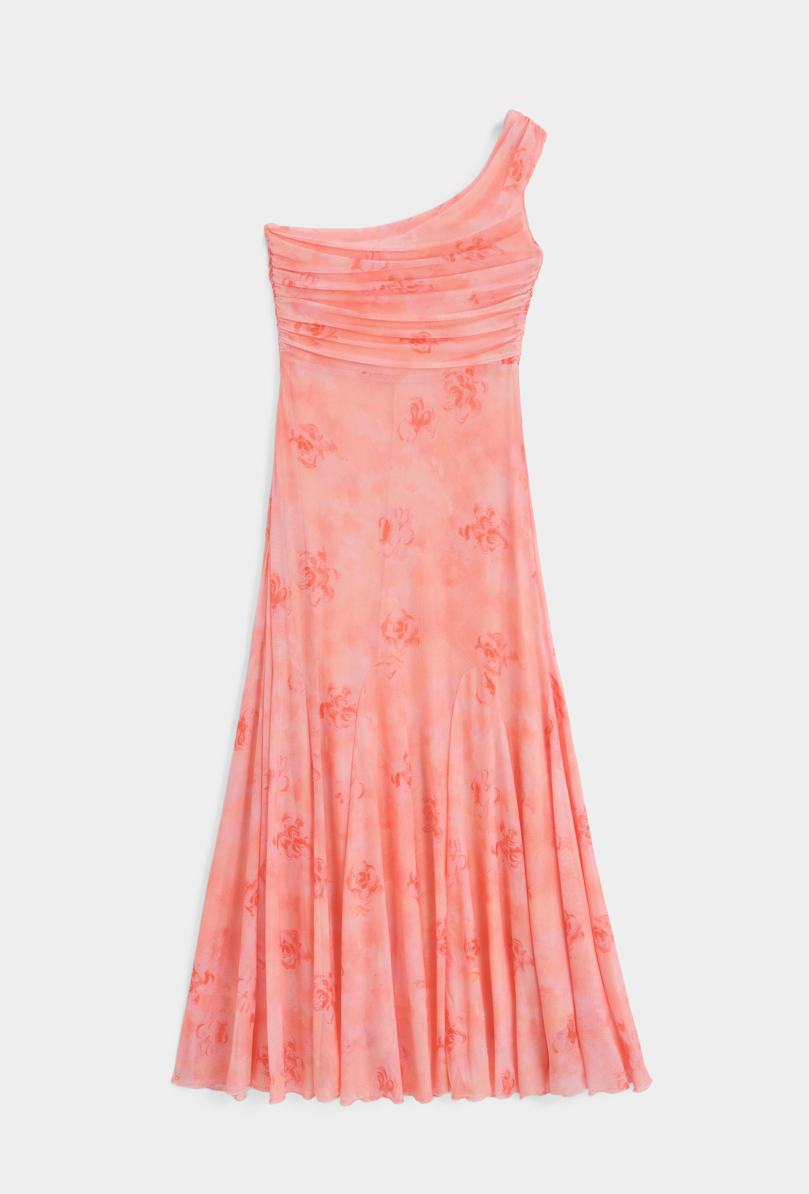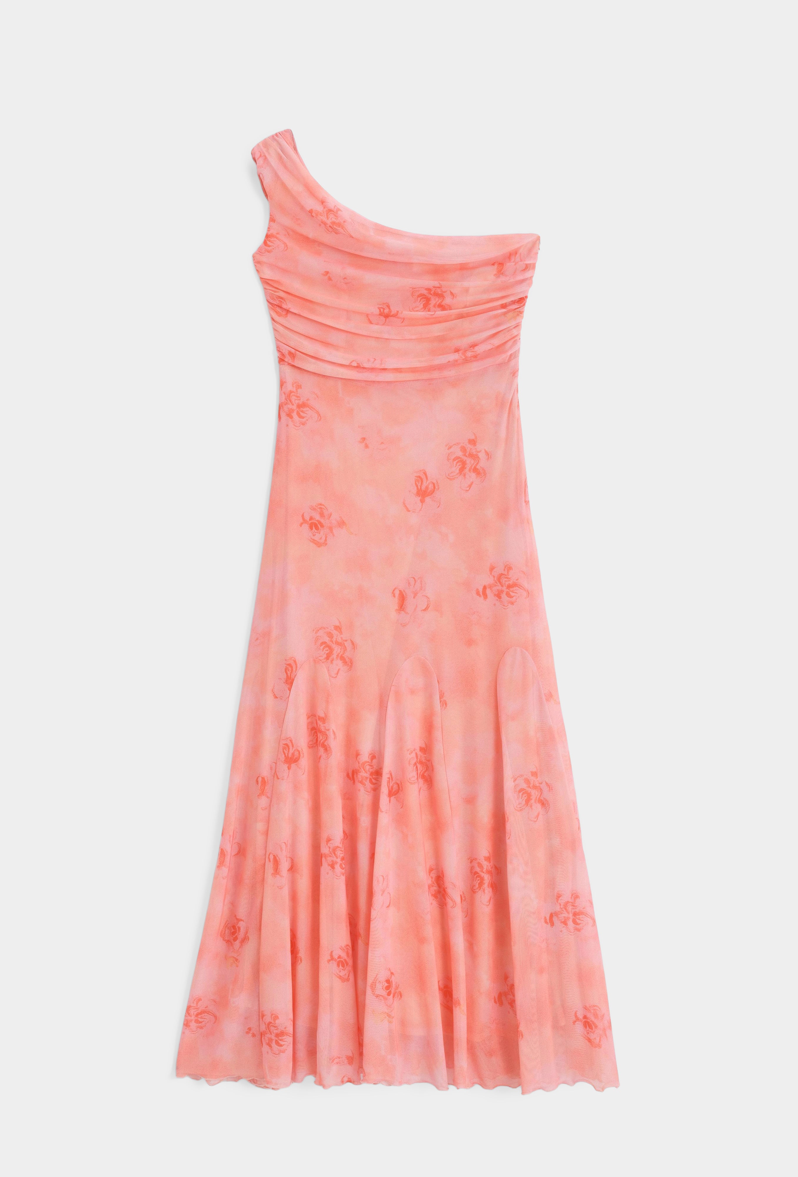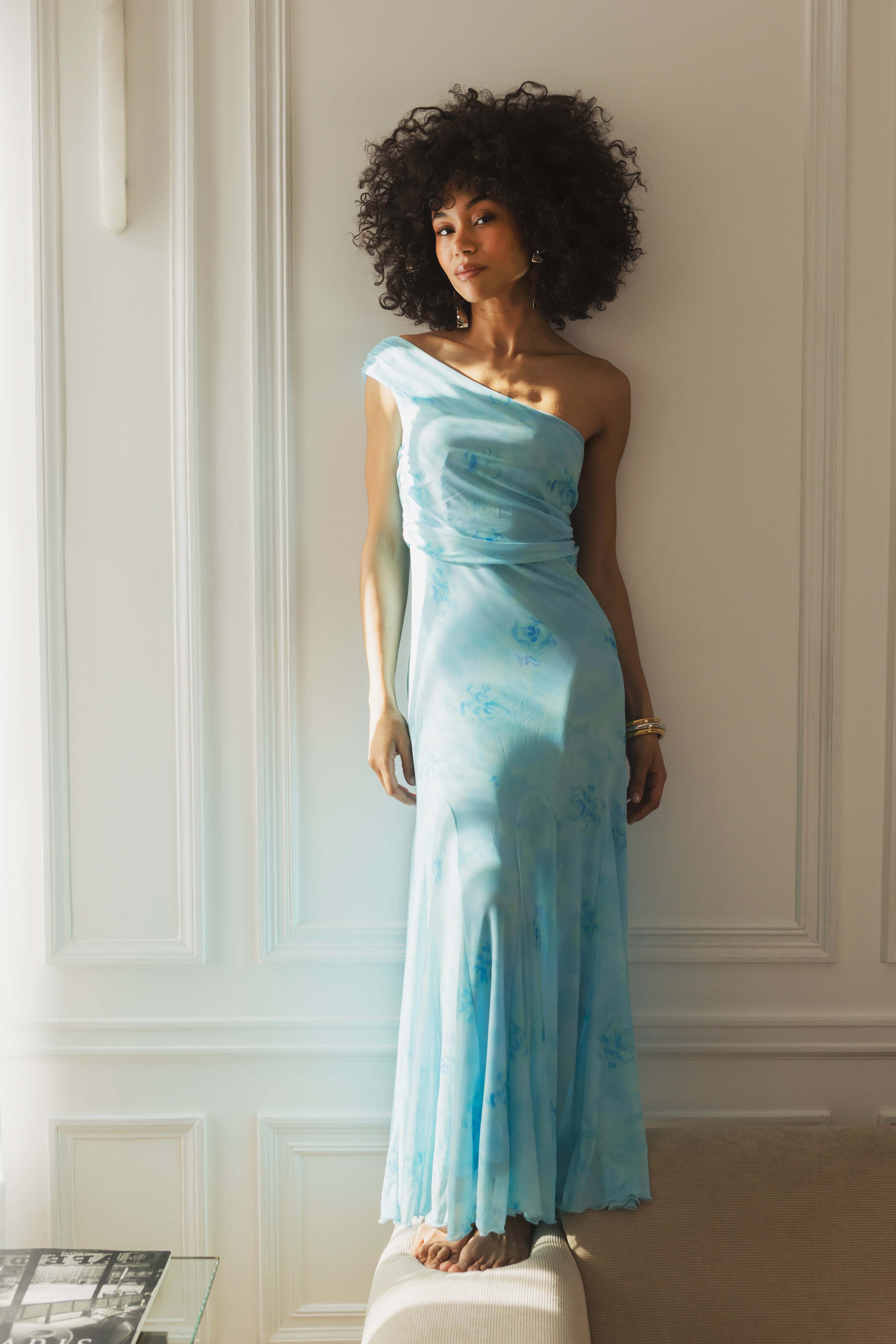 Robe maxi coupe one-shoulder avec bandeau drapé sur l'épaule. Jupe coupe sirène s'évasant au bas grâce à des godets insérés. Fermeture zippée invisible sur le côté. Entièrement doublée.
